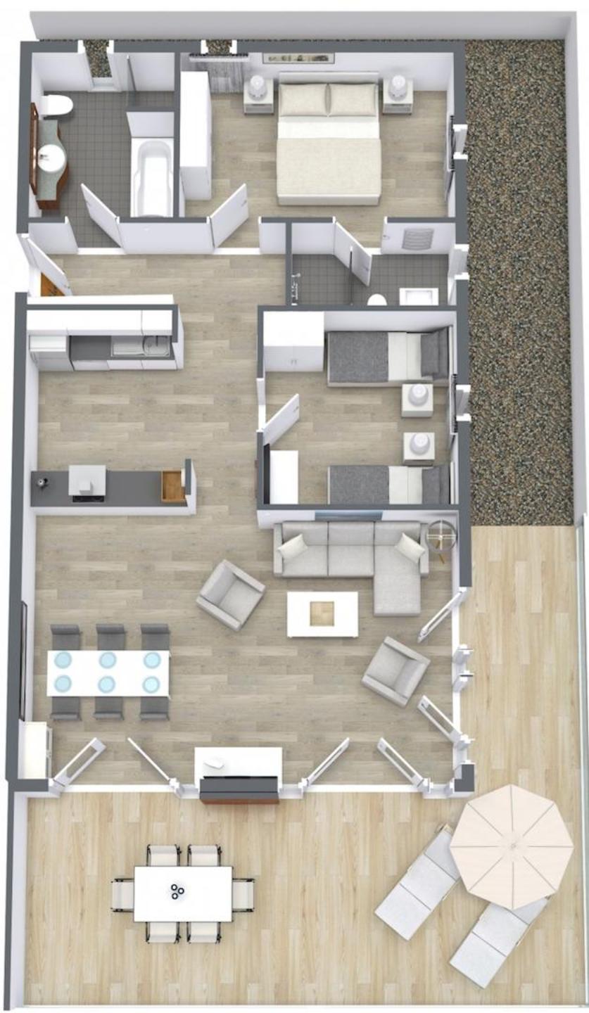 Mit einem Wohnzimmer, zwei Schlafzimmern, zwei Badezimmern, offener Küche und einer nach Süden ausgerichteten Dachterrasse beeindruckt die 94 qm große Ferienwohnung mit einem großzügigen Wohngefühl.