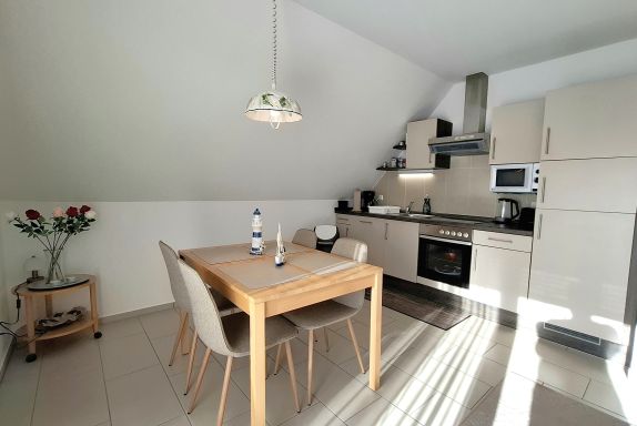 Die offene Küche ist mit Cerankochfeld, Backofen, Geschirrspüler, Kühlschrankgefrier- Kombination, Mikrowelle, Kaffeemaschine, Wasserkocher und Toaster ausgestattet und es wird Ihnen eine Erstausstattung mit Spülmittel, Schwamm, Tuch, Geschirrtuch und Spülmaschinentabs, Kaffee und Kaffeefilter bereitgestellt.