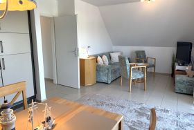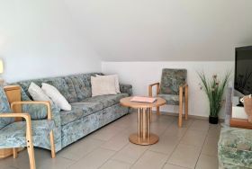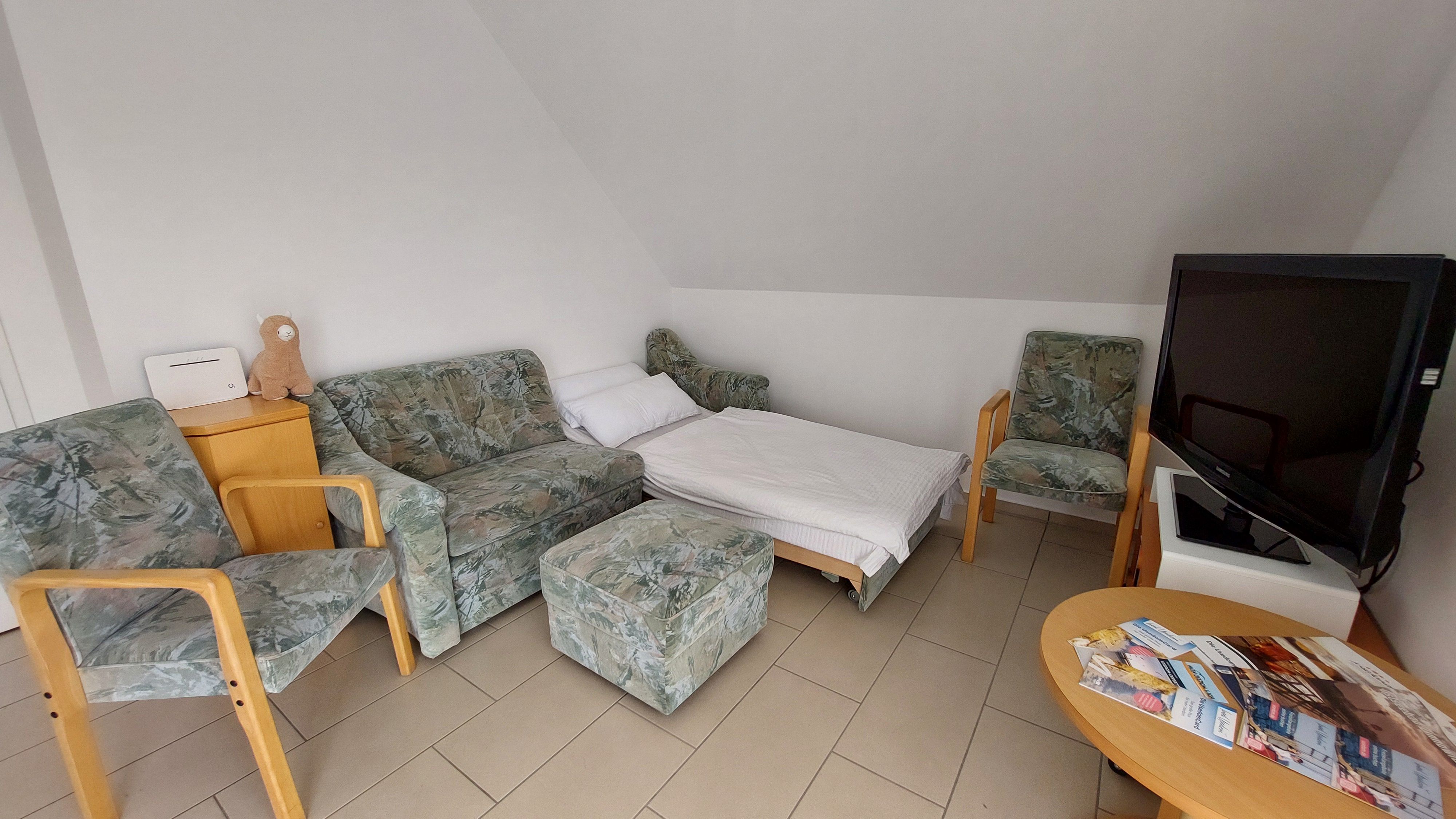 Die gemütliche 2-Raum-Ferienwohnung mit Balkon und ist 52qm groß. Der großzügige Wohnbereich erwartet Sie mit einem Esstisch, Flat-TV sowie einem großen Sofa (Aufbettungsmöglichkeit für 2 Personen/Liegefläche 1,80x2,00m), welches durch extra Matratzenauflage besonderen Schlafkomfort bietet.