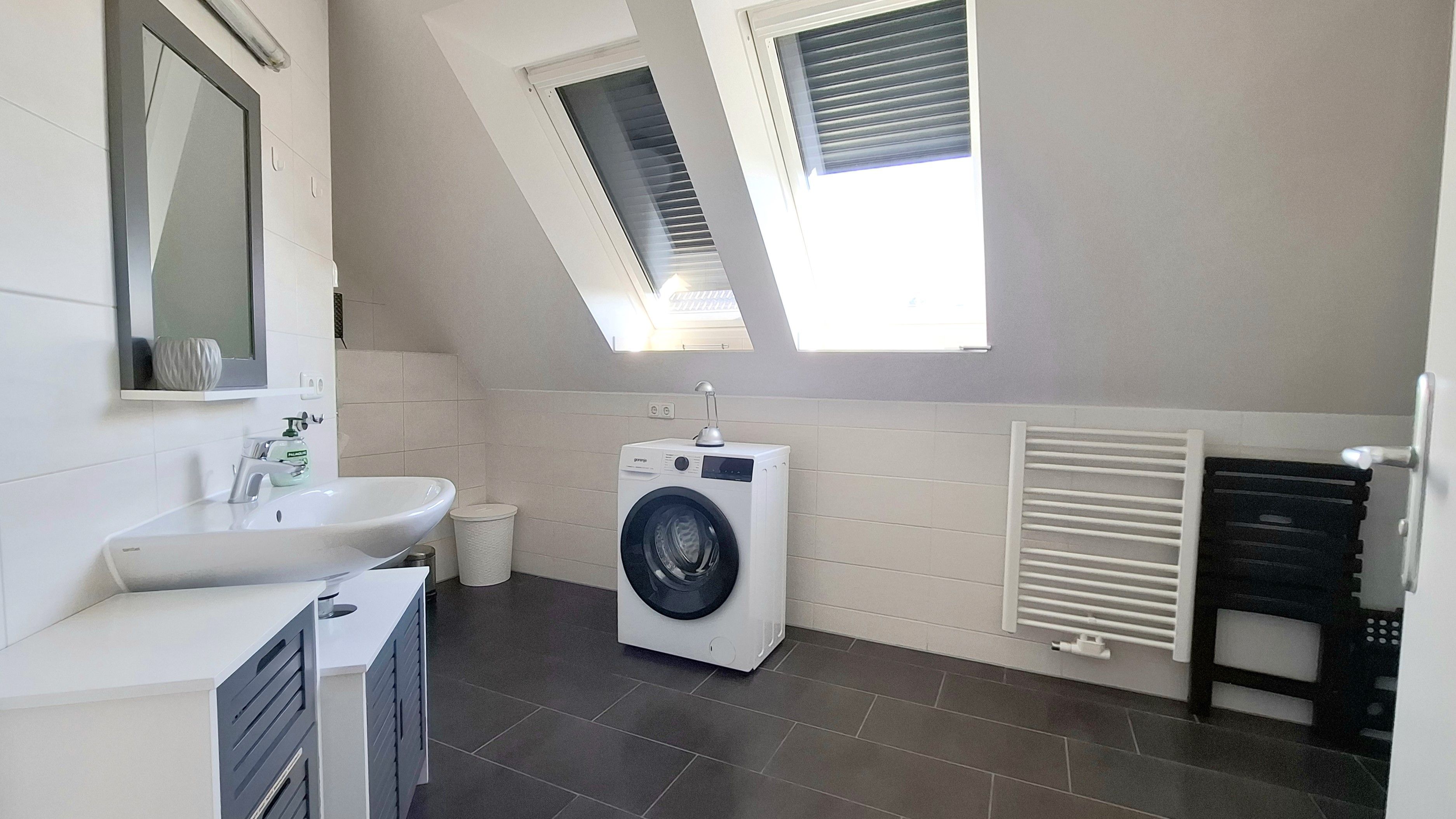 Das moderne Badezimmer ist mit Dusche/WC, Haartrockner und Waschmaschine ausgestattet. Wäscheständer sowie Bügeleisen stehen Ihnen ebenfalls zur Verfügung.