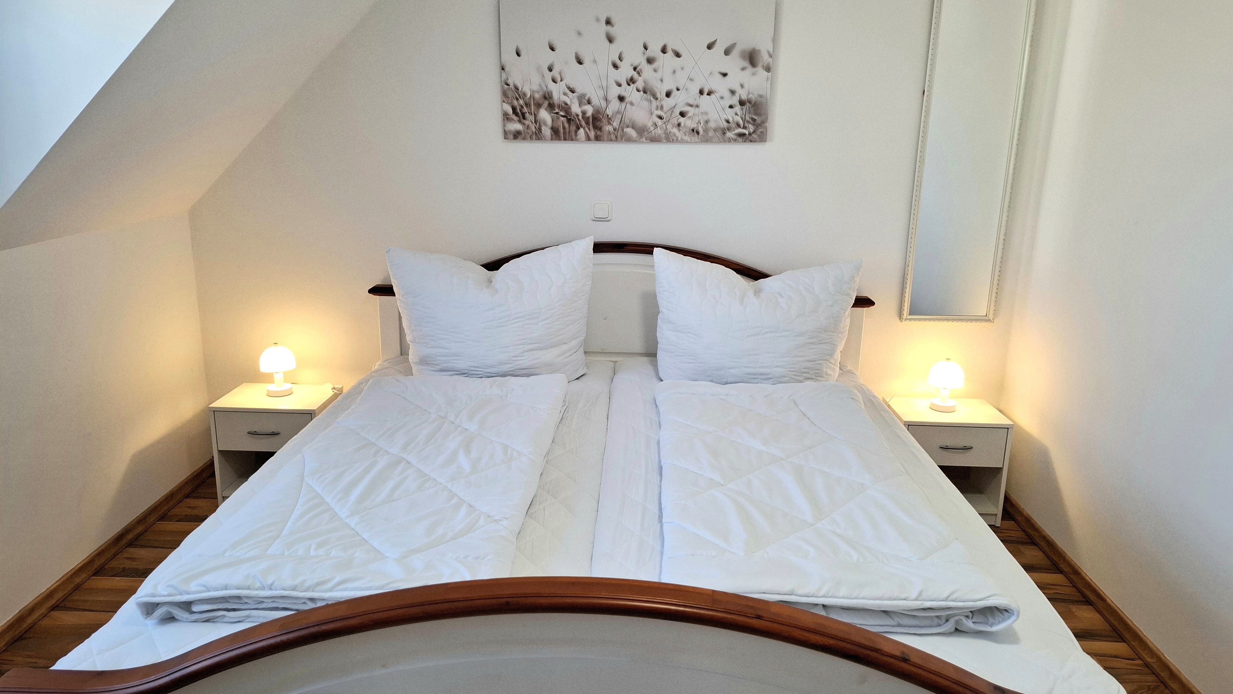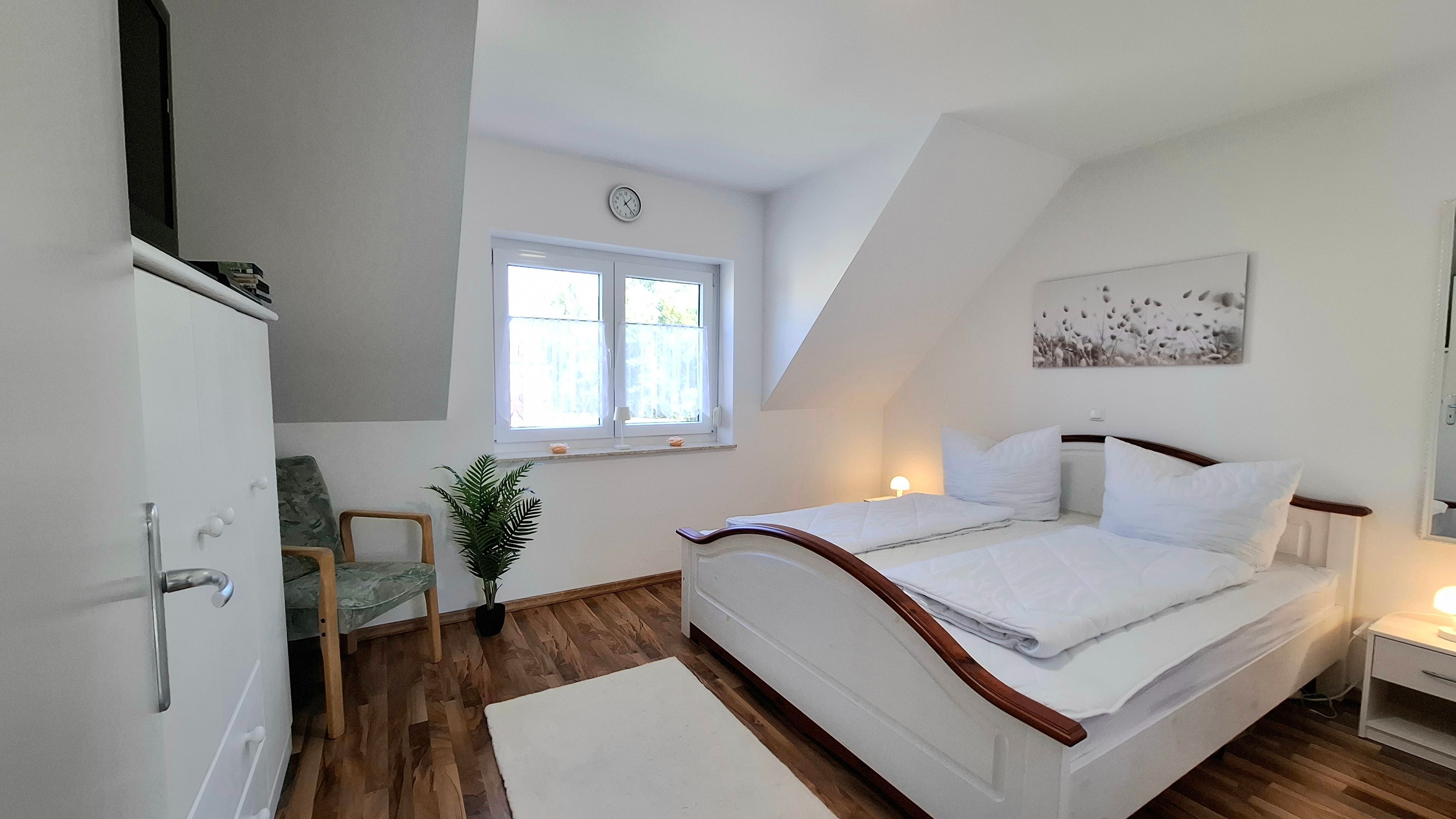 Das separate Schlafzimmer verfügt über ein Doppelbett (1,80x2,00m), mit neuen Matratzen (Härtegrad 3), einen Kleiderschrank für Ihre Urlaubsgarderobe und einen zweiten SAT-TV mit DVD-Player.