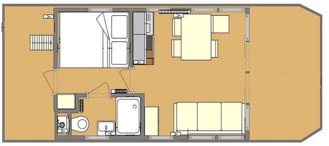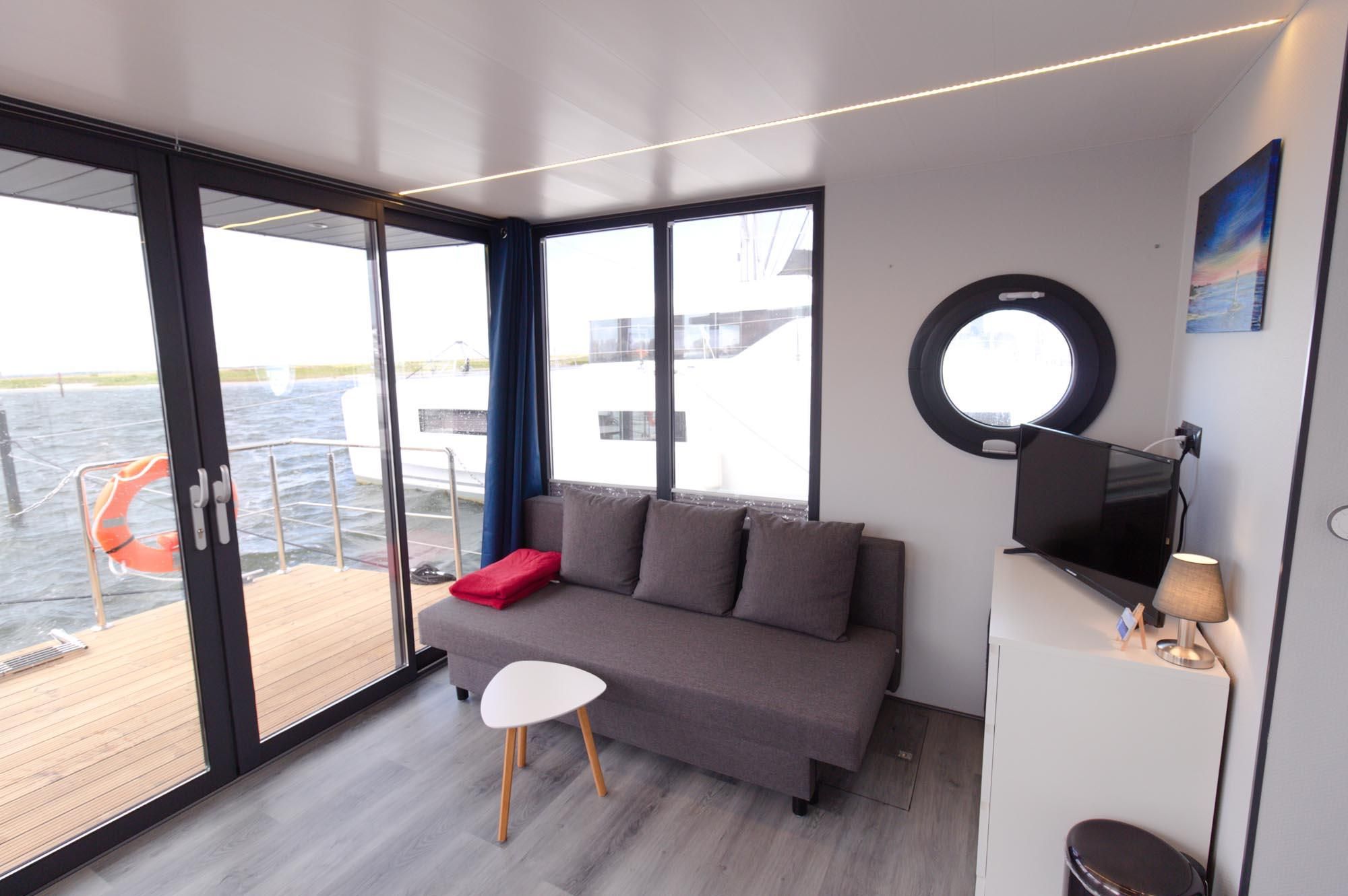 Das Hausboot verfügt über einen Wohnraum mit Fußbodenheizung für kalte Tage, ein Schlafzimmer mit Doppelbett und ein modernes Duschbad. Zwei weitere Schlafplätze befinden sich auf der ausziehbaren Couch im Wohnbereich – bitte beachten Sie, dass der Platz hier begrenzt ist. Ausreichend Stauraum bieten die Schränke und Schubladen unter dem Bett. Bettwäsche ist obligatorisch und kann entweder mitgebracht oder bei uns gebucht werden.