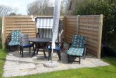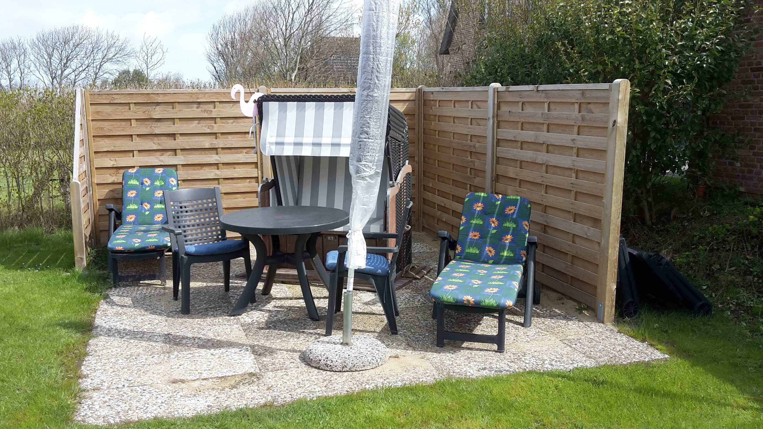 Zu jeder Fewo gehört eine Terrasse mit Strandkorb und Gartenmöbeln.