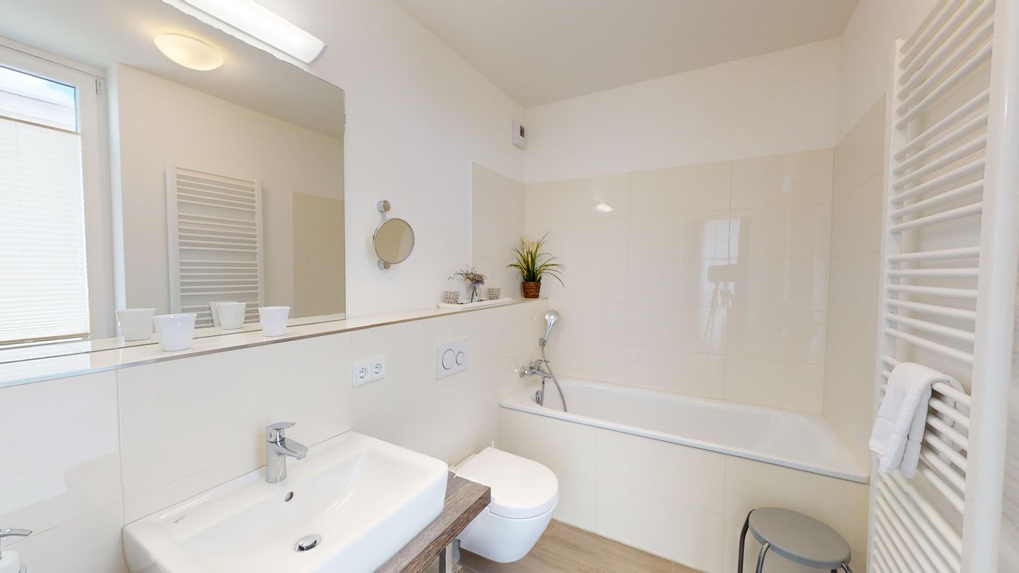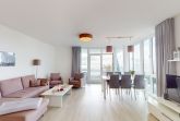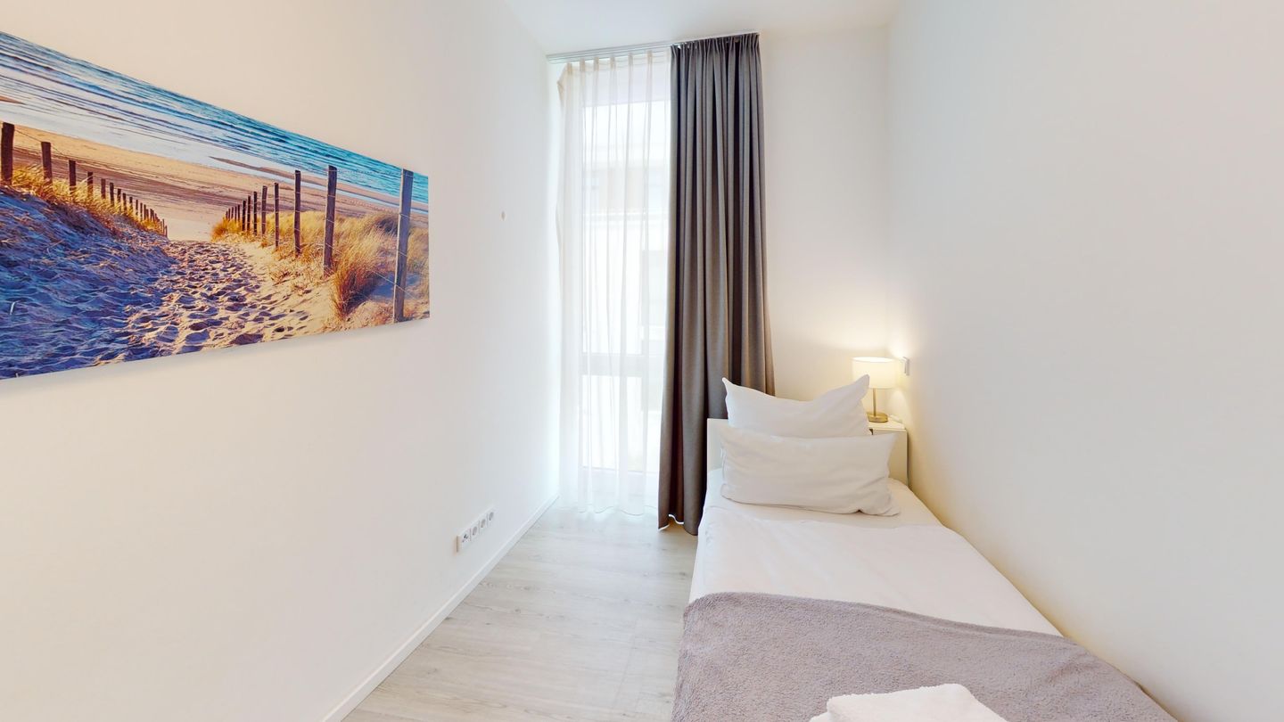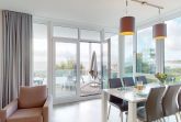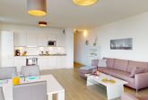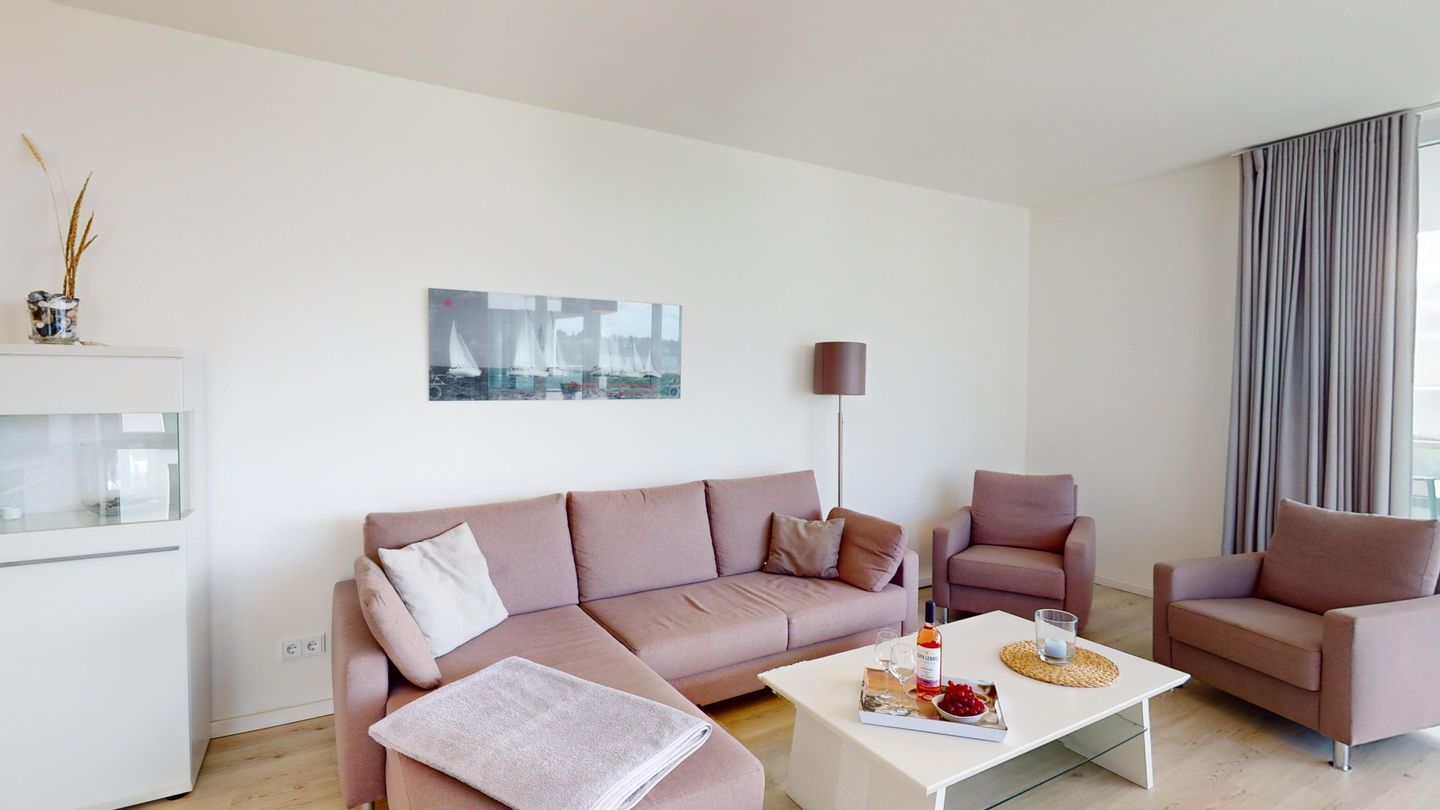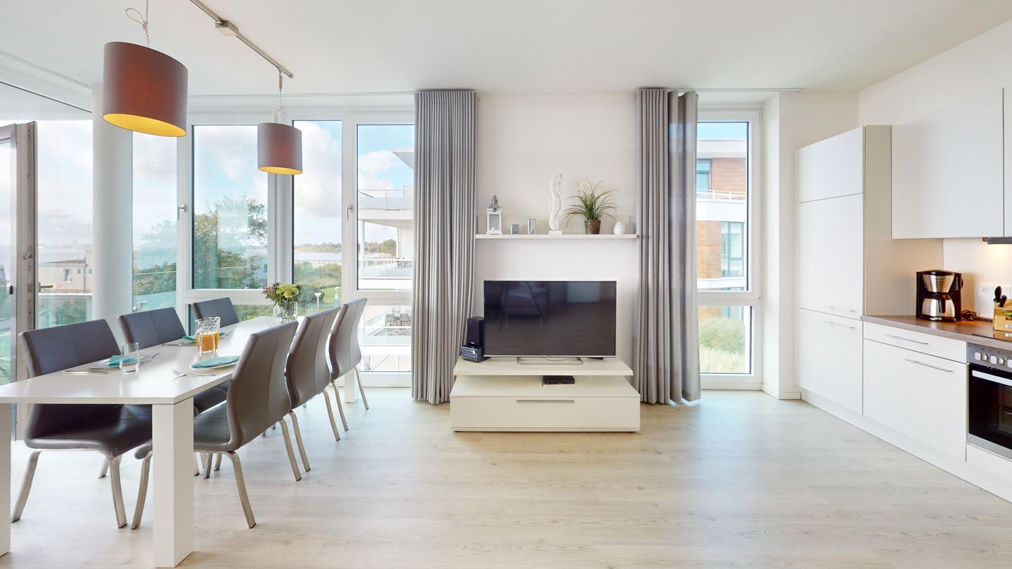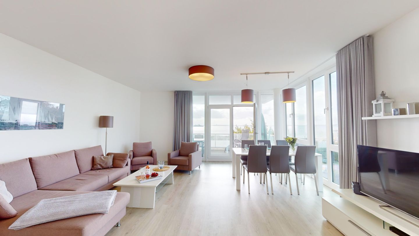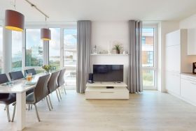 Die 4-Zimmer-Wohnung im zweiten Obergeschoss ist mit 99 m² für sechs Personen ausgerichtet. Im großen Wohnzimmer mit Küchenzeile genießen Sie Ihre Mahlzeiten, sowie Kaffee aus der Nespresso-Maschine und können gesellschaftliche Abende verbringen. Drei Schlafzimmer für je zwei Personen, dazu zwei Bäder (je eines mit Dusche und eines mit Badewanne) bieten größtmöglichen Komfort. Zwei der Schlafzimmer sind mit einem komfortablen Boxspringbett ausgestattet, das dritte Schlafzimmer verfügt über ein Einzelbett und ein ausziehbares Kojenbett. Vom Balkon haben Sie den perfekten Meerblick über die Lübecker Bucht.