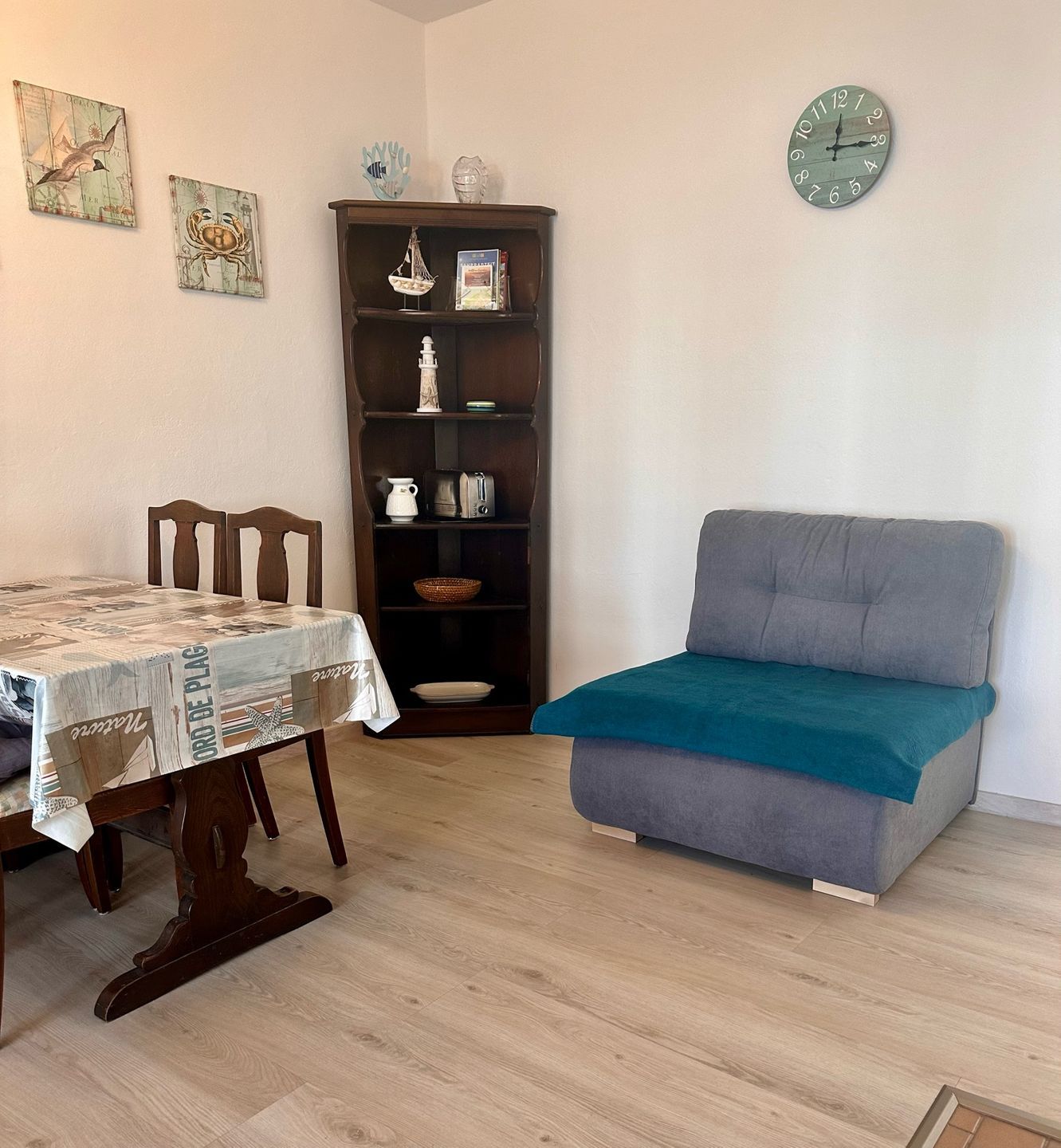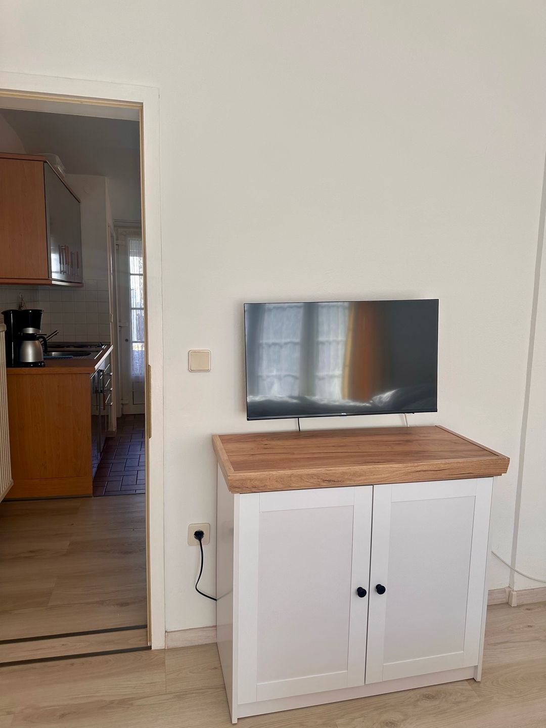 Die Wohnung verfügt über eine Wohnküche mit Schlafsessel ( 90 x 200 cm) und einer Verdunklungsmöglichkeit inkl. einer Essecke mit einer Küchenzeile mit 2-Plattenherd, Kühlschrank, Wasserkocher, Toaster, Mini-Backofen und Kaffeemaschine.