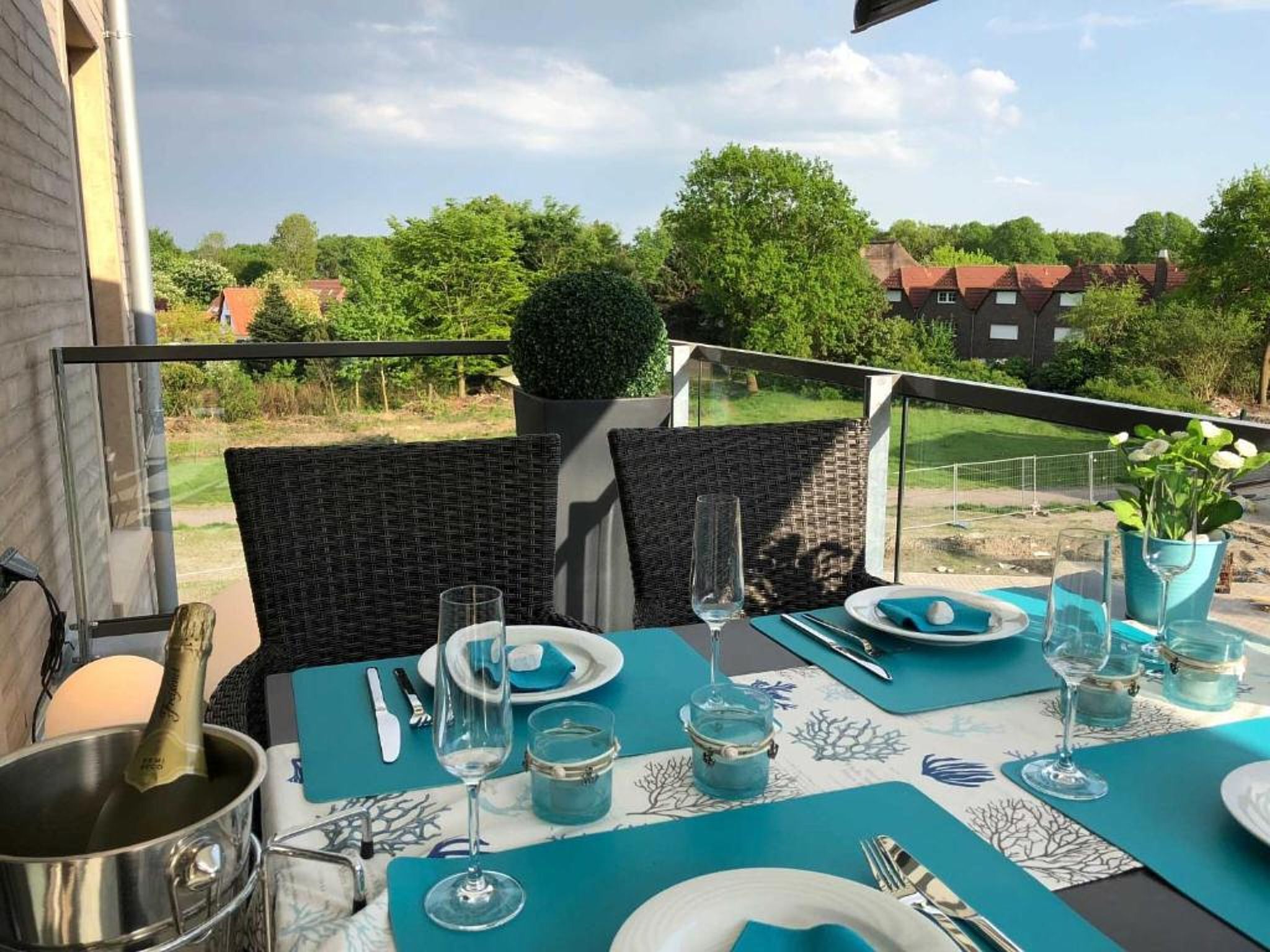 Südbalkon mit hochwertigem Mobiliar und Elektromarkise