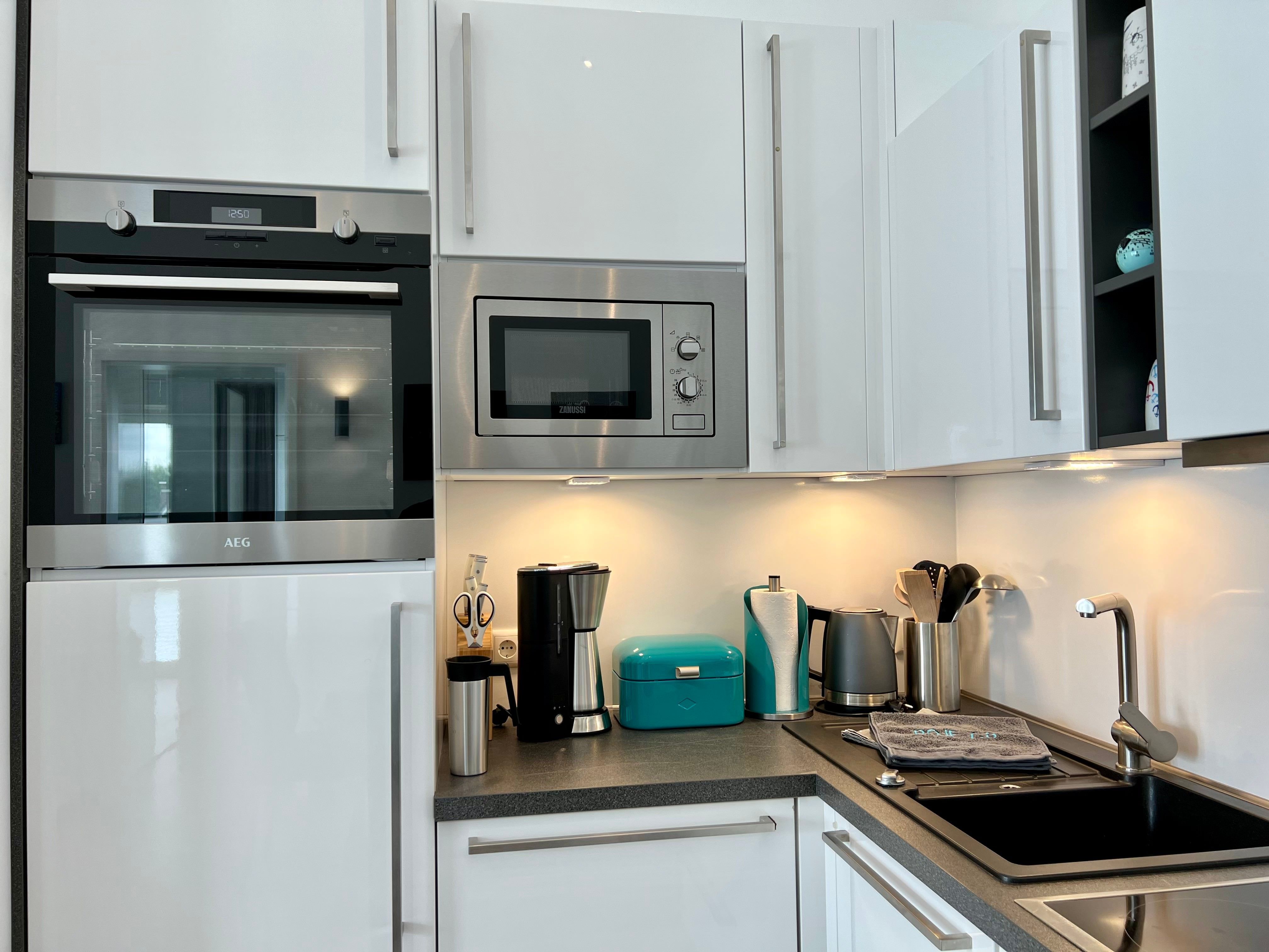 moderne Küchenzeile mit Spülmaschine, Kühlschrank, Herd, Mikrowelle,