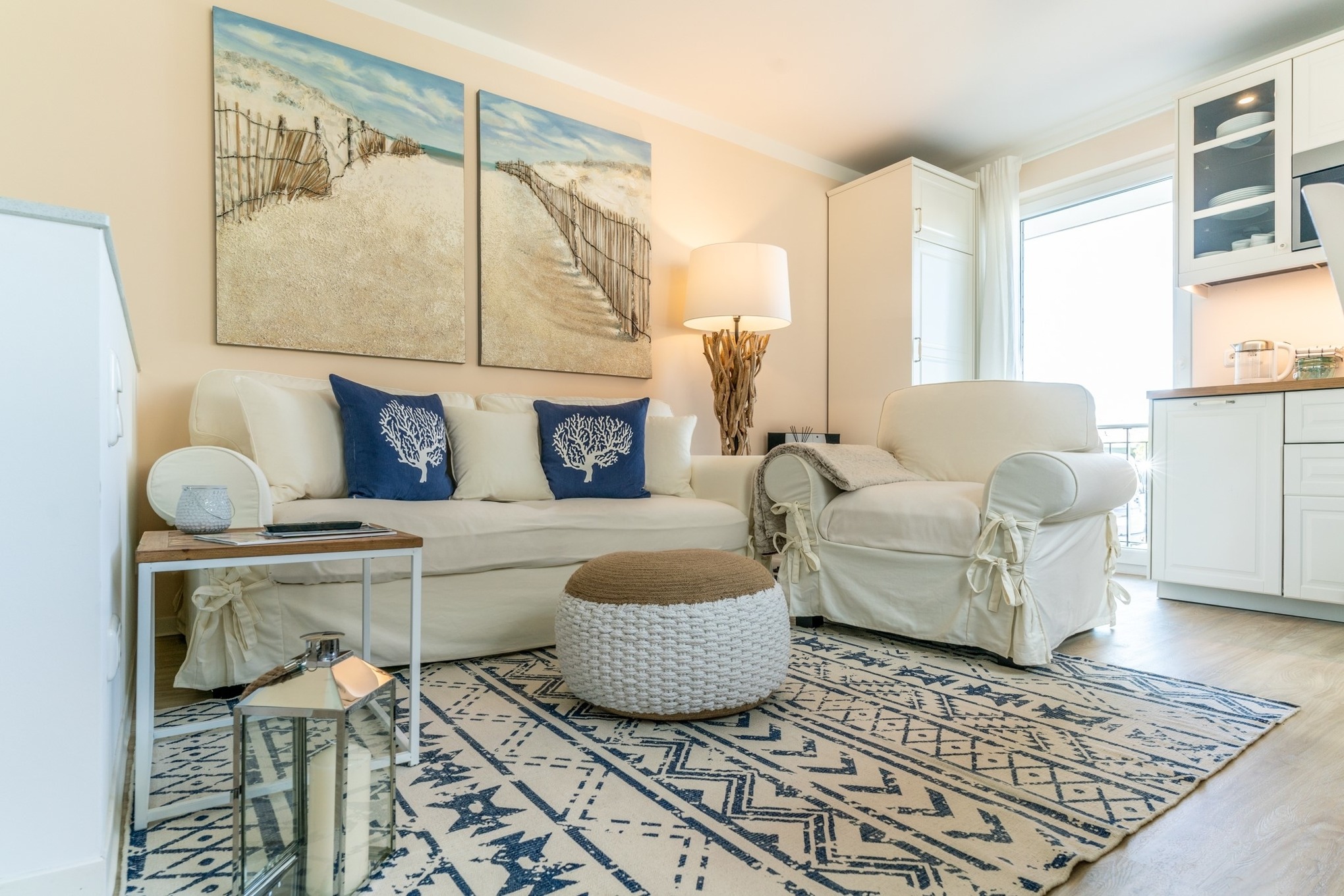 Im Wohnzimmer bieten Sofa und Sessel bequemen Sitzkomfort. Ebenso der Esstisch, der in einladender Position direkt vor der großen Fensterfront, ausreichend Platz für vier Personen bietet. Der großzügig ausgelegte und überdachte Balkon erscheint durch seinen Holzfußboden sehr wohnlich.