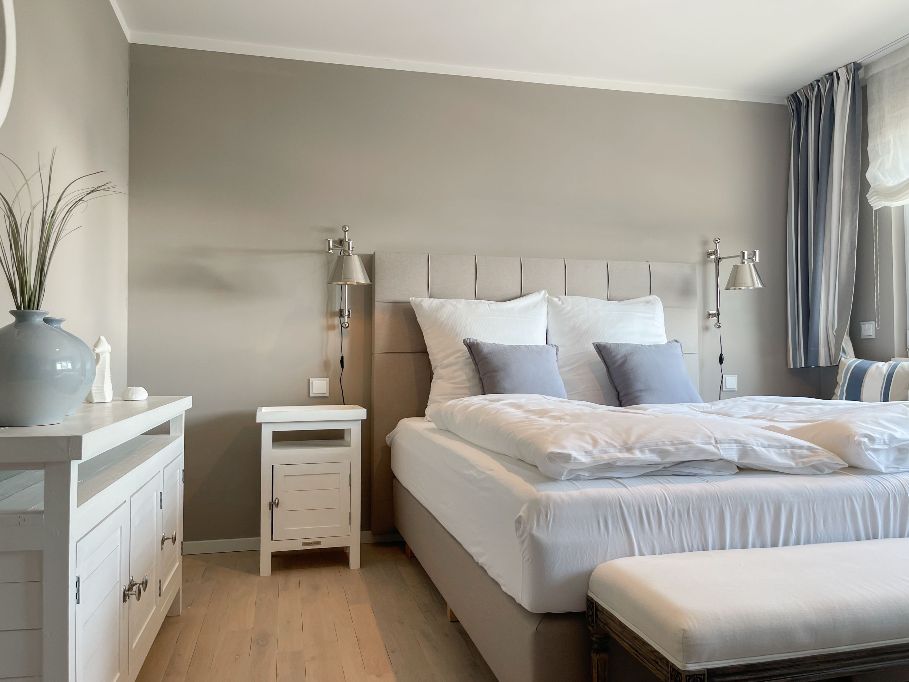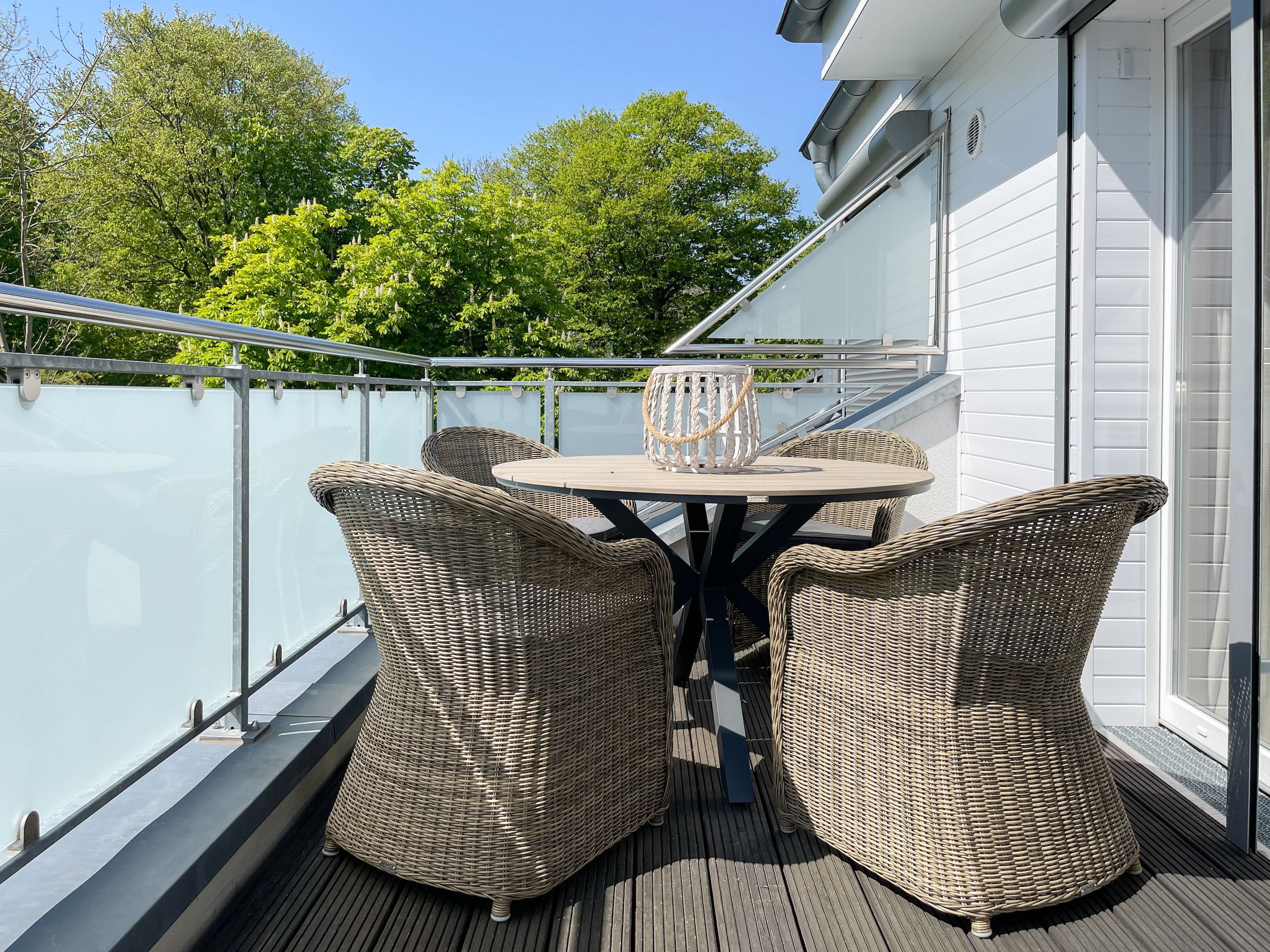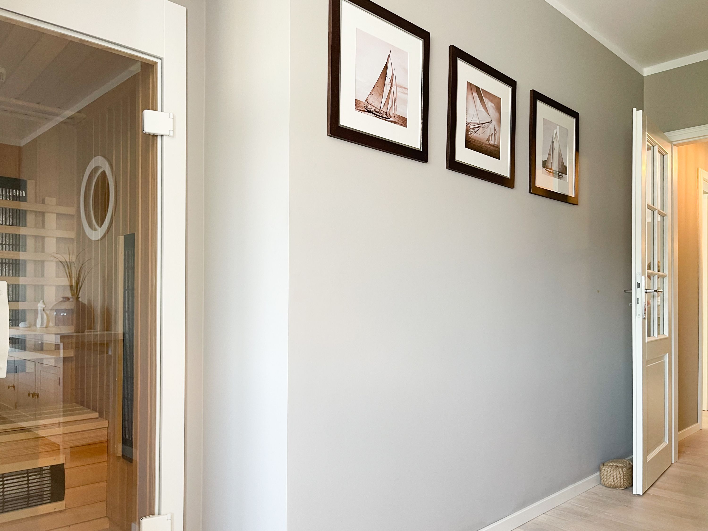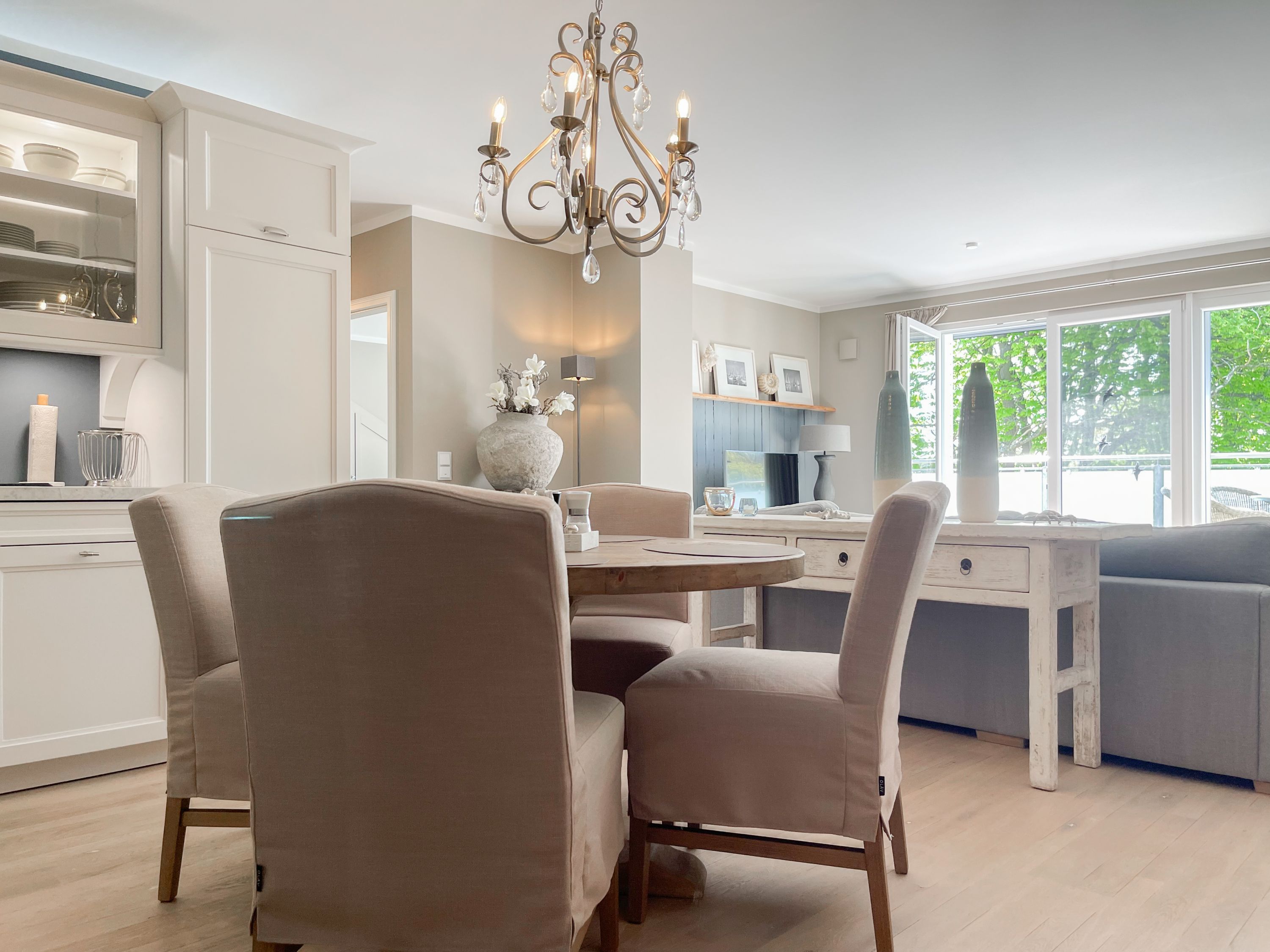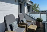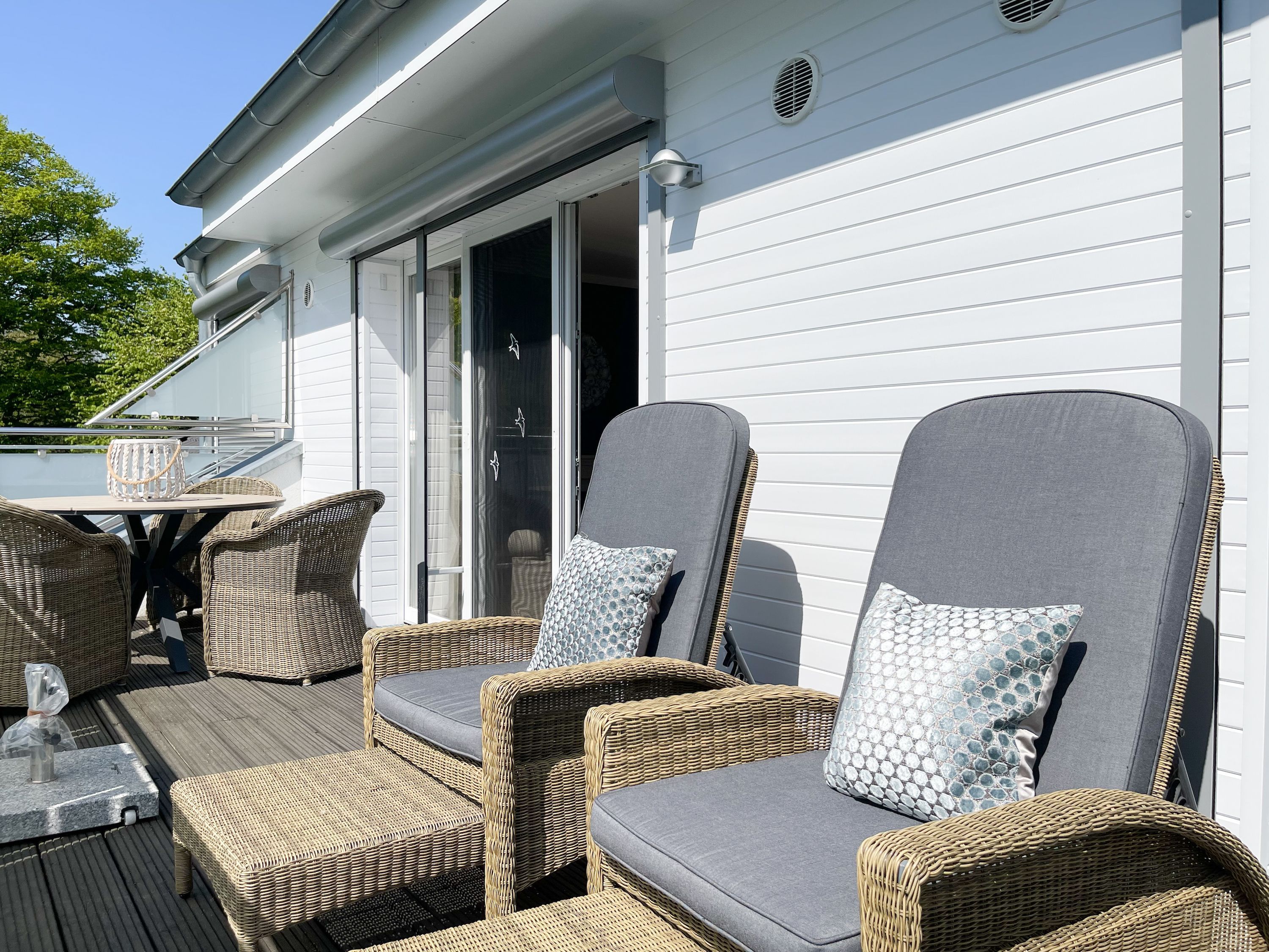 Das Penthouse „Maison Plage” bietet Ihnen zeitgemäßen Luxus im Hampton Style auf über 100 m² Wohnfläche und jeglichen Komfort, den Sie sich wünschen können. Dazu gehören Fußbodenheizung, elektrische Außenjalousien, Echtholzböden, Insektenschutz und Sauna. Mit zwei Schlafzimmern und zwei Bädern ist es perfekt für vier Personen geeignet, um einen entspannten Ostseeurlaub in Strandnähe zu verleben. Die äußerst geschmackvolle Einrichtung und hochwertige Ausstattung garantiert höchsten Wohnstandard in wunderschönem Ambiente. Es erwartet Sie ein gemütlicher Wohnbereich mit einem XL-Sofa; TV, Radio und WLAN sind selbstverständlich vorhanden. Die vorgelagerte Dachterrasse in Südausrichtung bietet Ihnen einen herrlichen Blick bis auf die Ostsee und lockt mit frischer Seeluft, Gartenmöbeln und Sonnenliege ins Freie. Hobbyköche können sich in der perfekt ausgestatteten, offenen High-End-Küche austoben. Der anschließende Essbereich bietet ausreichend Platz für gemeinsame Mahlzeiten und gemütliches Beisammensein. Die beiden Schlafzimmer sind großzügig bemessen und mit Boxspringbetten und Einbauschränken eingerichtet. In einem Schlafzimmer ist eine Infrarotsauna eingebaut, die bestens gegen Verspannungen und zur Entschlackung wirkt. Im Schlafzimmer 2 gibt es einen Schreibtisch für das Home Office und einen weiteren Fernseher. Die liebevoll gestalteten Duschbäder verfügen über Handtuchtrockner, Fußbodenheizung, Dusch-WCs und Fön. Eines der Bäder ist zusätzlich mit einer Badewanne ausgestattet. Im Flurbereich befindet sich ein separater Hauswirtschaftsraum, in dem auch Waschmaschine und Trockner untergebracht sind.