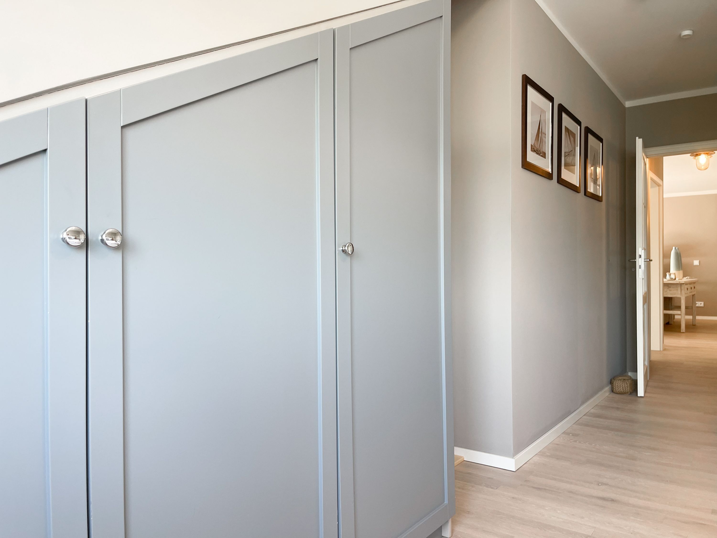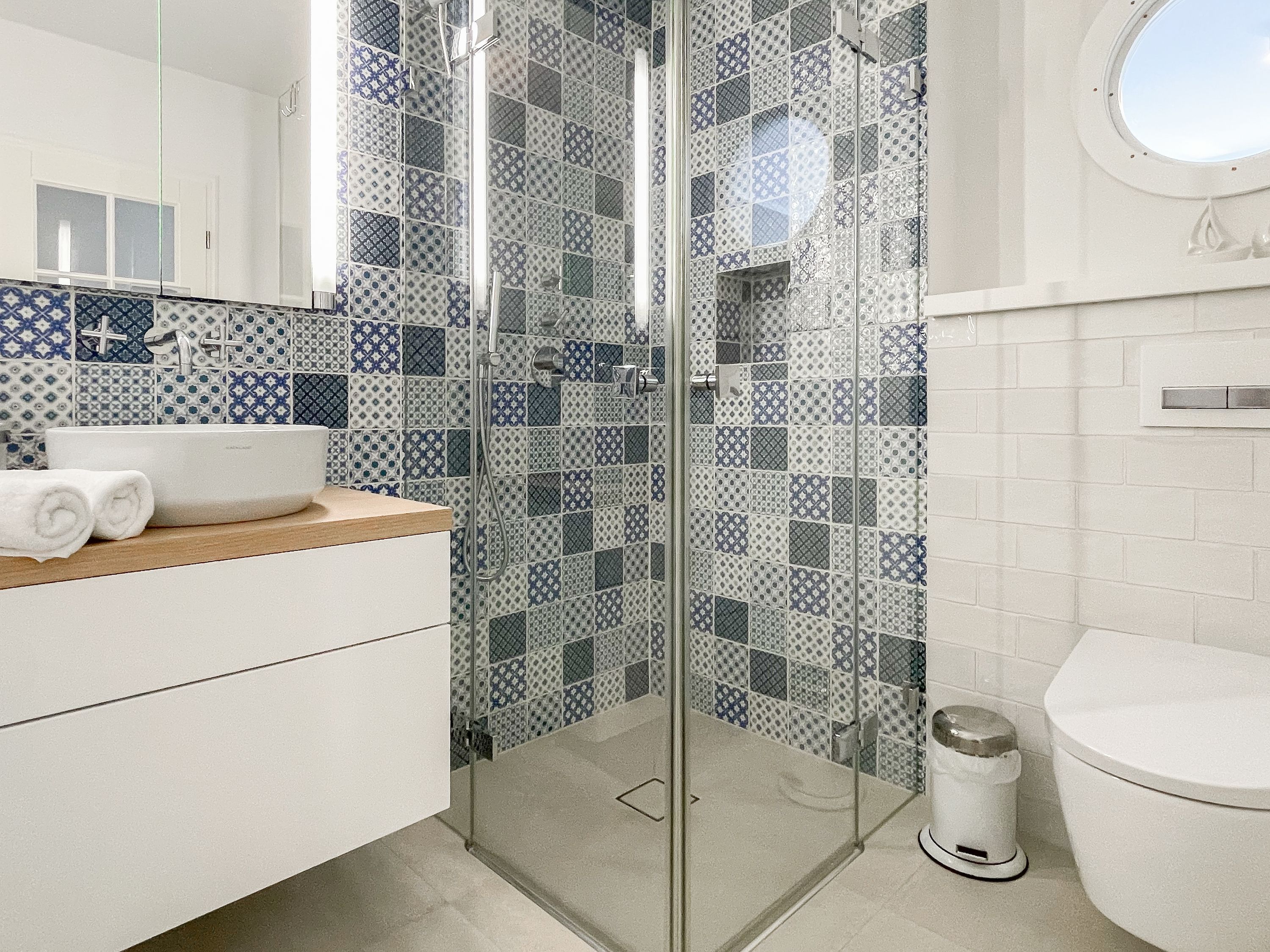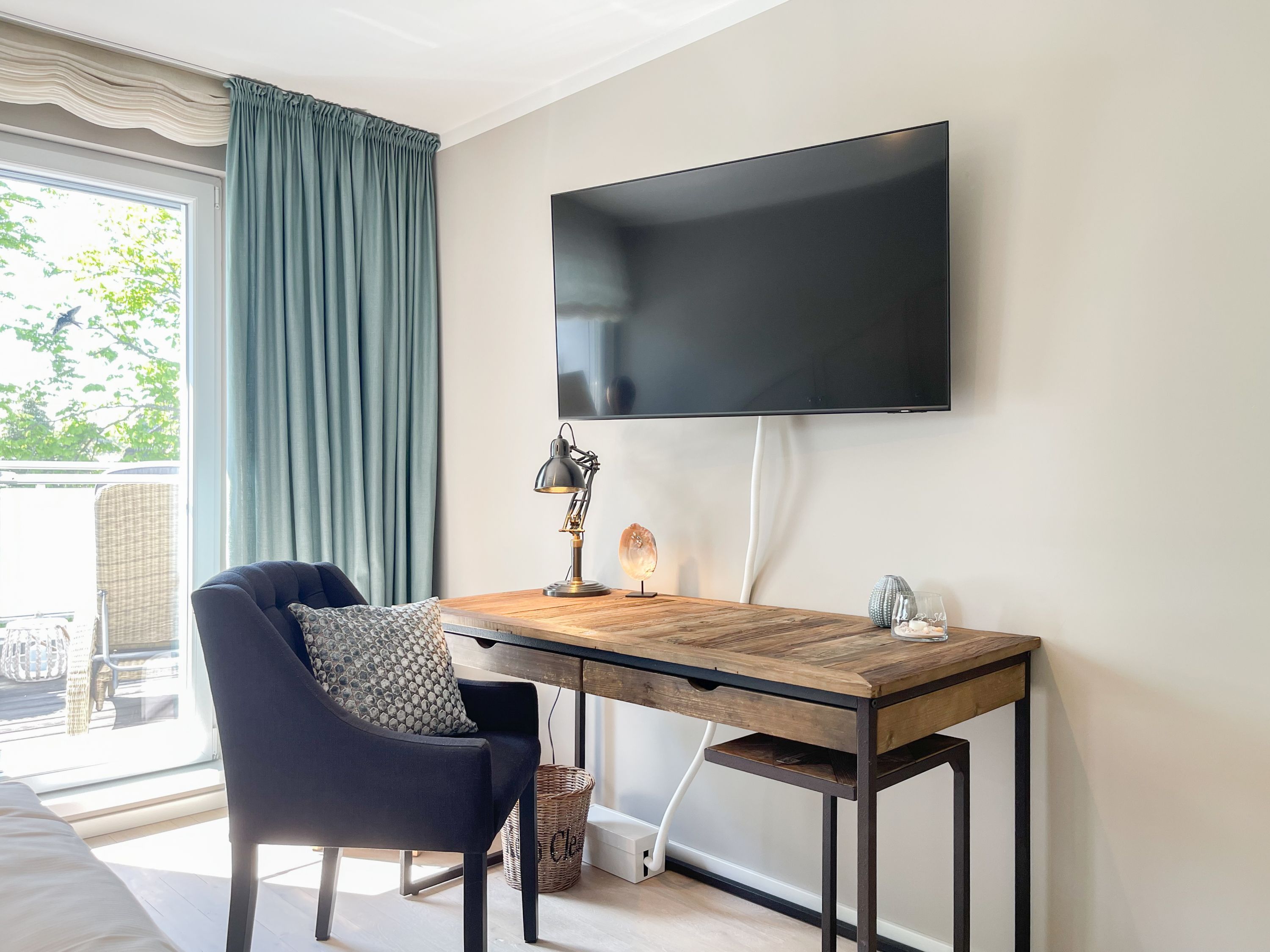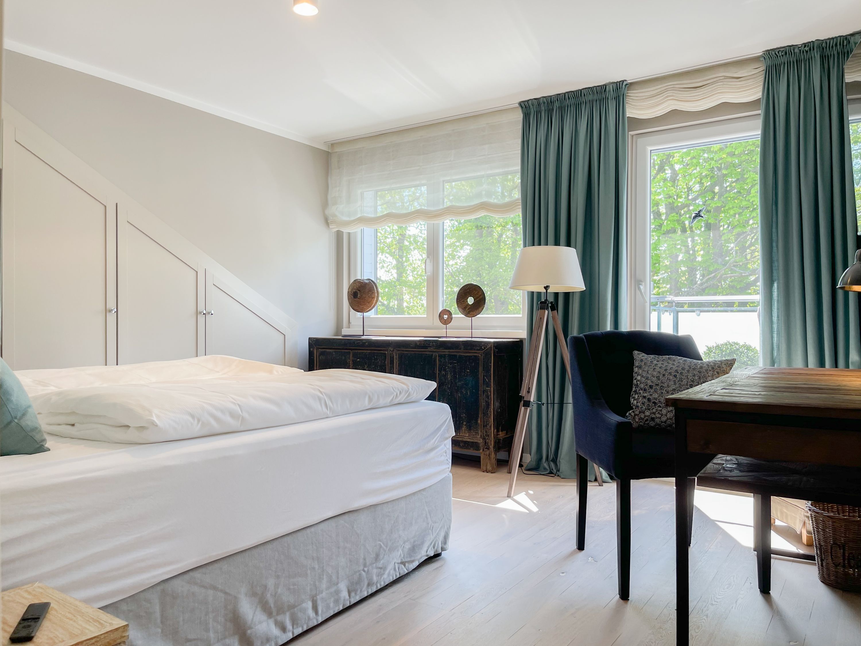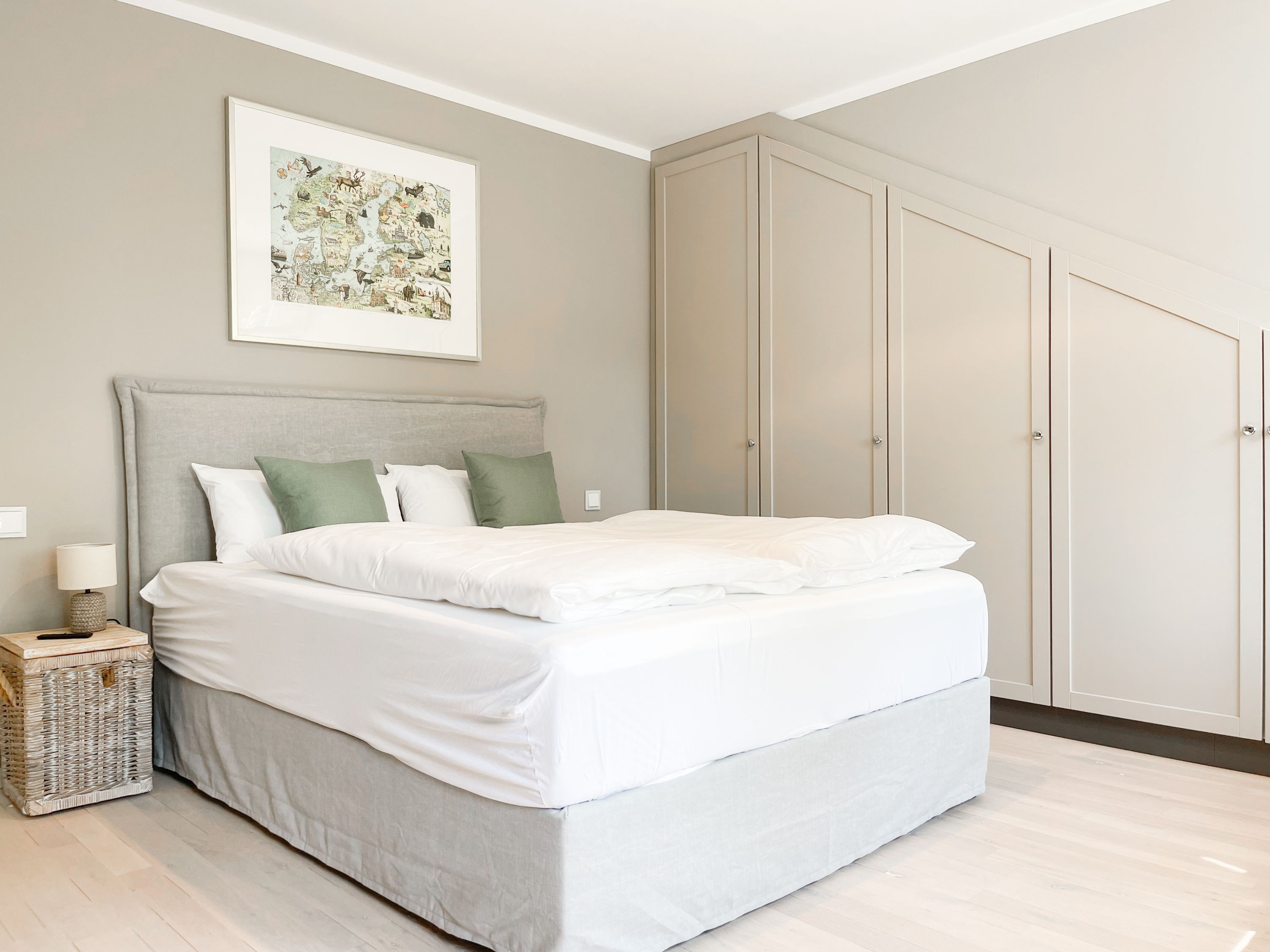 Das Penthouse „Maison Plage” bietet Ihnen zeitgemäßen Luxus im Hampton Style auf über 100 m² Wohnfläche und jeglichen Komfort, den Sie sich wünschen können. Dazu gehören Fußbodenheizung, elektrische Außenjalousien, Echtholzböden, Insektenschutz und Sauna. Mit zwei Schlafzimmern und zwei Bädern ist es perfekt für vier Personen geeignet, um einen entspannten Ostseeurlaub in Strandnähe zu verleben. Die äußerst geschmackvolle Einrichtung und hochwertige Ausstattung garantiert höchsten Wohnstandard in wunderschönem Ambiente. Es erwartet Sie ein gemütlicher Wohnbereich mit einem XL-Sofa; TV, Radio und WLAN sind selbstverständlich vorhanden. Die vorgelagerte Dachterrasse in Südausrichtung bietet Ihnen einen herrlichen Blick bis auf die Ostsee und lockt mit frischer Seeluft, Gartenmöbeln und Sonnenliege ins Freie. Hobbyköche können sich in der perfekt ausgestatteten, offenen High-End-Küche austoben. Der anschließende Essbereich bietet ausreichend Platz für gemeinsame Mahlzeiten und gemütliches Beisammensein. Die beiden Schlafzimmer sind großzügig bemessen und mit Boxspringbetten und Einbauschränken eingerichtet. In einem Schlafzimmer ist eine Infrarotsauna eingebaut, die bestens gegen Verspannungen und zur Entschlackung wirkt. Im Schlafzimmer 2 gibt es einen Schreibtisch für das Home Office und einen weiteren Fernseher. Die liebevoll gestalteten Duschbäder verfügen über Handtuchtrockner, Fußbodenheizung, Dusch-WCs und Fön. Eines der Bäder ist zusätzlich mit einer Badewanne ausgestattet. Im Flurbereich befindet sich ein separater Hauswirtschaftsraum, in dem auch Waschmaschine und Trockner untergebracht sind.
