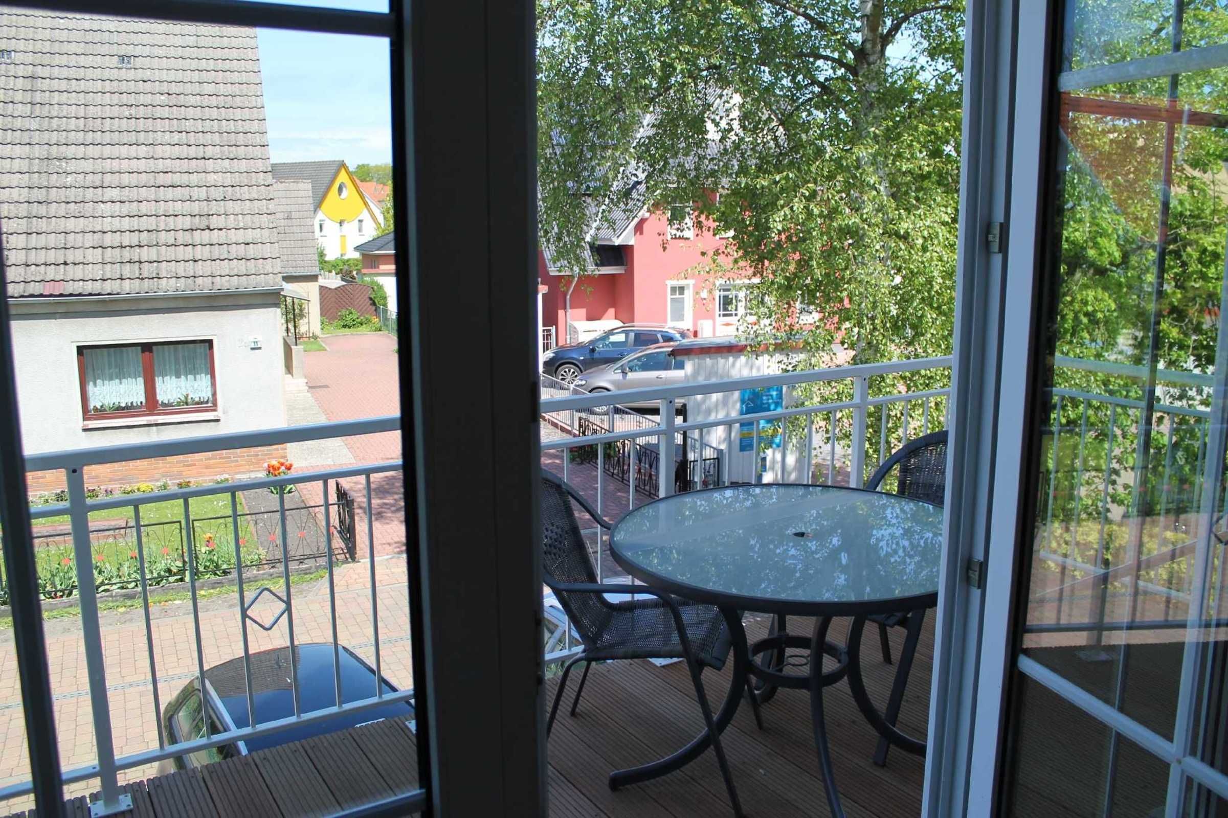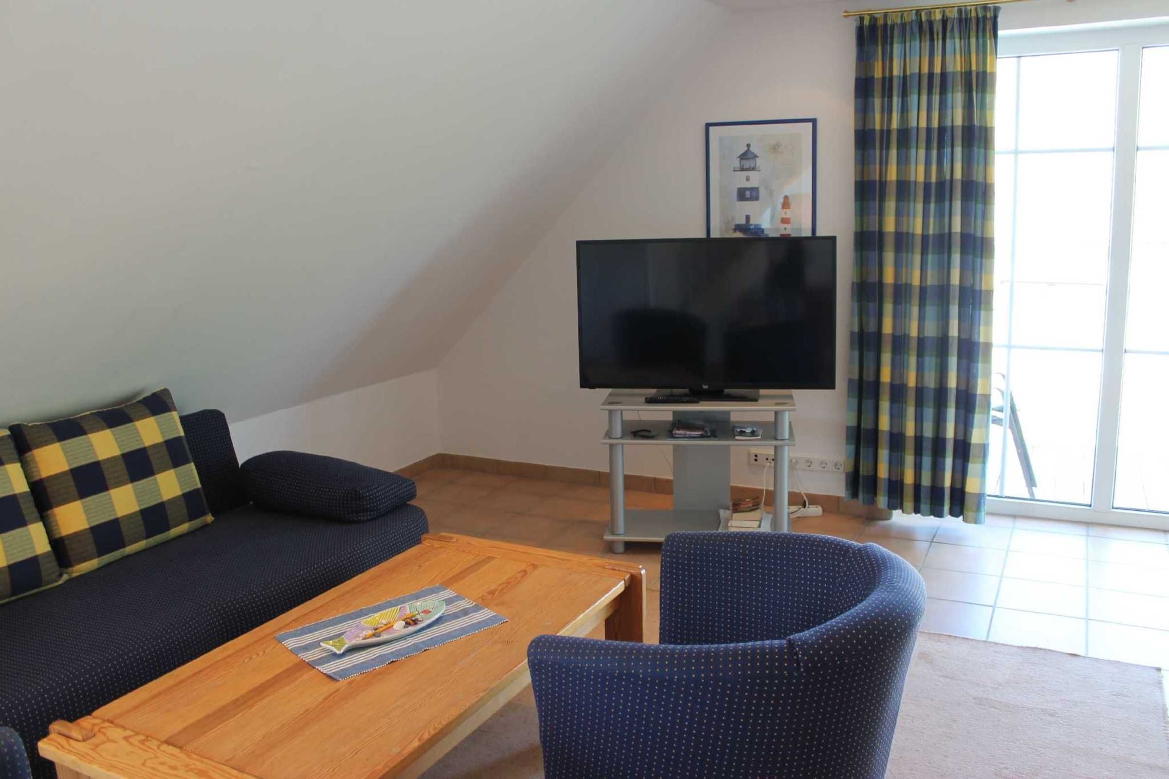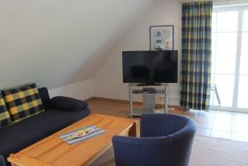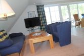 Die 3-Zi-Wohnung liegt im OG mit Balkon und Blick ins Grüne, bestehen aus einem grossen Wohnraum mit integrierter Küche und extra Essbereich sowie Doppelbettcouch. Den Balkon kann man von hier aus betreten. Ebenfalls befindet sich auf dieser Ebene auch ein Schlafzimmer mit 2 Einzelbetten und ein 2. Gäste-WC.