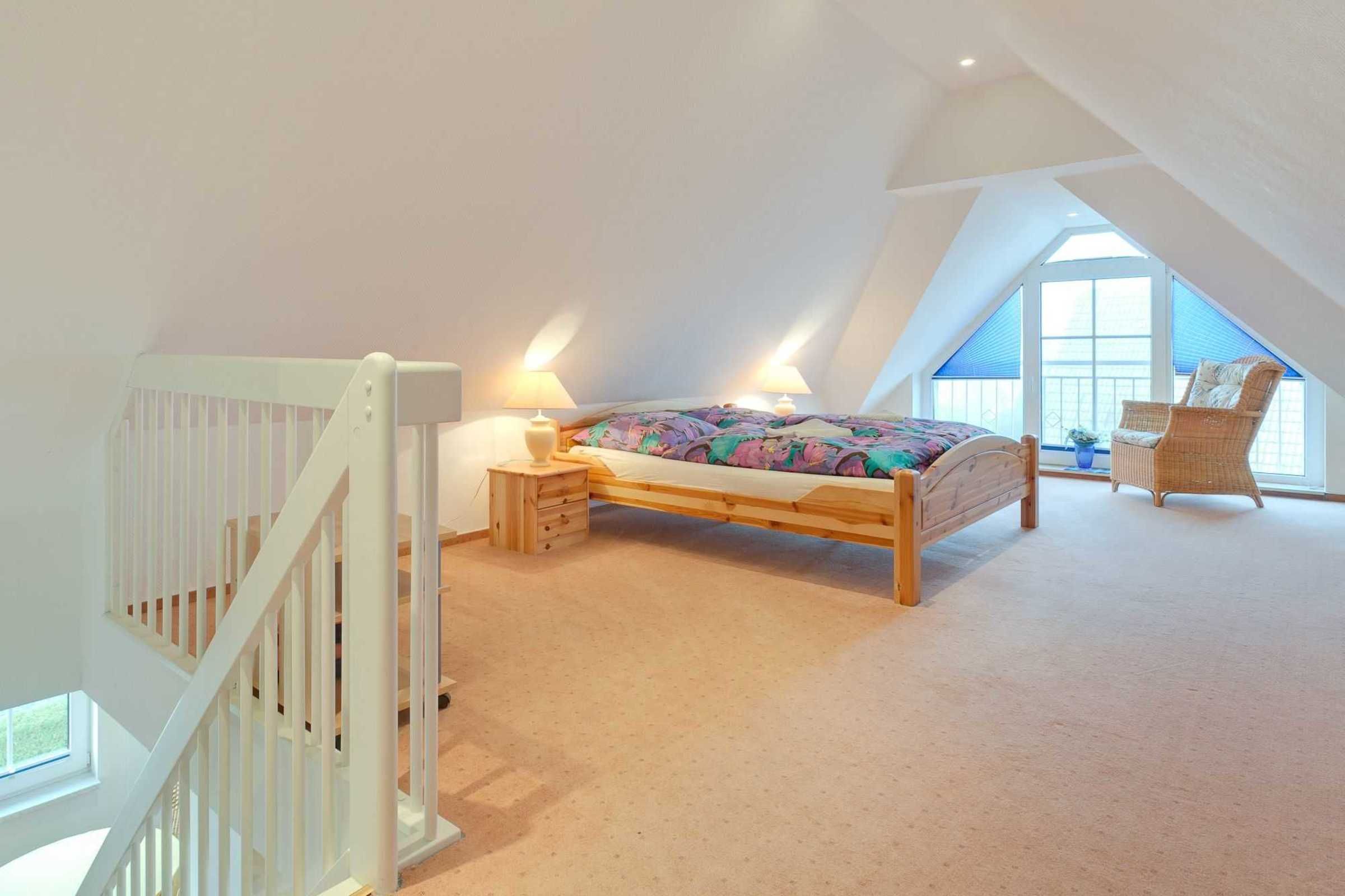 Im Obergeschoss, das man über eine Treppe vom Wohbereich aus erreicht, befindet sich die offene Schlafgalerie mit Doppelbett und Einzelbettliege und DU/WC. Hier befindet sich auch das Bad mit Du/Wc.