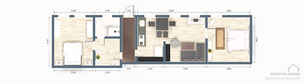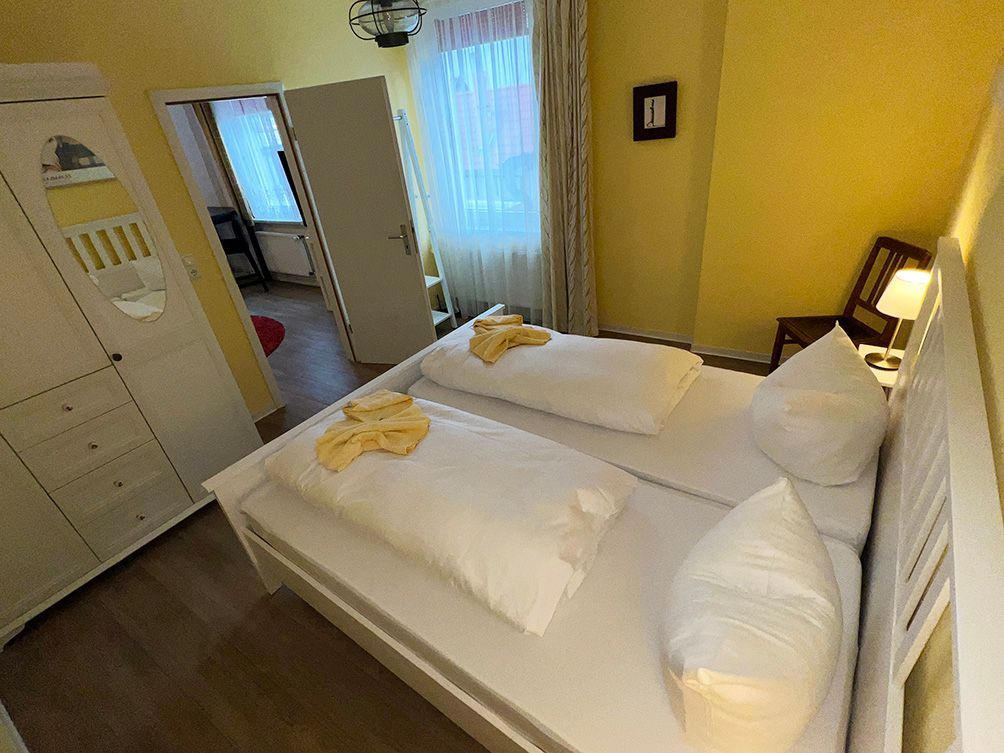 Die Ferienwohnung besteht aus 2 Schlafräumen mit je einem Doppelbett, ein Wohn-/Esszimmer mit offener Küche und DU/WC.