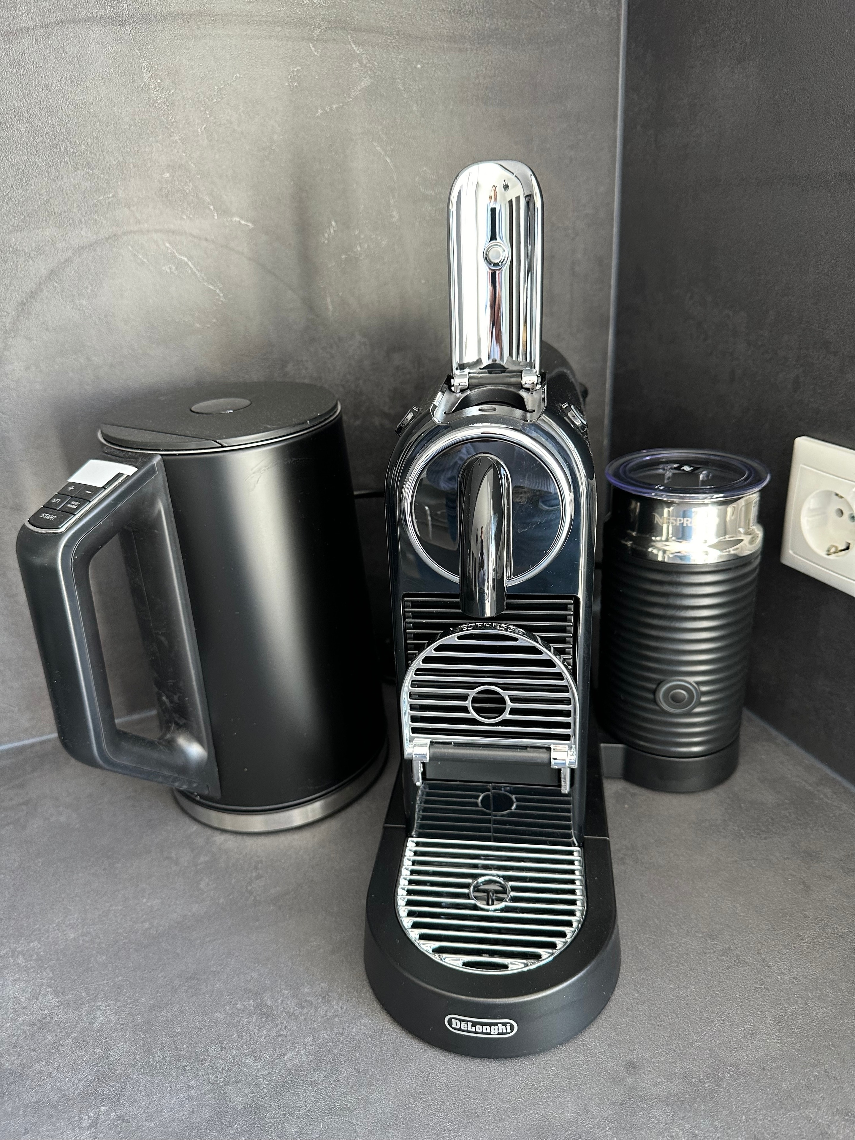 Die komplett mit ausreichend Geschirr, Besteck und Geschirrhandtüchern ausgestattete Küche verfügt über einen Essplatz sowie eine Zubereitungsküche mit einer Waschmaschine und einem Waschtrockner für Ihre Bequemlichkeit. Eine DeLonghi-Kaffeekapselmaschine mit Milchaufschäumer, ein Toaster, ein Wasserkocher und ein Smoothie-Maker von WMF stehen ebenfalls zur Verfügung.