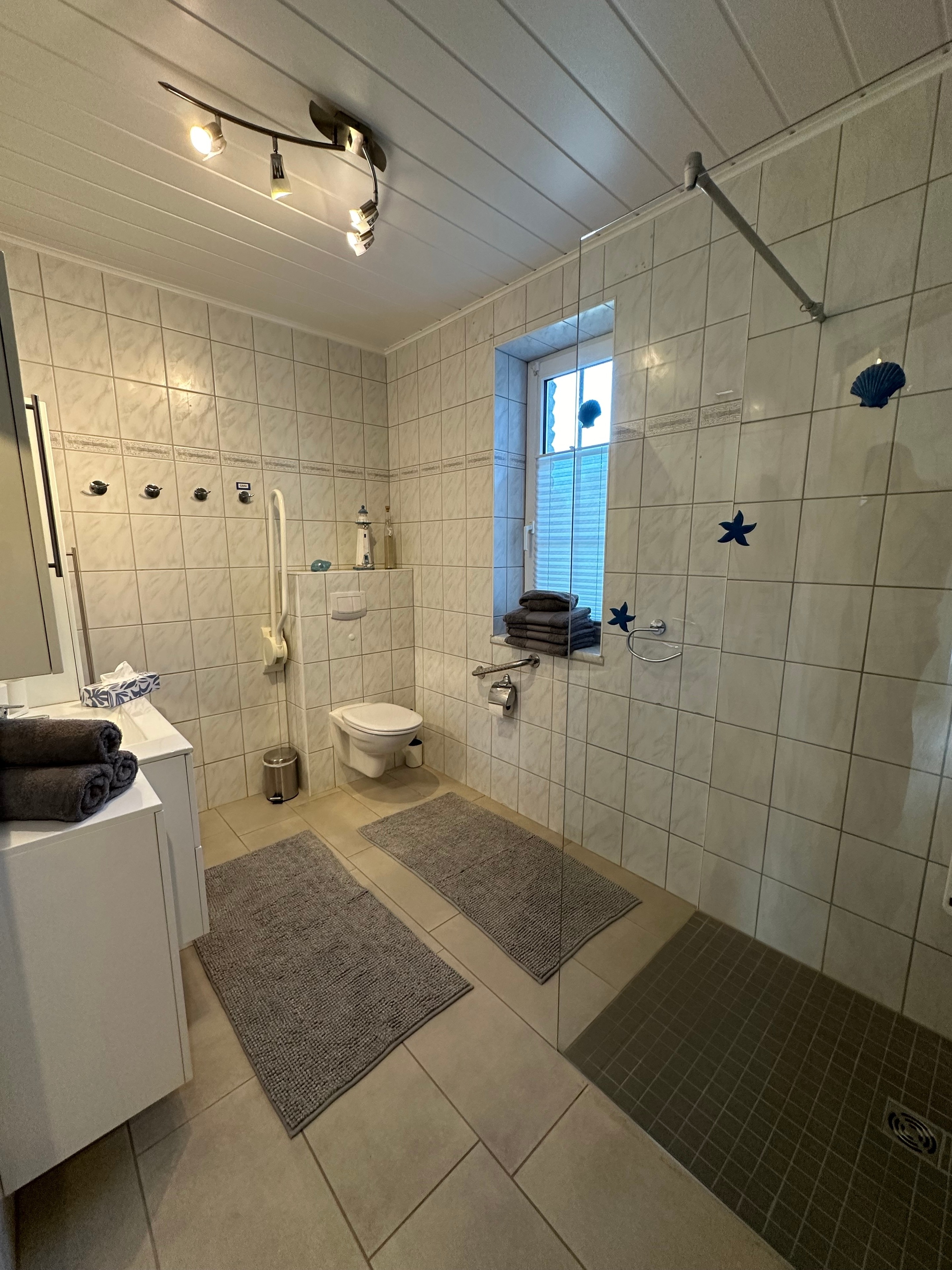 Das sehr großzüge ebenfalls barrierefreie Bad mit Fenster hat ein WC mit Halte- und Stützgriff und eine ebenerdige Dusche mit Glastrennwand, Haltegriff und Sitzmöglichkeit. Selbstverständlich ist ein Föhn und ein Kosmetikspiegel mit 10facher Vergrößerung zu Ihrer Verfügung.