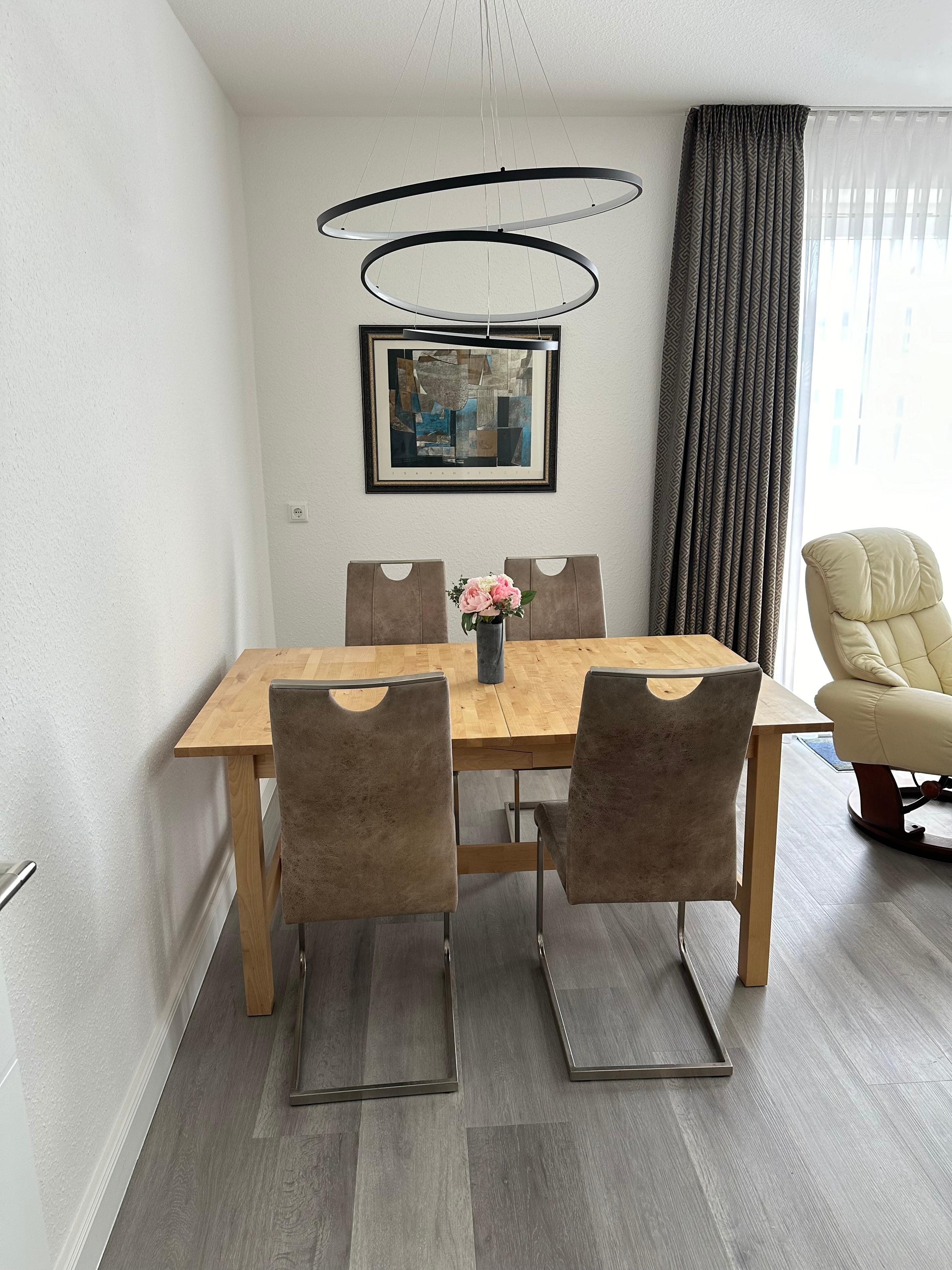Im Wohnzimmer können Sie sich auf einem bequemen Schlafsofa entspannen und Ihre Lieblingssendungen auf dem 65 Zoll Fernseher genießen. Persönlicher Zugang zu Netflix, Disney, Amazon TV Now ist selbstverständlich möglich. Der gemütliche Stressless Sessel lädt zum Verweilen ein, während der Esstisch perfekt für gemeinsame Mahlzeiten ist. Der Zugang zur großen Terrasse mit einem Strandkorb bietet Ihnen die Möglichkeit, die frische Luft und die Sonne zu genießen.