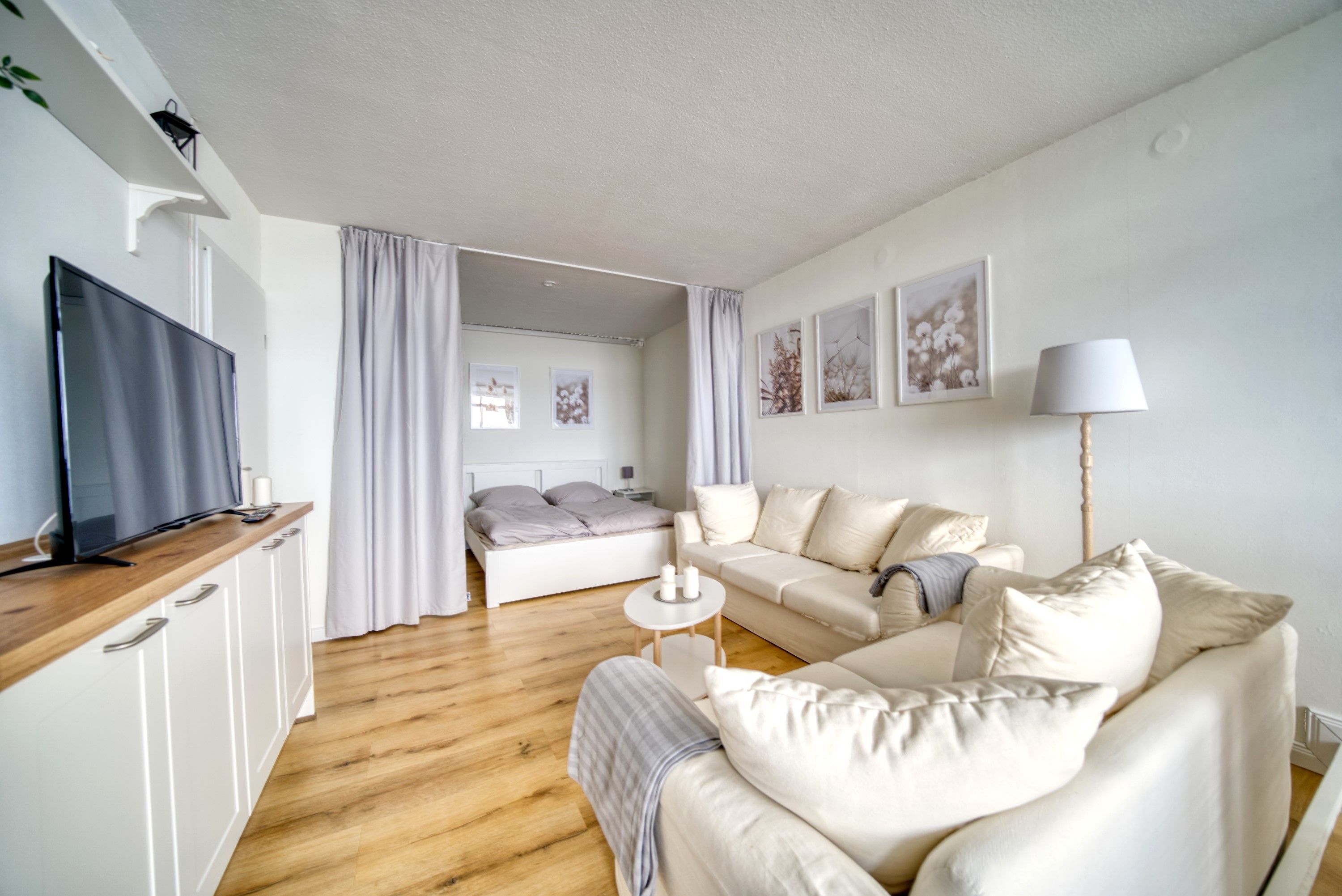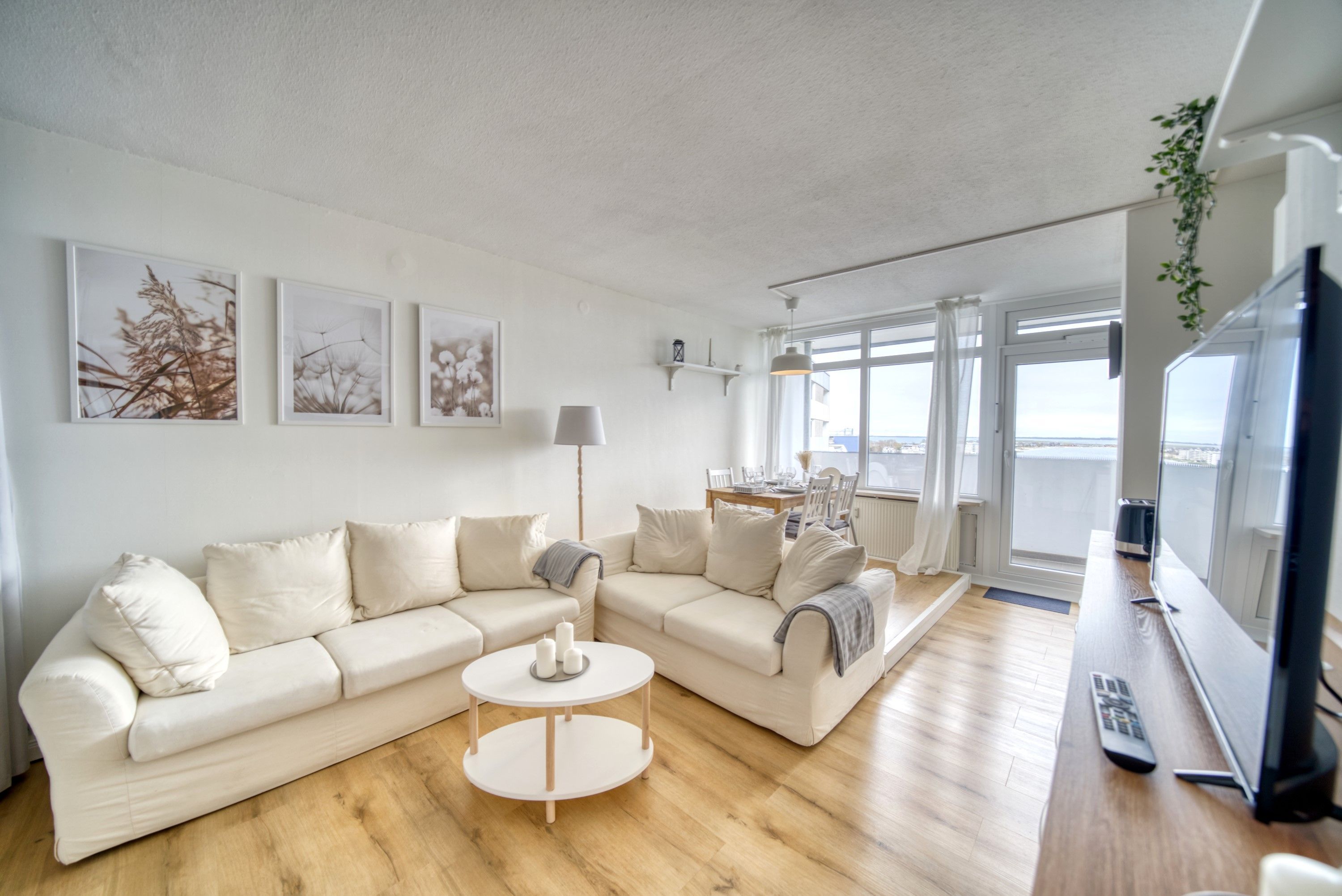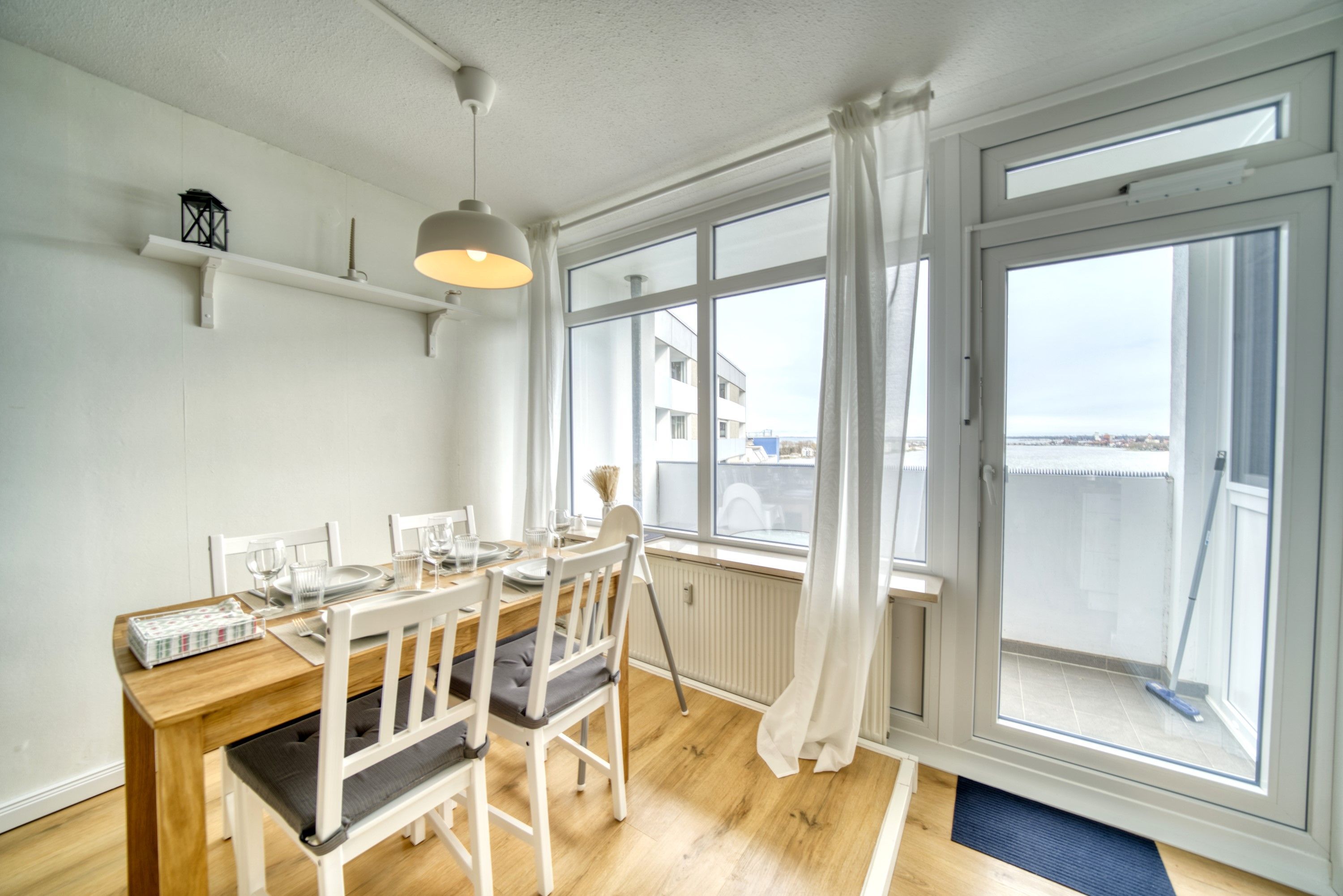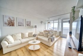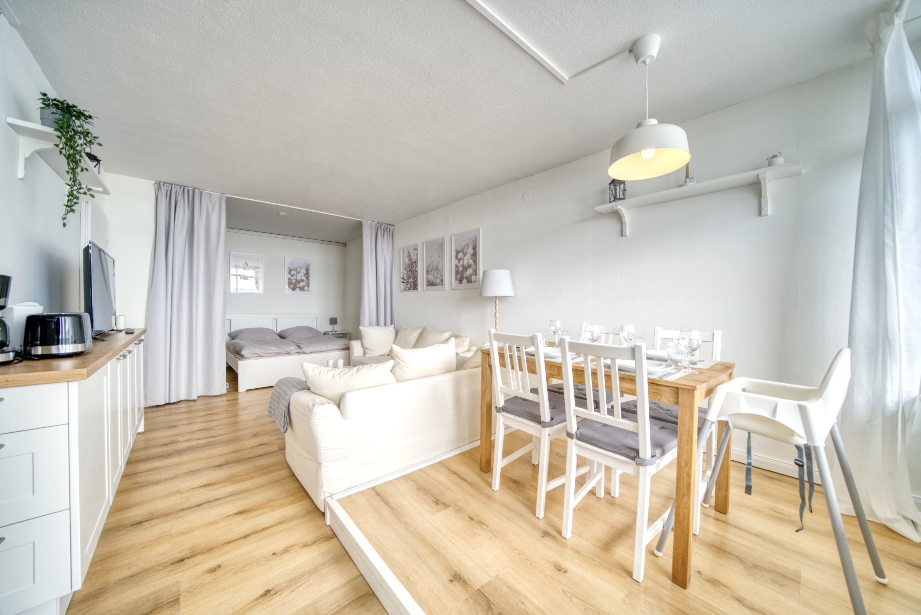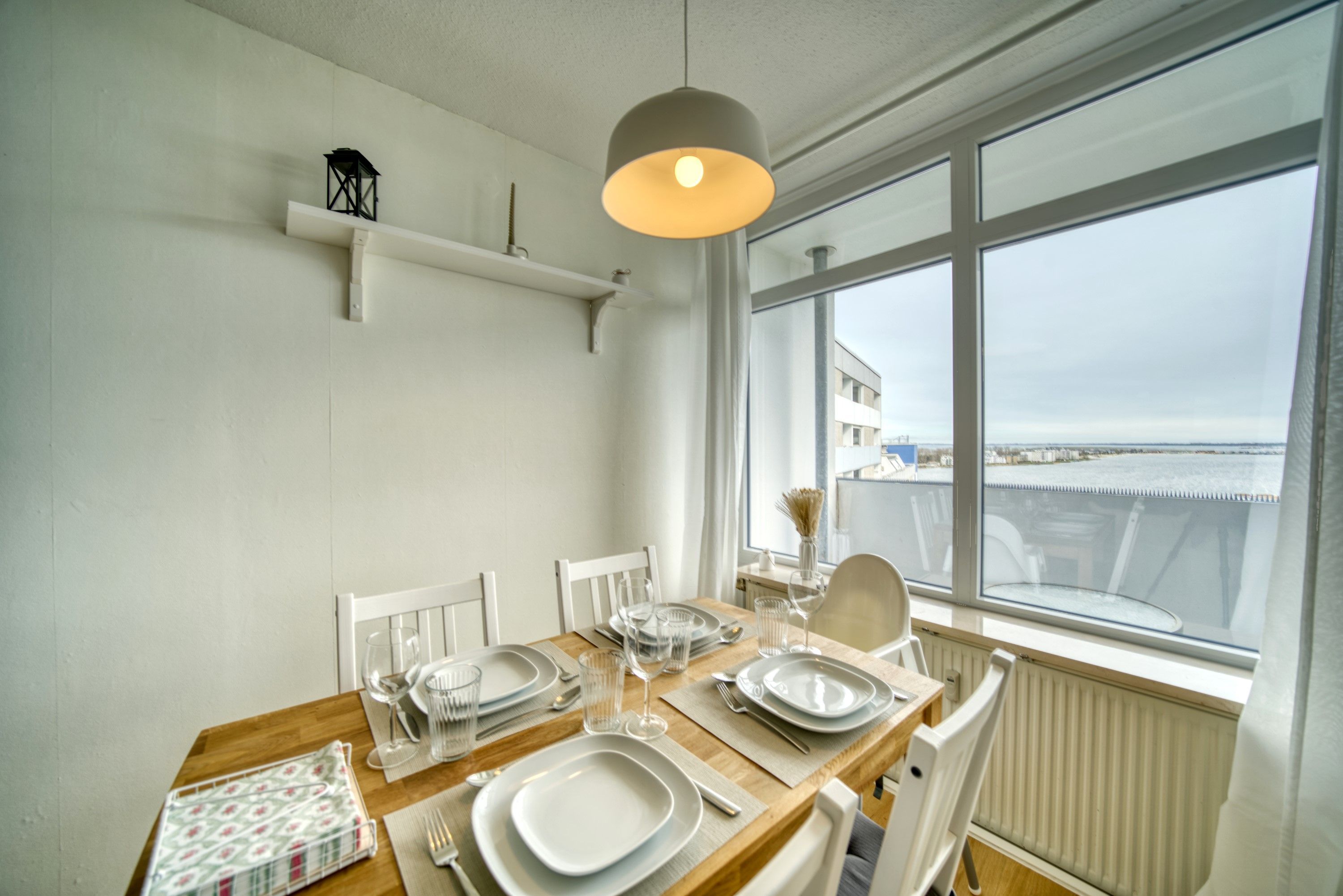Die Ferienwohnung im Haus E, 11. Etage, mit Balkon, bietet viel Platz und einen traumhaften Blick auf die Ostsee sowie den großen Binnensee. Genießen Sie Ihr Frühstück mit Sonnenaufgängen oder den Abend durch ein buntes Farbenspiel rund um den Binnensee.