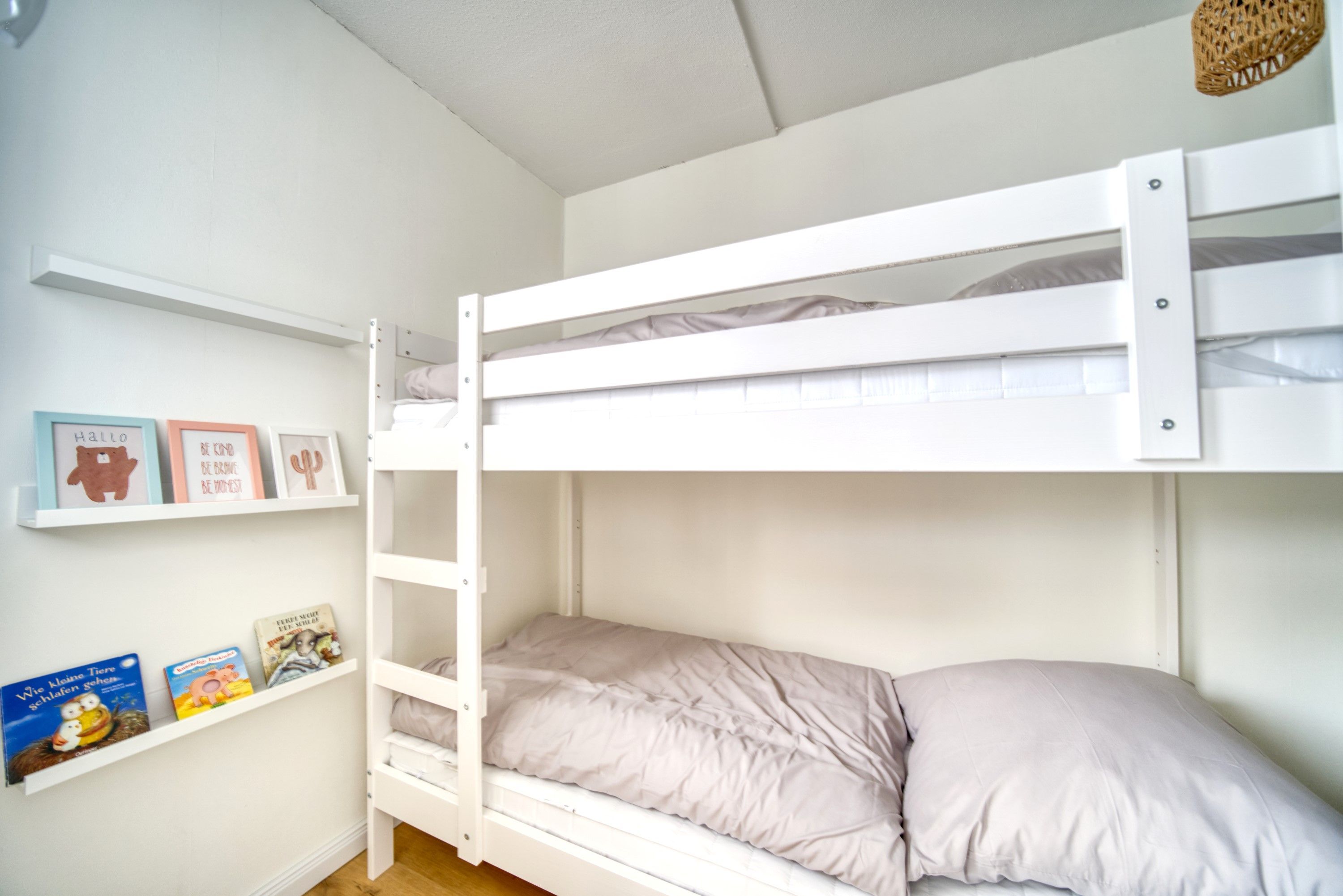 Elternschlafbereich mit Doppelbett, abgetrennt durch lichtundurchlässigen Akustikvorhang