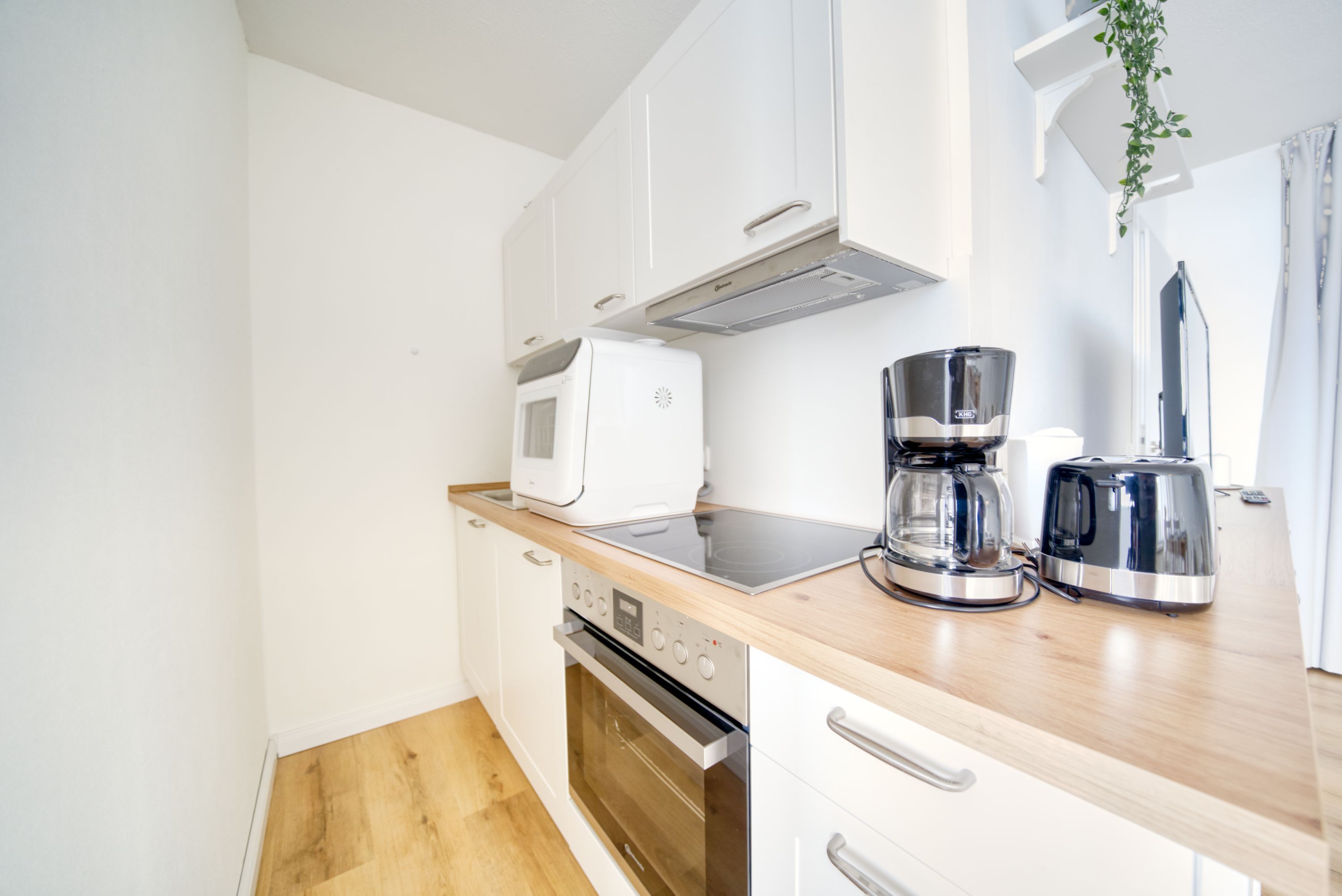 Neue, hochwertig ausgestattete Küche mit Backofen, Ceranfeld, Mikrowelle, Kühlschrank mit Gefrierfach, Kaffeemaschine, Toaster und Wasserkocher