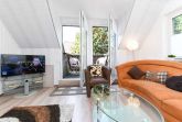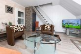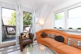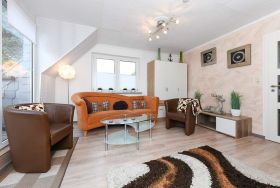 Größe ca. 45 Quadratmeter, Wohnzimmer mit integrierter Küche, Schlafzimmer, Badezimmer mit Dusche, Waschtisch und WC, Obergeschoss, Balkon, optimal für 1 bis 2 Personen und zusätzlich ein Kleinkind.