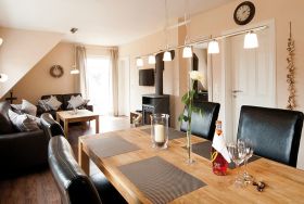 Zur Ausstattung gehören: Bad mit Sauna und Whirlwanne, Gäste-WC, 2 Eltern-Schlafzimmer mit Doppelbett (eins davon im Dachgeschoss), Kinderzimmer mit 2 Einzelbetten, offene voll ausgestattete Wohnküche, Kamin inkl. Holz, Flachbildschirm, DVD, W-Lan, Fußbodenheizung, große Dachterrasse mit Ostseeblick und hochwertigen Gartenmöbeln, Westbalkon, Parkplatz direkt am Haus.