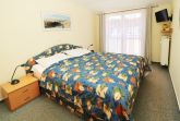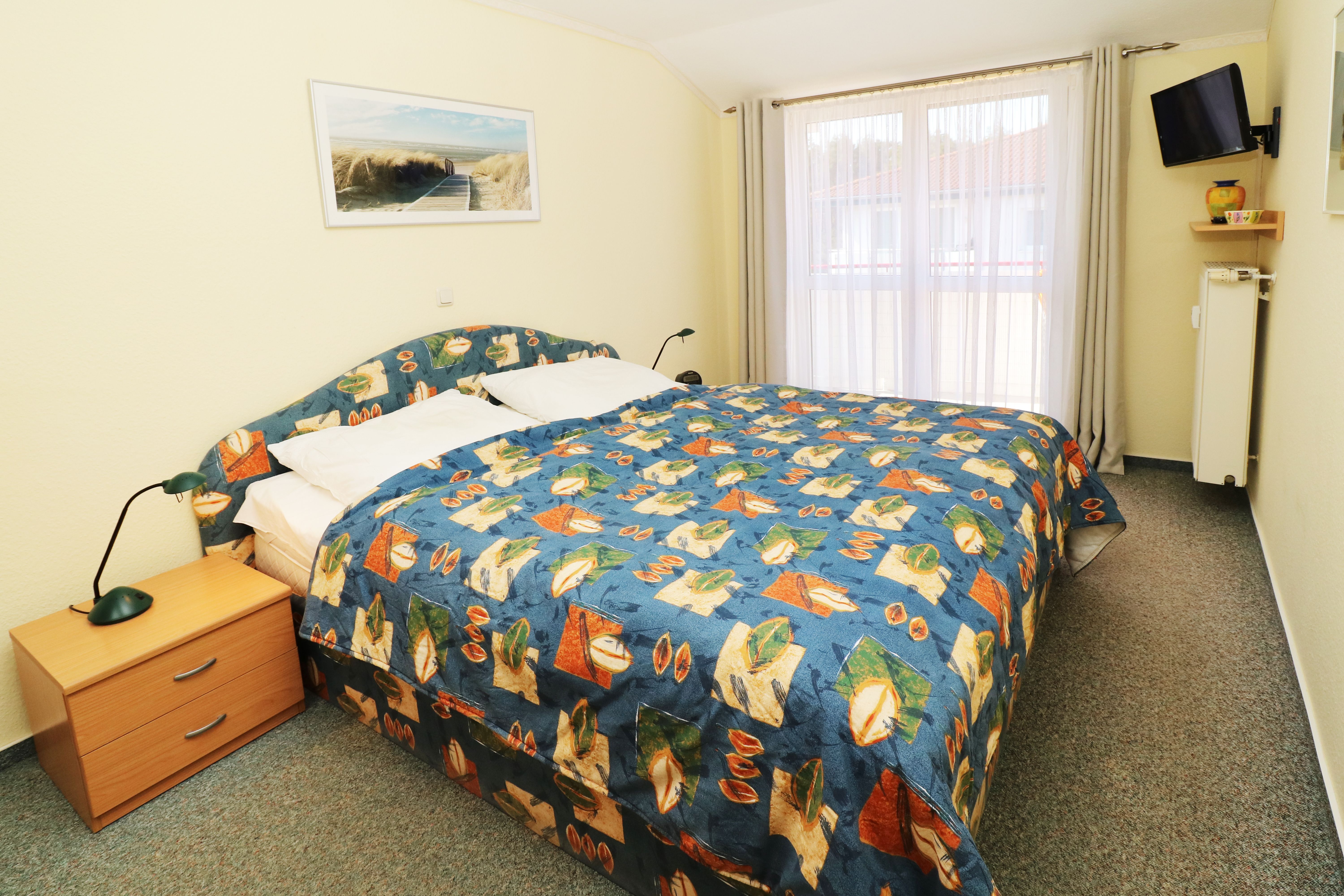 Das Doppelbett im Schlafzimmer hat eine Matratzenhöhe von 55 cm, also eine bequeme „Einstiegs“-Höhe. Dort ist auch ein zweites TV-Gerät installiert.
