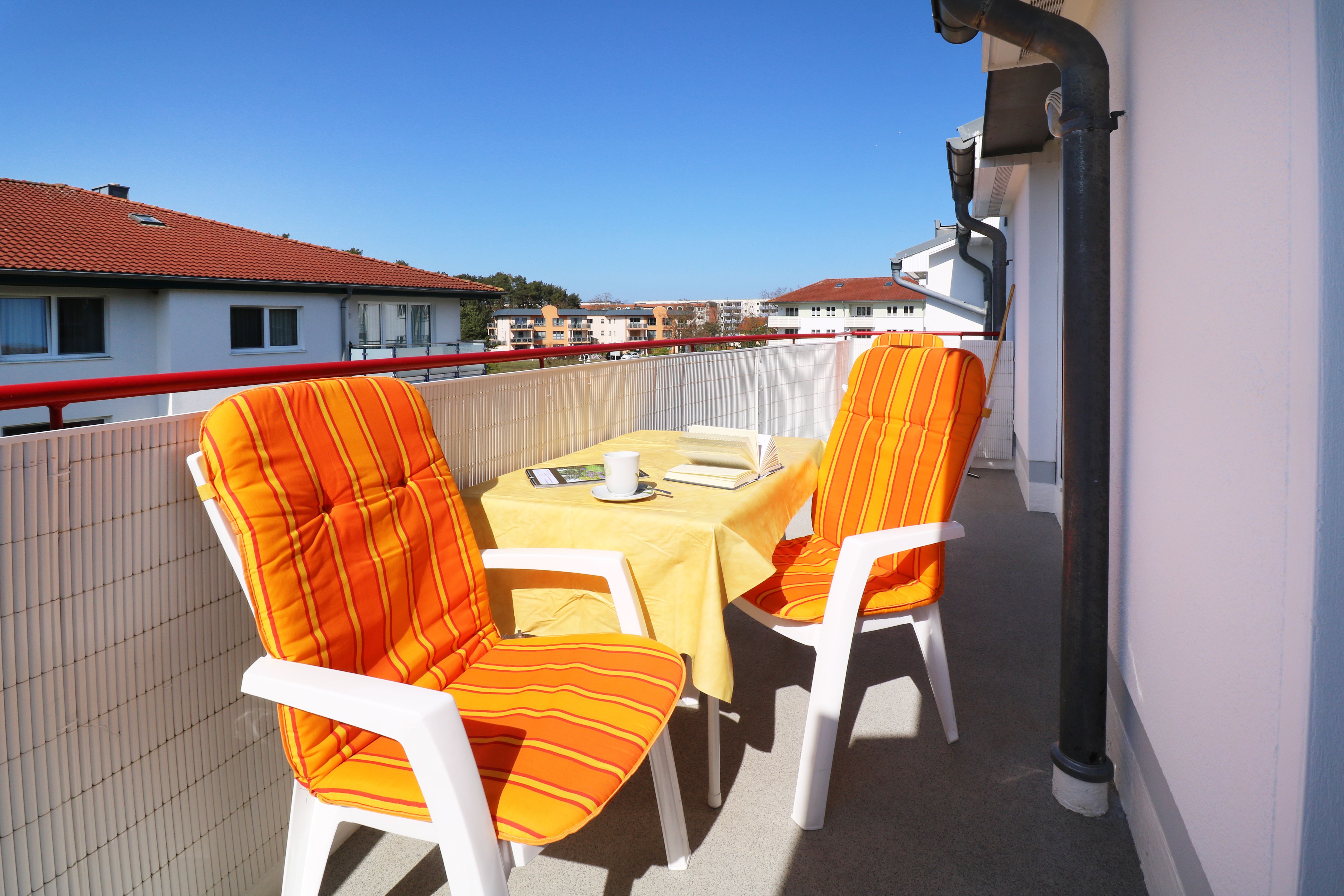 Der breite Balkon erstreckt sich über Wohn- und Schlafzimmer. Balkonstühle und -tisch einschl. der Sitzkissen stehen zur Verfügung.