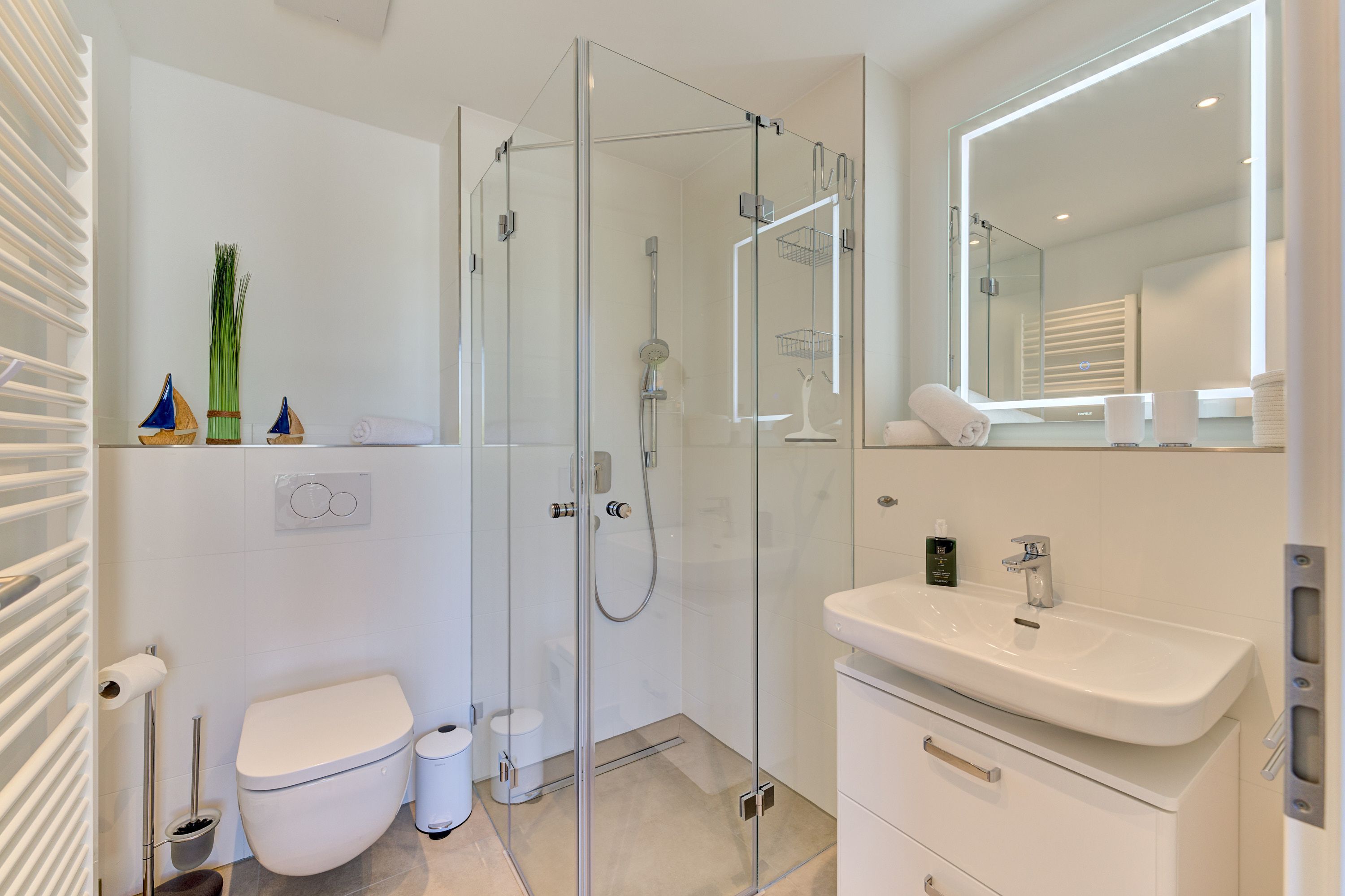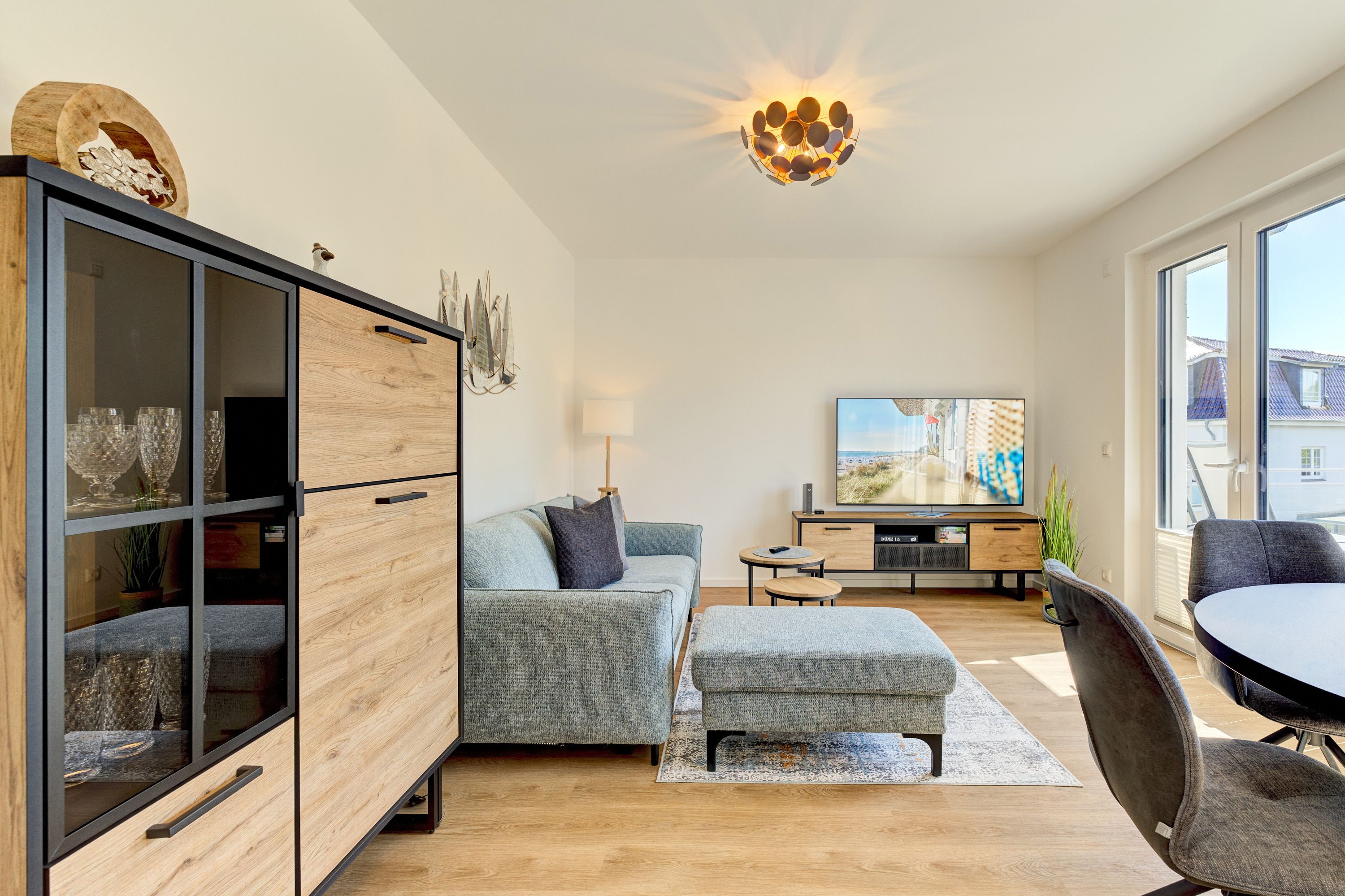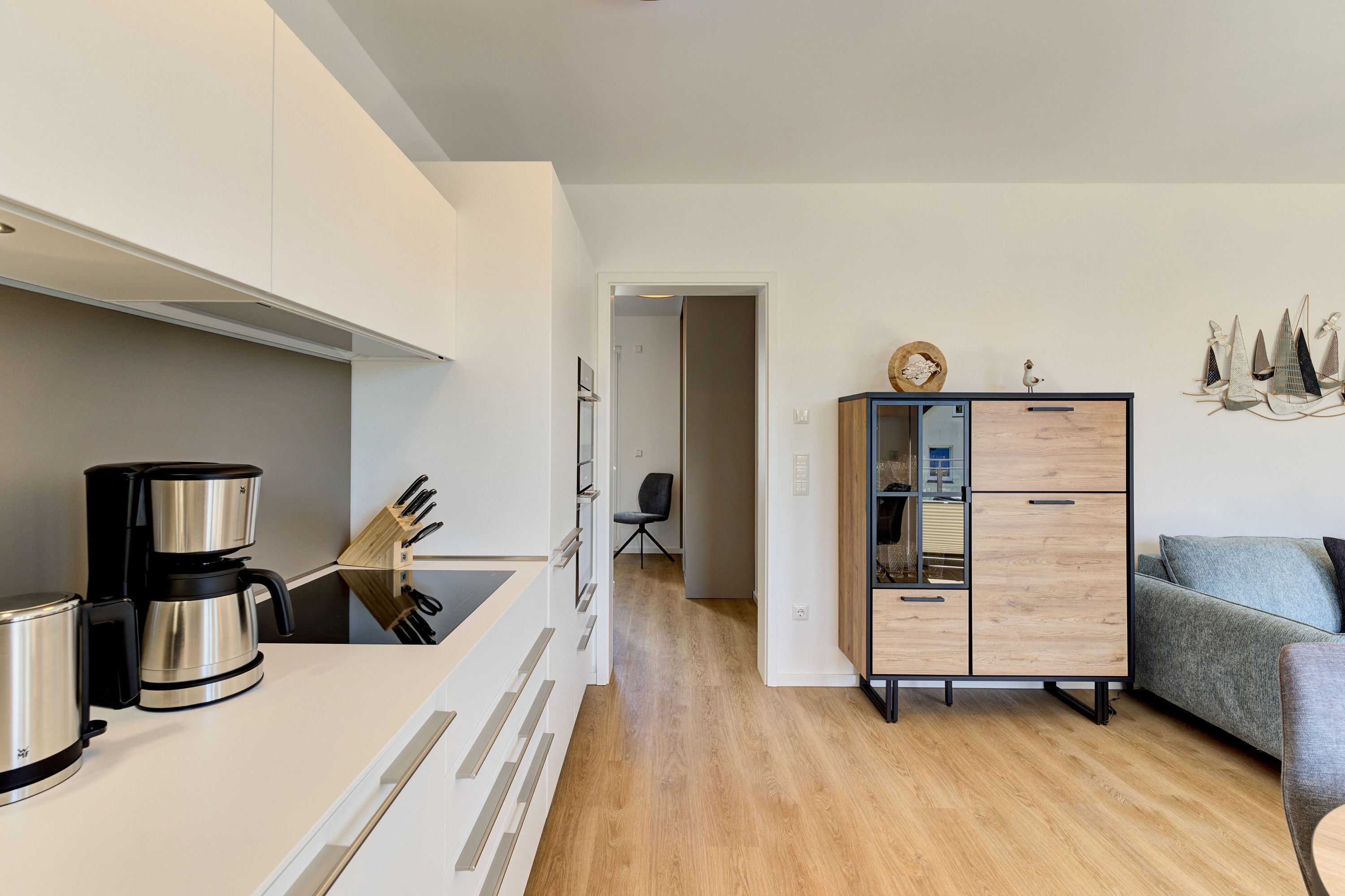 Die 2-Zimmer-Ferienwohnung ist durch ihre bodentiefen Fenster freundlich und hell. Alle Fenster sind mit Licht- und Sichtschutz sowie elektrischen Außenrollläden ausgestattet. Die hochwertige, voll bestückte Bulthaupt-Einbauküche, im Wohn-Essbereich, lässt keine Wünsche offen. Neben der Küchenzeile mit erhöhtem Backofen, Induktions-Kochfeld, Mikrowelle, Geschirrspüler, Kühlschrank und Gefrierschrank der Marke Miele, erwarten Sie eine Filterkaffeemaschine mit Thermoskanne sowie eine Nespresso-Kaffeemaschine, ein Milchaufschäumer, eine Teekanne, ein Toaster, ein Eierkocher, ein Mixer und ein Wasserkocher. Der Wohnbereich ist mit einem qualitativen Sofa ( Schlafcouch) mit Hockerbank, Couchtisch, schwenkbarem Smart-TV (65 Zoll) sowie einem gemütlichen Essbereich eingerichtet. Vorhanden sind Gesellschaftsspiele und Bücher. Von dem Wohnbereich aus gelangen Sie auf den herrlichen großen Süd-Ost-Balkon mit elektrischer Markise, wo Ihnen ein Tisch mit Stühlen und zwei Sonnenliegen zur Verfügung stehen. Das Schlafzimmer lädt mit seinem hochwertigen Boxspringbett der Größe 1,80mx2,00m und seinen zwei Matratzen in H3 zu einem gemütlichen Ausklang des Tages ein. Zudem verfügt es über einen Kleiderschrank, zwei Nachttische inkl. Nachttischlampen mit USB-Ladefunktion sowie einen Smart-TV (55 Zoll). Die bodentiefen Fenster sind auch hier mit elektrischen Außenrollläden ergänzt. Das Badezimmer besticht mit seinem hellen Duschbad mit bodengleicher Dusche, Handtuchheizkörper, Fön und Kosmetikspiegel. Die gesamte Wohnung ist mit einer Fußbodenheizung ausgestattet.