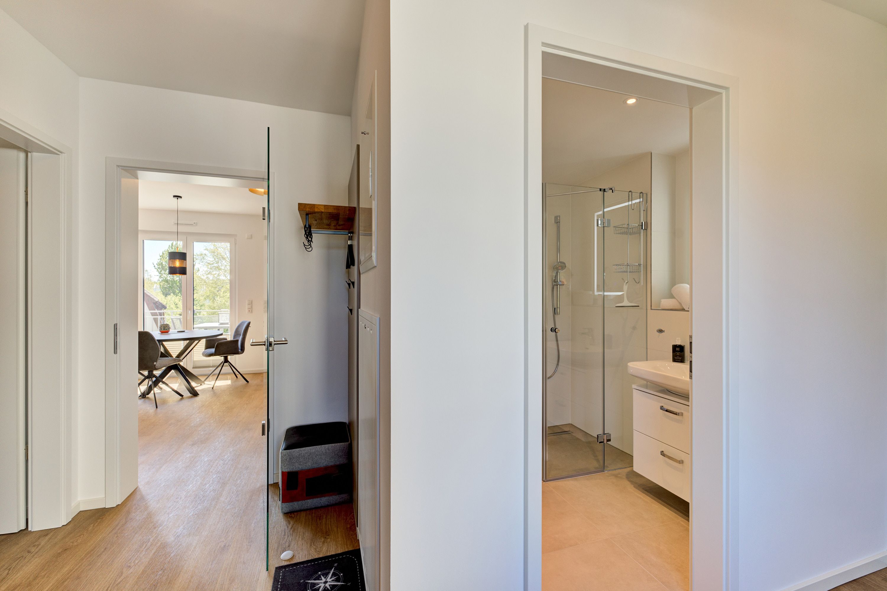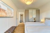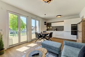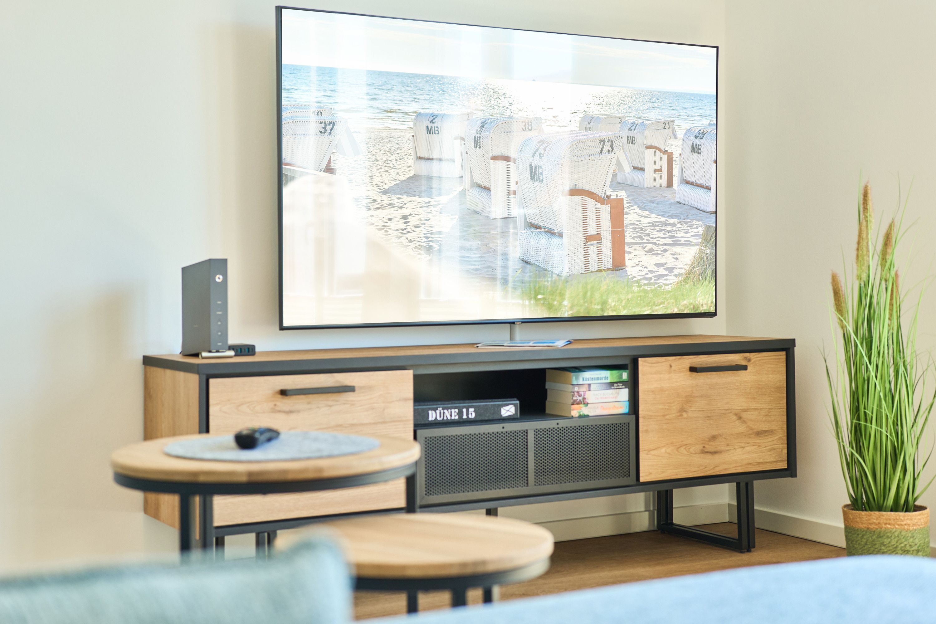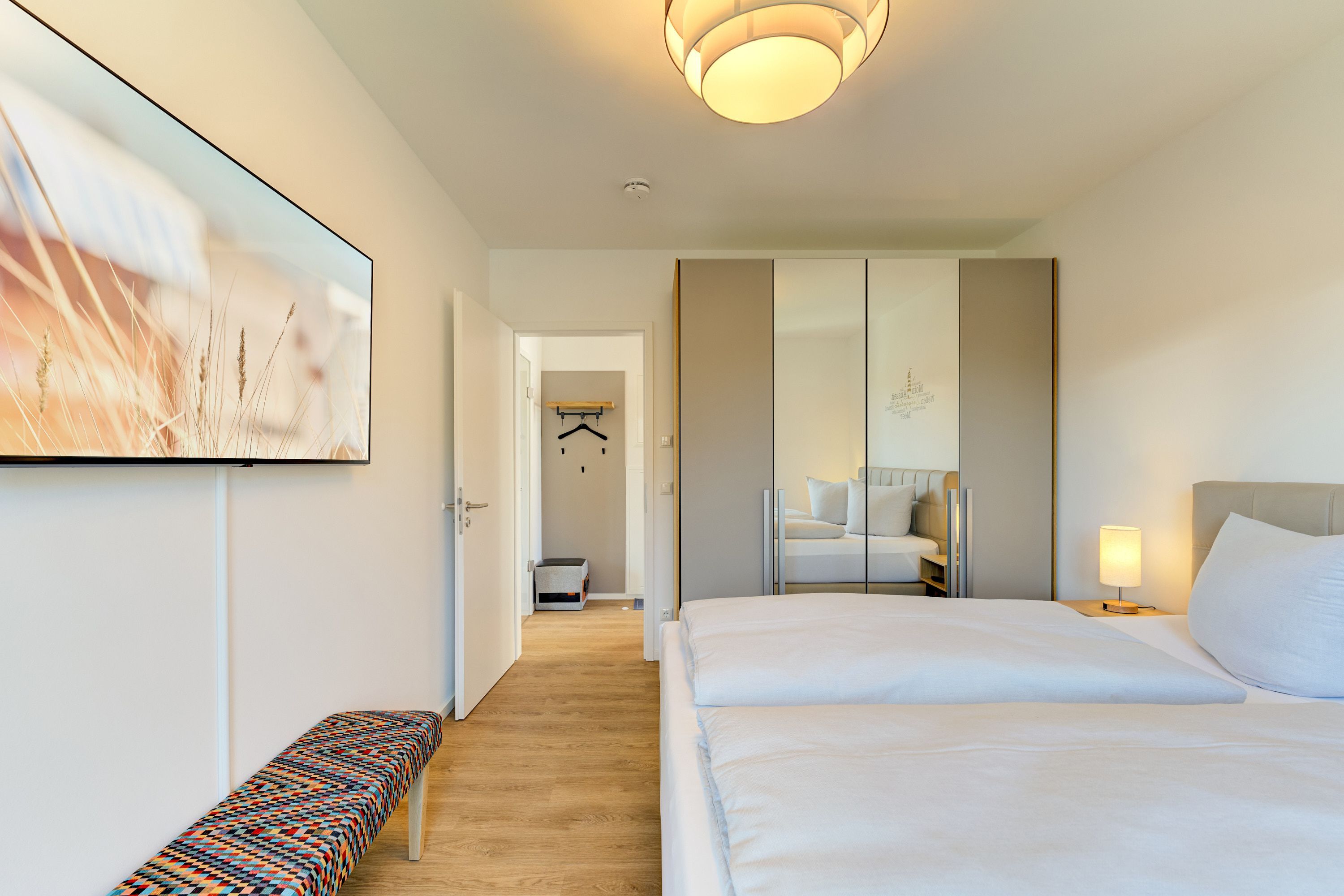 Die 2-Zimmer-Ferienwohnung ist durch ihre bodentiefen Fenster freundlich und hell. Alle Fenster sind mit Licht- und Sichtschutz sowie elektrischen Außenrollläden ausgestattet. Die hochwertige, voll bestückte Bulthaupt-Einbauküche, im Wohn-Essbereich, lässt keine Wünsche offen. Neben der Küchenzeile mit erhöhtem Backofen, Induktions-Kochfeld, Mikrowelle, Geschirrspüler, Kühlschrank und Gefrierschrank der Marke Miele, erwarten Sie eine Filterkaffeemaschine mit Thermoskanne sowie eine Nespresso-Kaffeemaschine, ein Milchaufschäumer, eine Teekanne, ein Toaster, ein Eierkocher, ein Mixer und ein Wasserkocher. Der Wohnbereich ist mit einem qualitativen Sofa ( Schlafcouch) mit Hockerbank, Couchtisch, schwenkbarem Smart-TV (65 Zoll) sowie einem gemütlichen Essbereich eingerichtet. Vorhanden sind Gesellschaftsspiele und Bücher. Von dem Wohnbereich aus gelangen Sie auf den herrlichen großen Süd-Ost-Balkon mit elektrischer Markise, wo Ihnen ein Tisch mit Stühlen und zwei Sonnenliegen zur Verfügung stehen. Das Schlafzimmer lädt mit seinem hochwertigen Boxspringbett der Größe 1,80mx2,00m und seinen zwei Matratzen in H3 zu einem gemütlichen Ausklang des Tages ein. Zudem verfügt es über einen Kleiderschrank, zwei Nachttische inkl. Nachttischlampen mit USB-Ladefunktion sowie einen Smart-TV (55 Zoll). Die bodentiefen Fenster sind auch hier mit elektrischen Außenrollläden ergänzt. Das Badezimmer besticht mit seinem hellen Duschbad mit bodengleicher Dusche, Handtuchheizkörper, Fön und Kosmetikspiegel. Die gesamte Wohnung ist mit einer Fußbodenheizung ausgestattet.