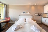 Das 1-Zimmer-Apartment bietet für bis zu 2 Personen Platz. Es befindet sich in der 6. Etage des Olympia Hotels und lässt sich bequem mit einem Fahrstuhl erreichen.