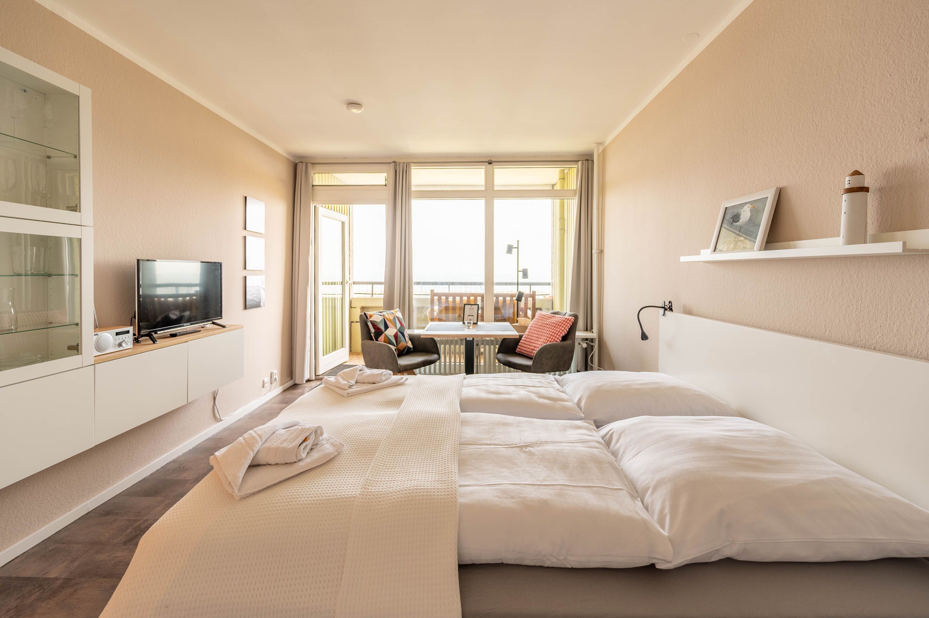 Neben einer großen Fensterfront, die direkt auf den Balkon führt, lässt auch die hell gestrichene Wand die Ferienwohnung freundlich erscheinen. Neben dem Doppelbett ( 160 x 200) verfügt das Apartment über einen Esstisch, welcher mit Blick auf das Meer ausgerichtet ist, sowie ein Radio und Fernseher für gemütliche Abende. Die Wohnung lässt sich bei Bedarf abdunkeln.