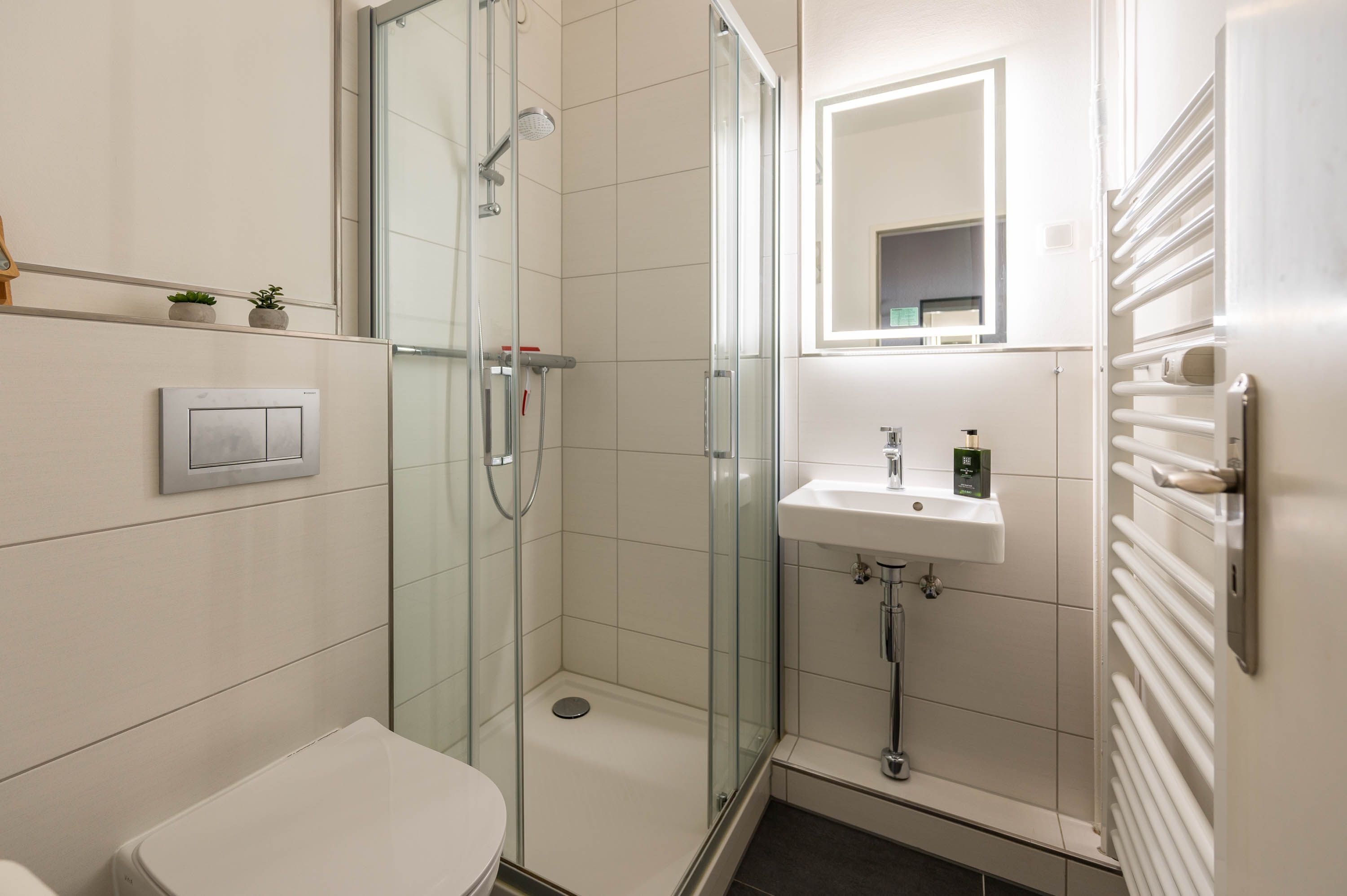 Neben einem WC und Waschbecken befindet sich im innen liegenden Badezimmer eine Dusche und ausreichend Ablagefläche.