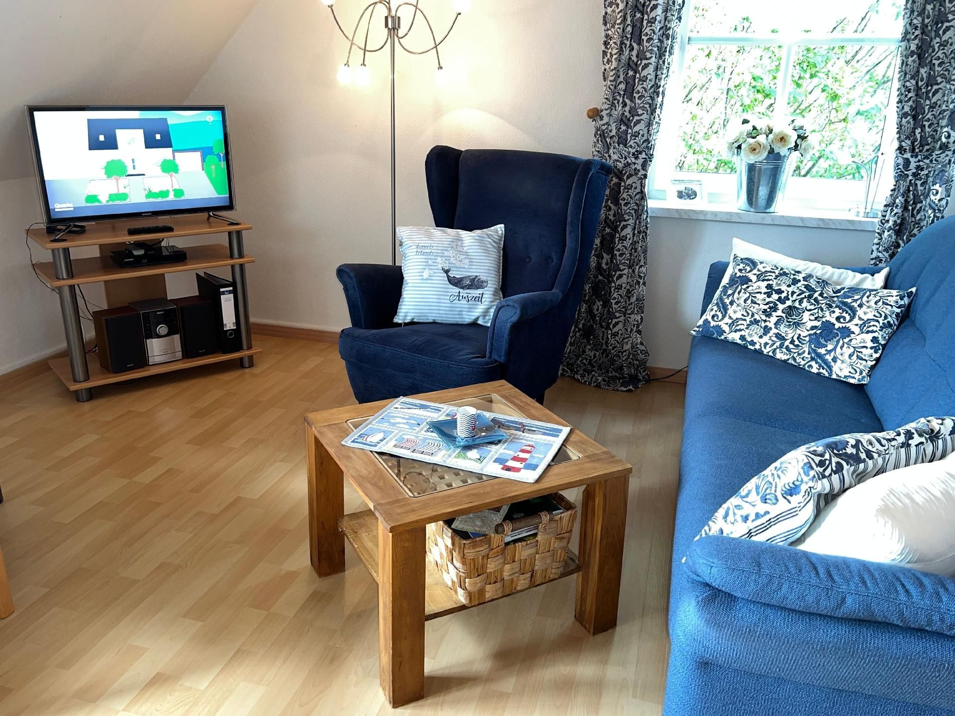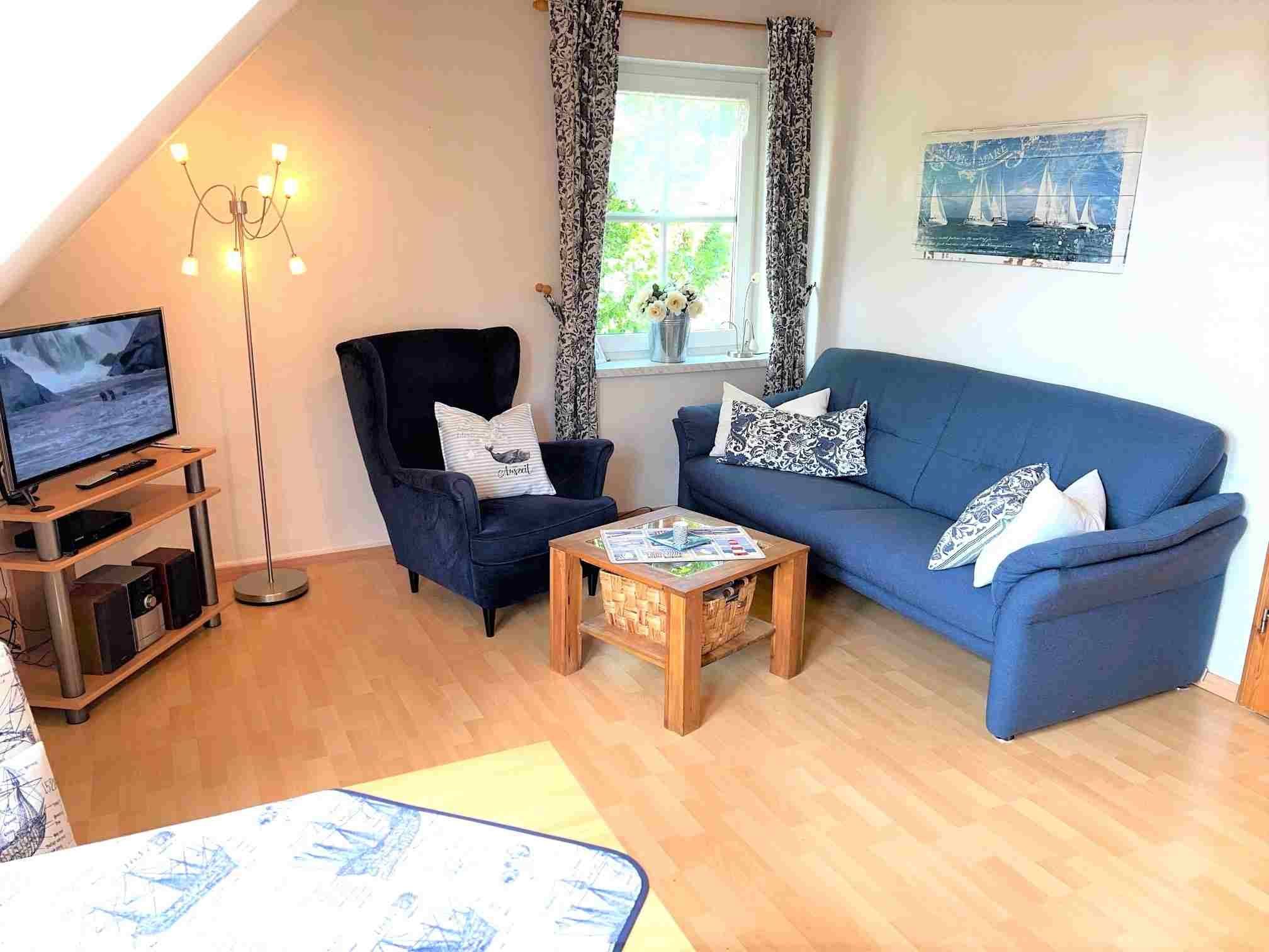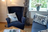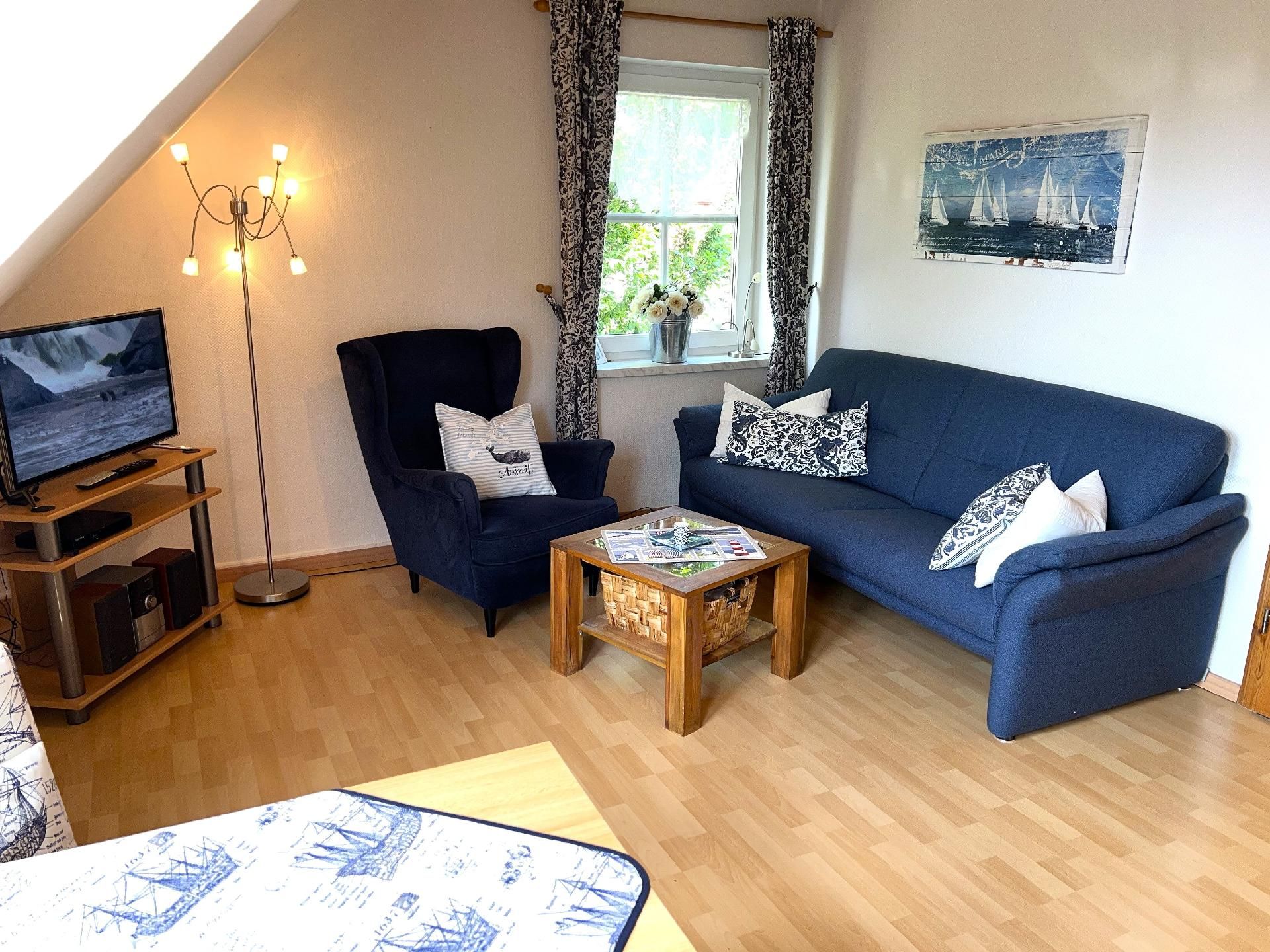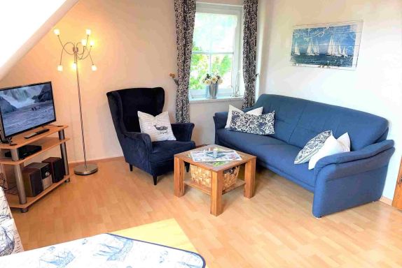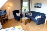 Die Ferienwohnungen ist für 1 bis 2 Personen geeignet. Sie ist modern und komfortabel im maritimen Stil eingerichtet. Sie finden in der Küchenzeile neben Herd, Backofen und Kühlschrank mit Gefrierfach, Wasserkocher und Kaffeemaschine, alles, wass Sie zum Kochen und genussvollem Essen benötigen. Sollten Sie darüberhinaus noch Dinge benötigen, sprechen Sie uns bitte an. Eine Mikrowelle stellen wir Ihnen auf Anfrage gern zur Verfügung. Der Esstisch ist für bis zu 4 Personen geeignet. Der Wohnbereich verfügt über neuwertige Sitzmöbel mit Wohnzimmertisch. Kabel-TV und eine HiFi-Anlage sowie WLAN garantieren beste Unterhaltung. Bücher und Gesellschaftsspiele sind ebenfalls vorhanden.