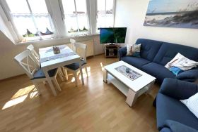 Die Ferienwohnungen ist für 1 bis 3 Personen geeignet. Sie ist modern und komfortabel im maritimen Stil eingerichtet. Sie finden in der Küchenzeile neben Herd, Backofen und Kühlschrank mit Gefrierfach, Wasserkocher und Kaffeemaschine, fast alles, wass Sie zum Kochen und genussvollem Essen benötigen. Sollten Sie darüberhinaus Dinge benötigen, scheuen Sie sich nicht, uns anzusprechen. Eine Mikrowelle stellen wir Ihnen ebenfalls auf Anfrage gern zur Verfügung. Der Esstisch ist für bis zu 4 Personen geeignet. Der Wohnbereich verfügt über neuwertige Sitzmöbel (Couch und Sessel) mit Wohnzimmertisch. Kabel-TV und eine HiFi-Anlage sowie WLAN garantieren beste Unterhaltung. Bücher und Gesellschaftsspiele sind ebenfalls vorhanden.