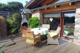 Ferienhaus mit einem Wohnraum und einer Schlafnische. Die offene Küche ist modern auch mit Geschirrspüler ausgestattet. Bad mit ebenerdiger Dusche. Von der Terrasse mit Grill und Möbeln blickt man in den gemeinschaftlich genutzten Garten. Bei schönem Wetter kann der Pool mitbenutzt werden. Parkmöglichkeiten direkt am Objekt.