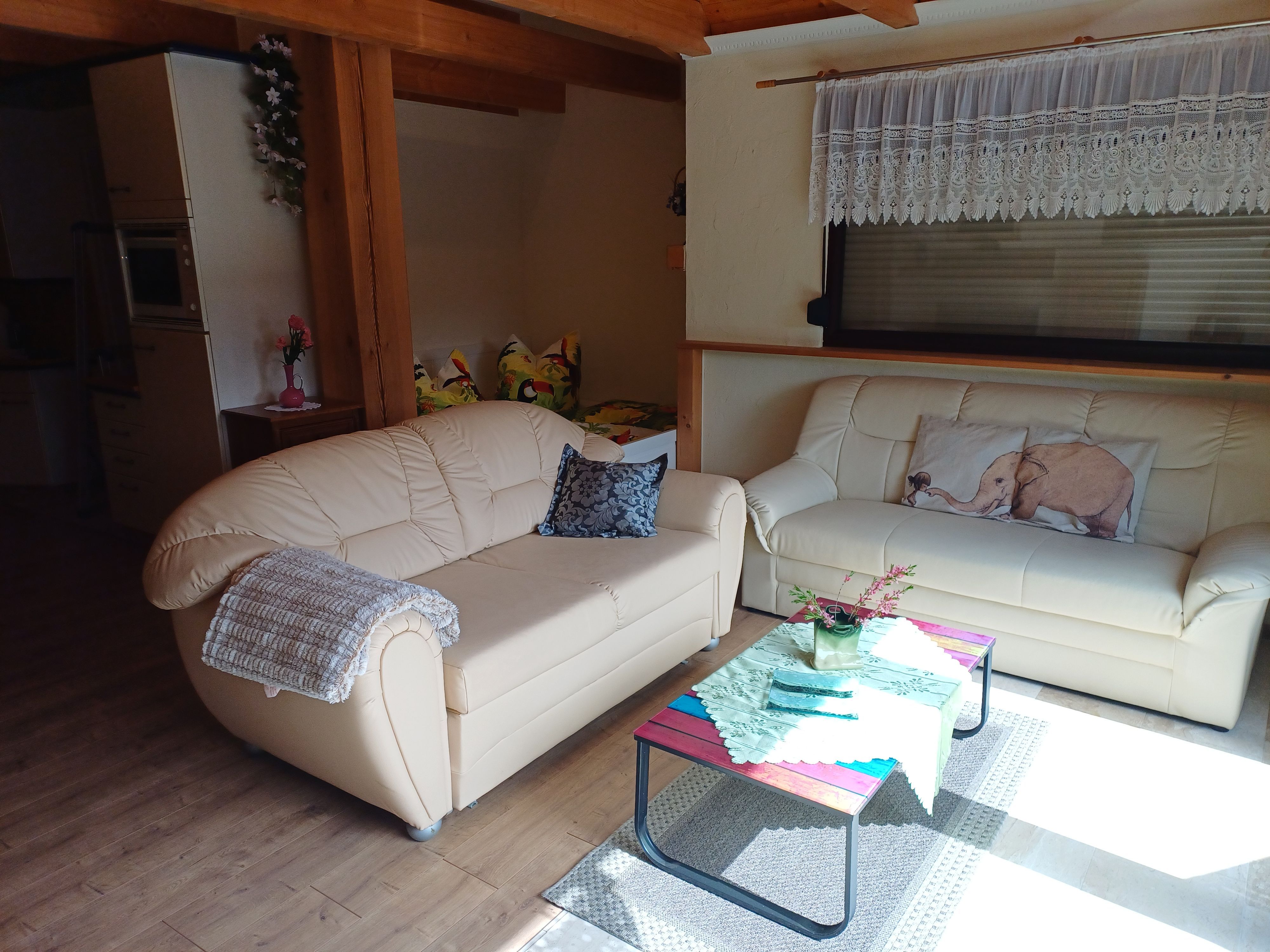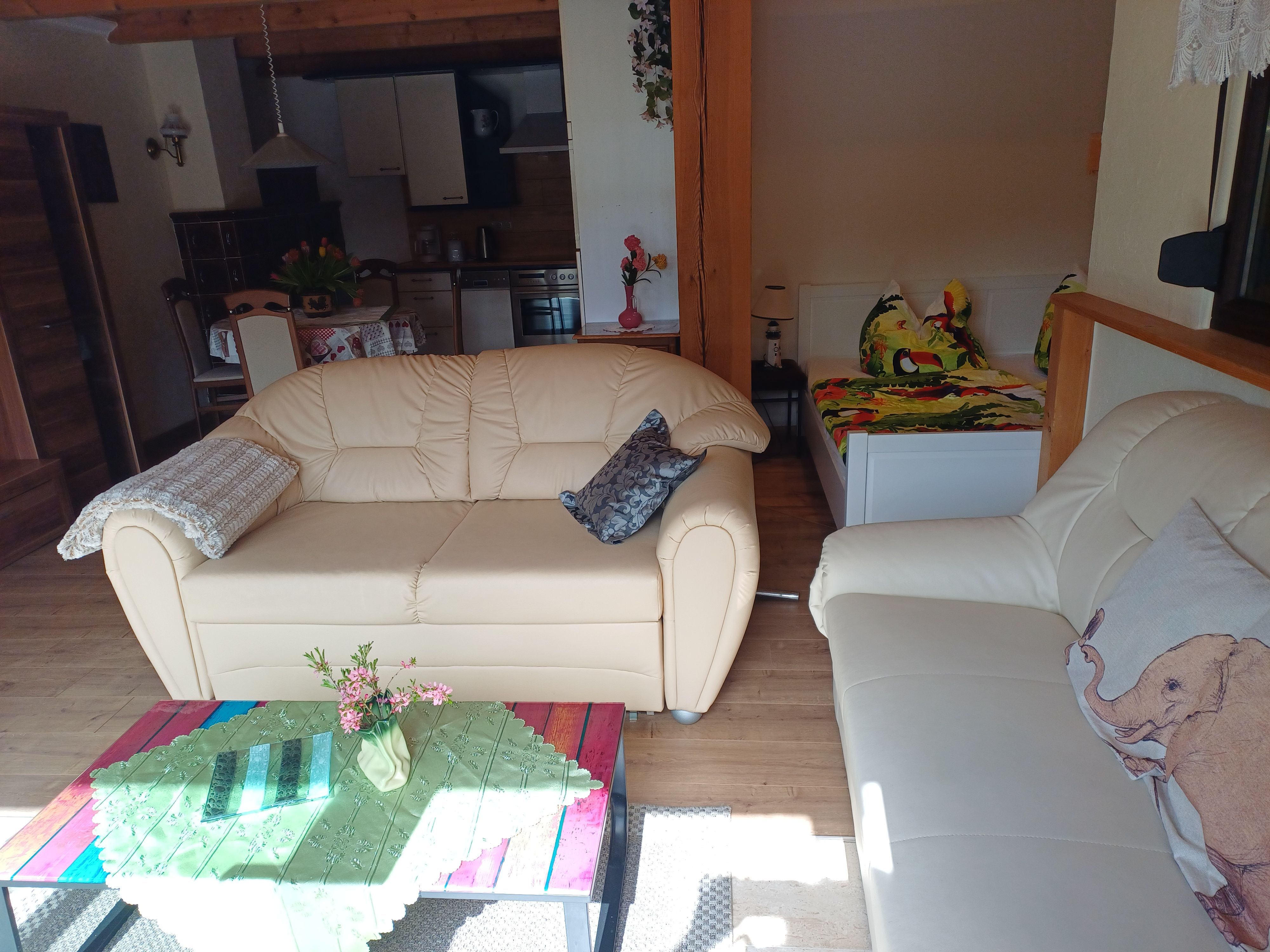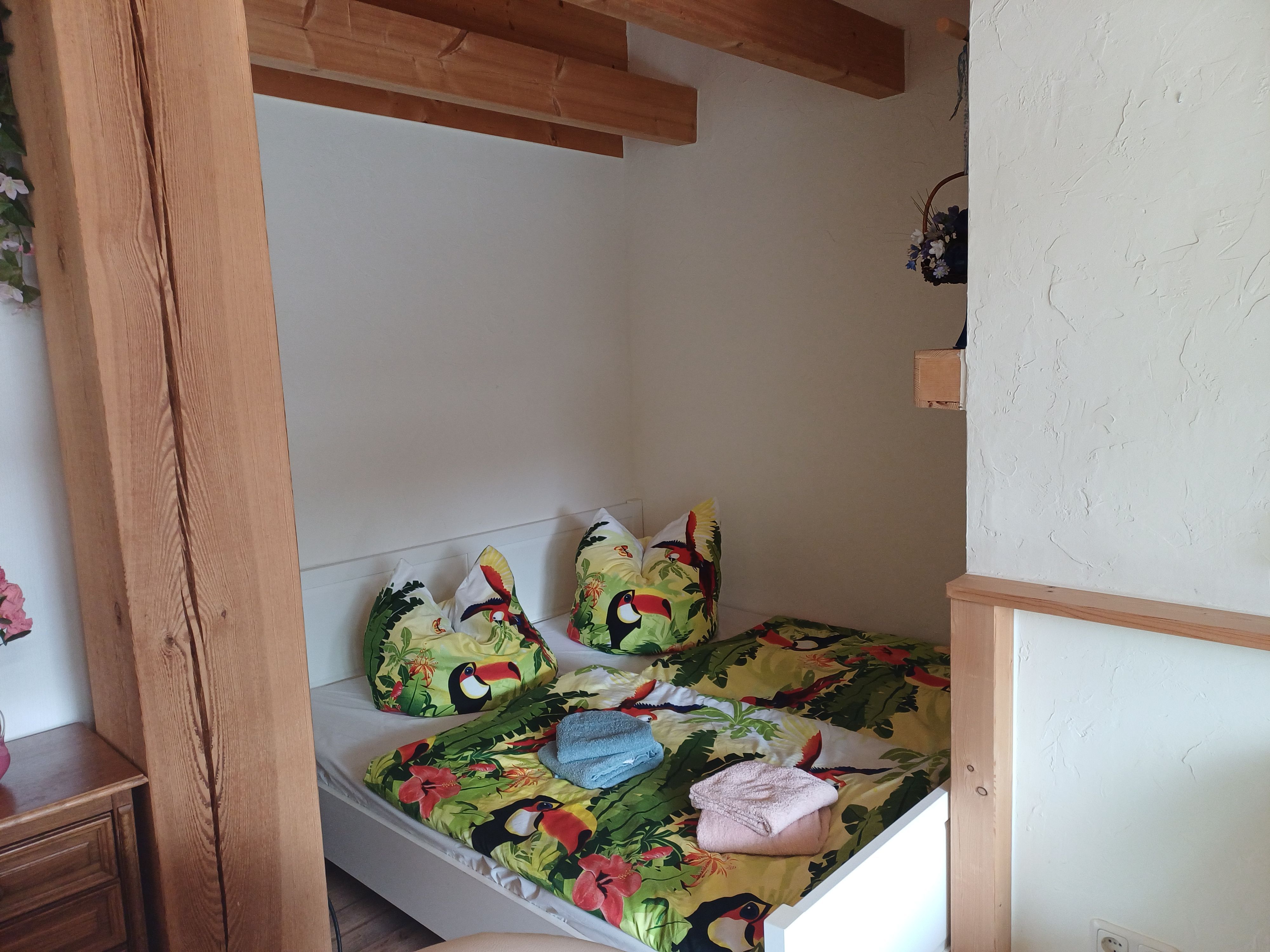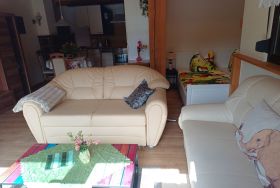 Das Ferienhaus befindet sich in einer ruhigen Lage. In wenigen Gehminuten sind Einkaufsmöglichkeiten und der Wald zu erreichen. Das Ferienhaus kann für 2 Erwachsene oder 1 Erwachsener und 1 Kind ab 6 Jahre gebucht werden. Das Ferienhaus hat einen Wohnraum mit einer Schlafnische. Die offene Küche ist komplett mit moderner Ausstattung eingerichtet. Bad mit Dusche und WC. Handtücher und Bettwäsche sind vorhanden und im Preis inklusive. Die Böden sind mit Fliesen und Klickvinyl ausgestattet. Der Pkw-Stellplatz ist am Haus. Auf der Terrasse mit Grill und Gartenmöbeln mit Auflagen und Sonnenschirm lässt sich der Urlaub wunderbar genießen. Bei schönem Wetter kann der Pool im Garten mitbenutzt werden.