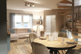 Im Erdgeschoss sind der helle Wohnbereich und die Essecke mit der umfangreich ausgestatteten Küchenzeile zu finden. Von hier gelangt man auch auf die möblierte Terrasse.