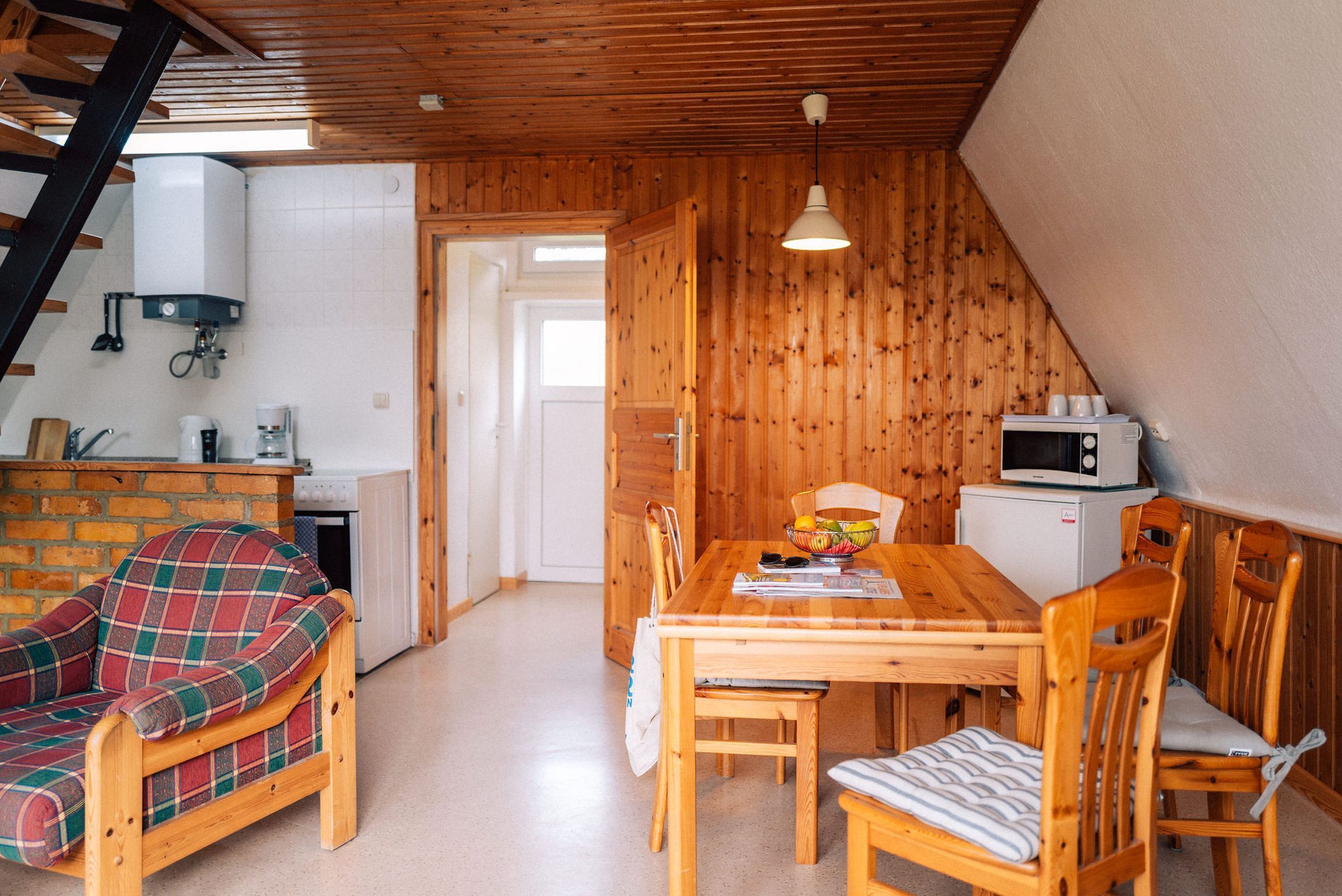 Eine steile Raumspartreppe führt zu den zwei Schlafräumen - ein Schlafzimmer mit Doppelbett, ein Schlafzimmer mit zwei Einzelbetten. Die Bettwäsche ist inklusive. Handtücher bitte mitbringen!
