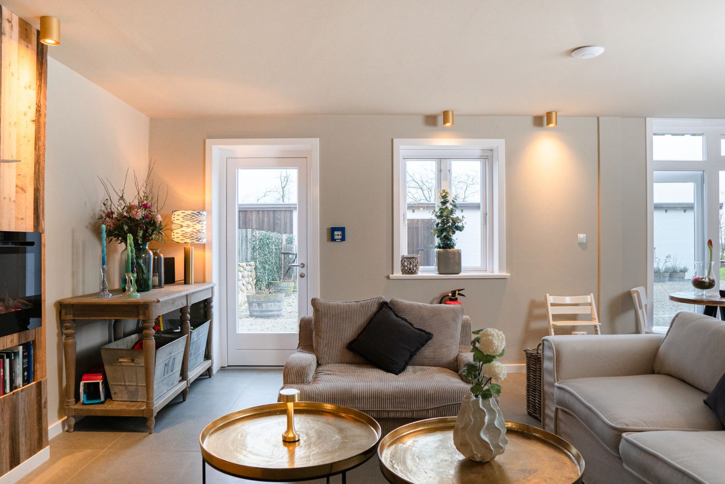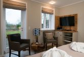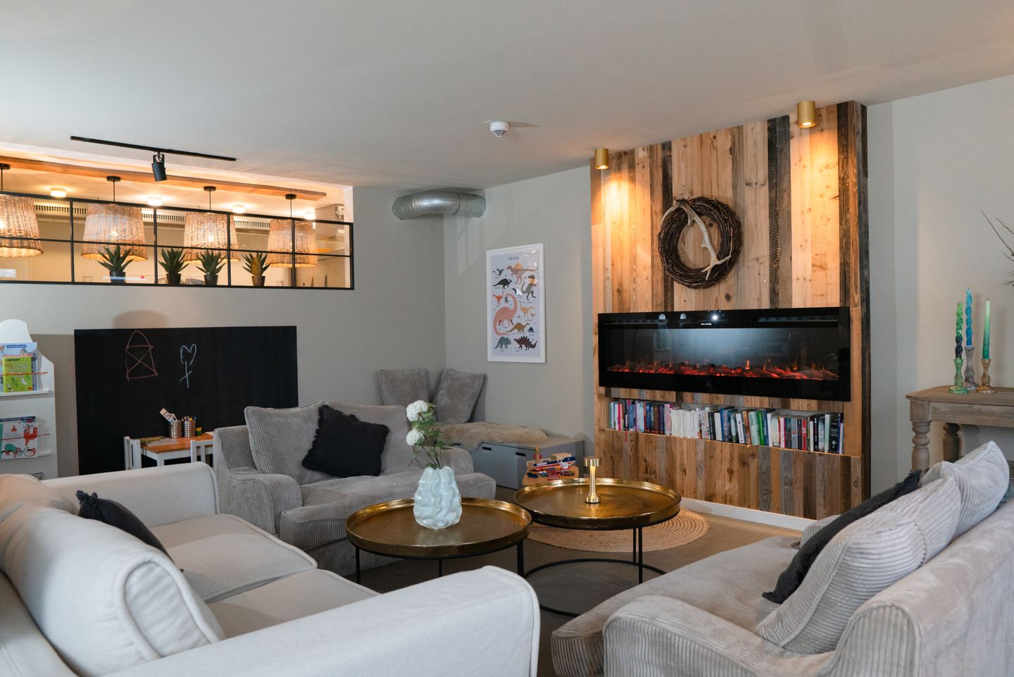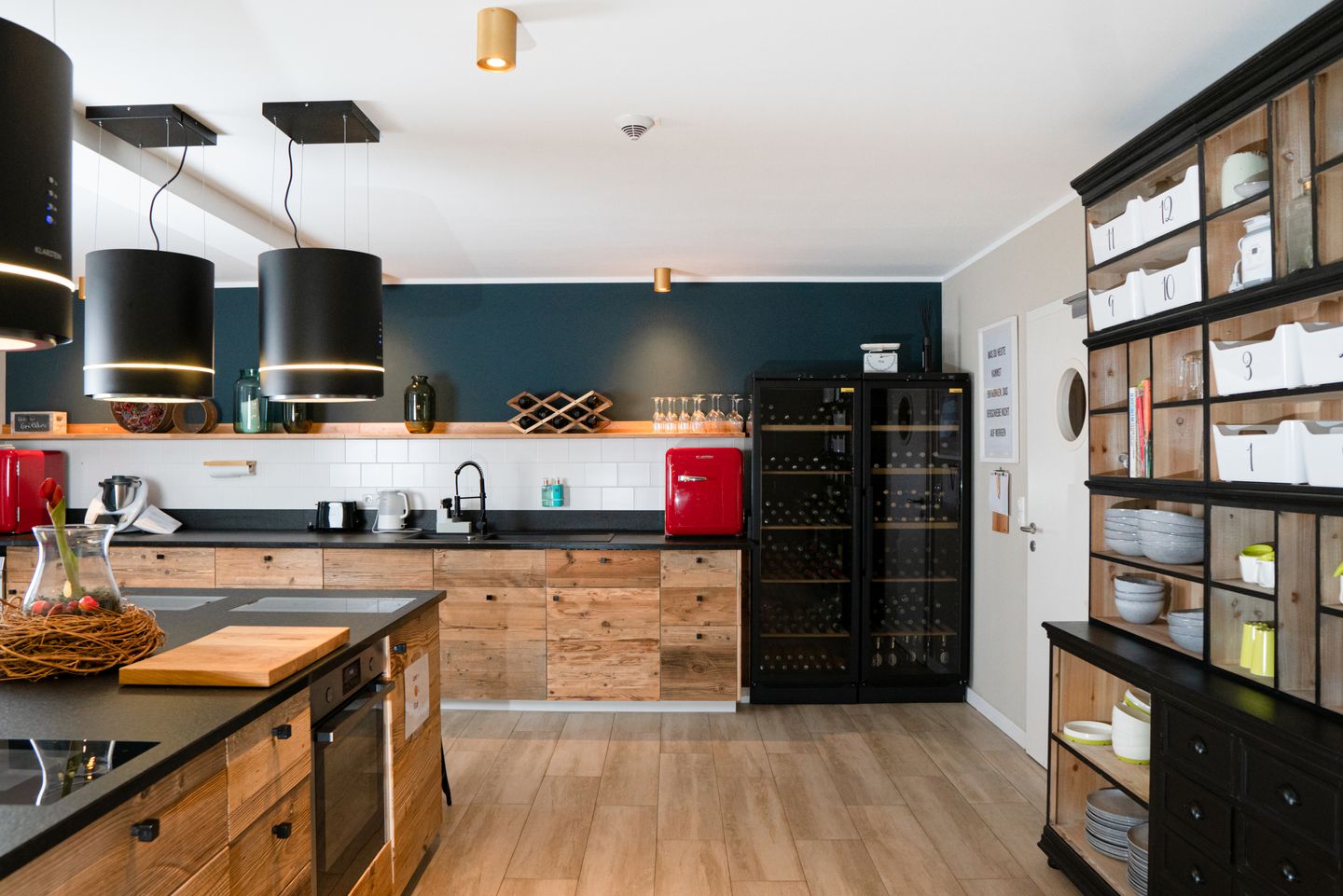 Zu den gemeinschaftlich genutzten Räumen der Ferienanlage zählen der Lounge-Bereich mit eigenem Kamin und die großzügige, hochwertig ausgestattete Küche mit 4 Kochstationen, 2 Backöfen, einem Thermomix sowie einem Geschirrspüler.