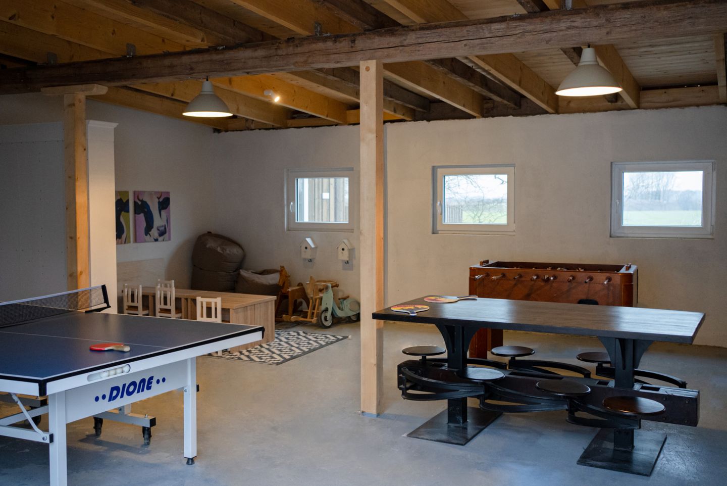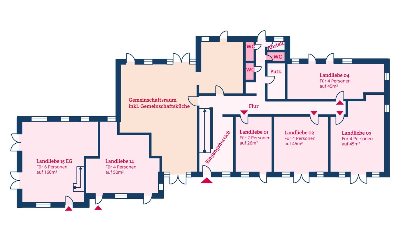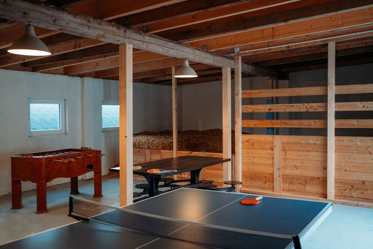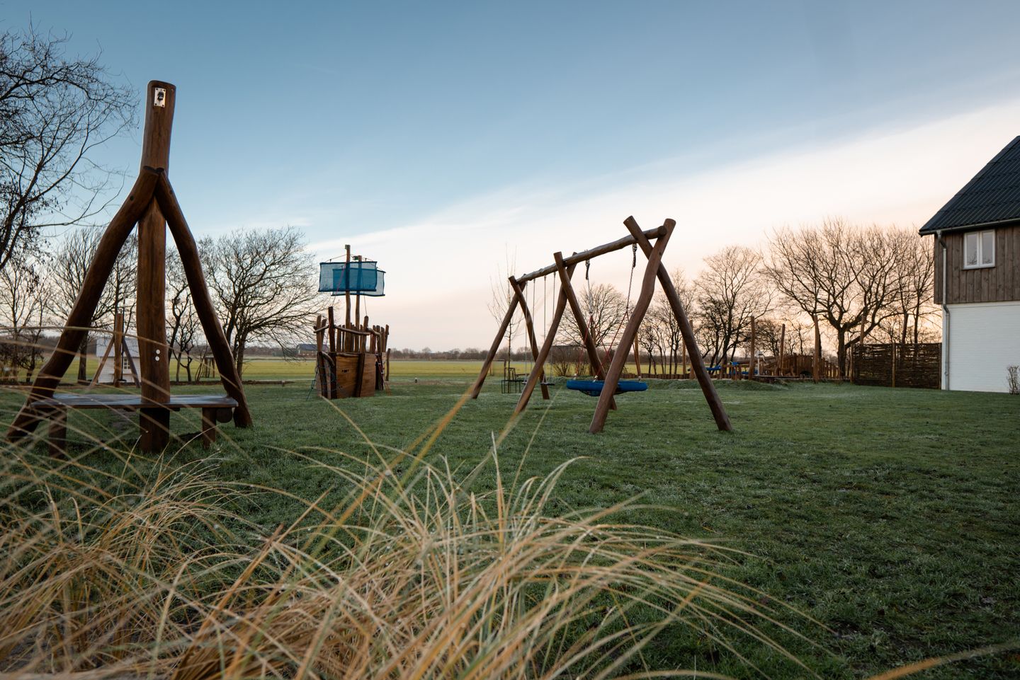 Der groß angelegte Spielplatz auf dem Grundstück ist eine Wohlfühloase für Ihre Kinder - von Seilbahn und Schaukel über ein Basketballfeld bis Trampolin gibt es viele Möglichkeiten zum Austoben. Der Spielplatz steht ausschließlich den Gästen der Ferienanlage Landliebe zur Verfügung. Bei schlechtem Wetter erheitern Tischtennis und Kicker sowie eine Ecke zum Spielen und Toben die Gemüter. In einem vom restlichen Garten abgetrennten Bereich lädt die Fass-Sauna mit Ruheraum und Außendusche zum Relaxen in Strand-Ambiente ein - Erholung pur! Der große Parkplatz mit E-Auto-Ladestation auf dem Grundstück rundet das Angebot ab.