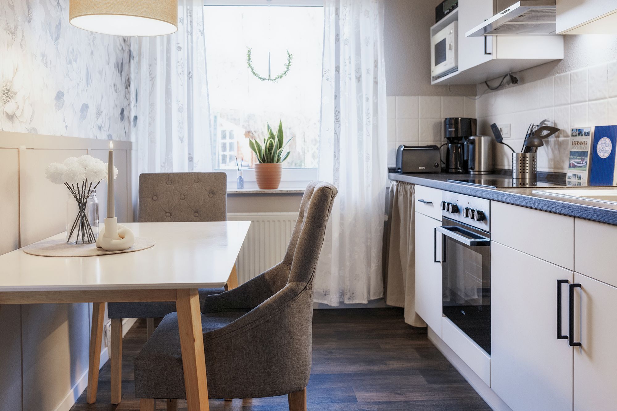 mit Stühlen, Herd mit Backofen, Mikrowelle, Kaffeemaschine, Wasserkocher,