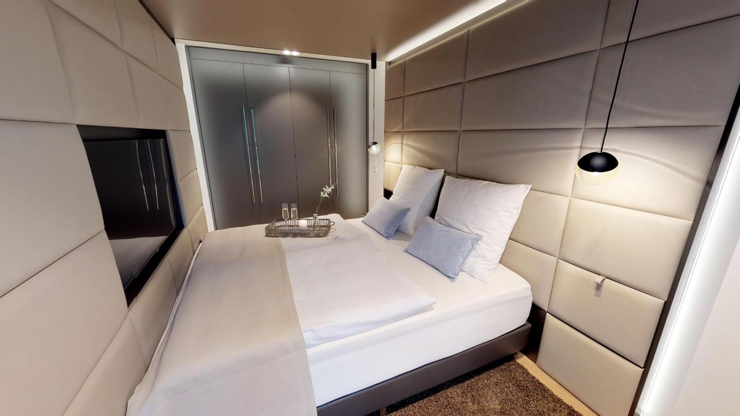 Sie erwartet eine gut ausgestattete Küchenzeile mit einer Essecke im Wohnbereich. Der offene Wohn- und Essbereich wird durch zwei gemütliche Sessel abgerundet. Das separate Schlafzimmer verfügt über ein Boxspring-Doppelbett, das durch Lamellen-Schiebetüren abgetrennt werden kann. Darüber hinaus gibt es ein modernes Badezimmer mit Dusche.