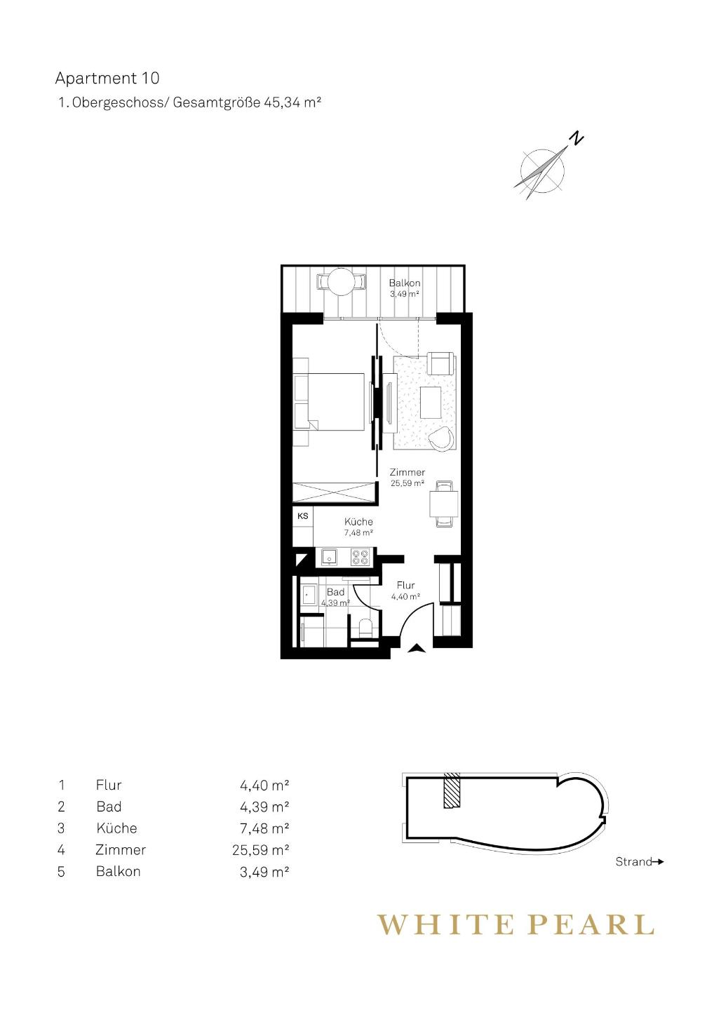 Nur wenige Gehminuten vom Strand entfernt befindet sich das Luxusapartment 1.10 im ersten Obergeschoss des White Pearl, das auf 45 m² Platz für 2 Personen bietet – auch Ihr Hund ist willkommen!
