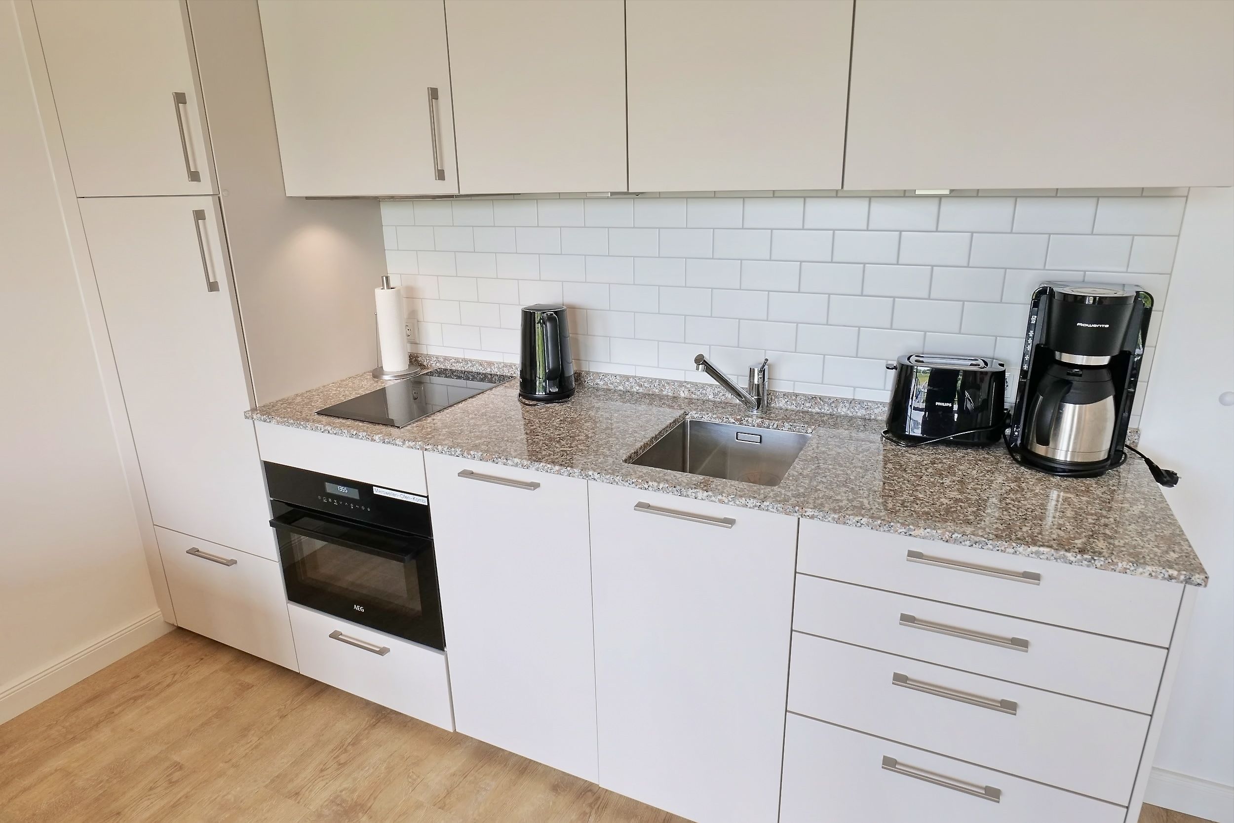 Das Appartement ist modern und individuell eingerichtet. Ein kombinierter Wohn- und Essbereich mit einer integrierten und voll ausgestatteter Küchenzeile, ein Bad, sowie ein separates Schlafzimmer bieten Platz für bis zu 4 Personen. Der Westbalkon in der 1. Etage des Gebäudes lädt am Abend zu einem Glas kühlen Weißwein in der untergehenden Sonne ein.