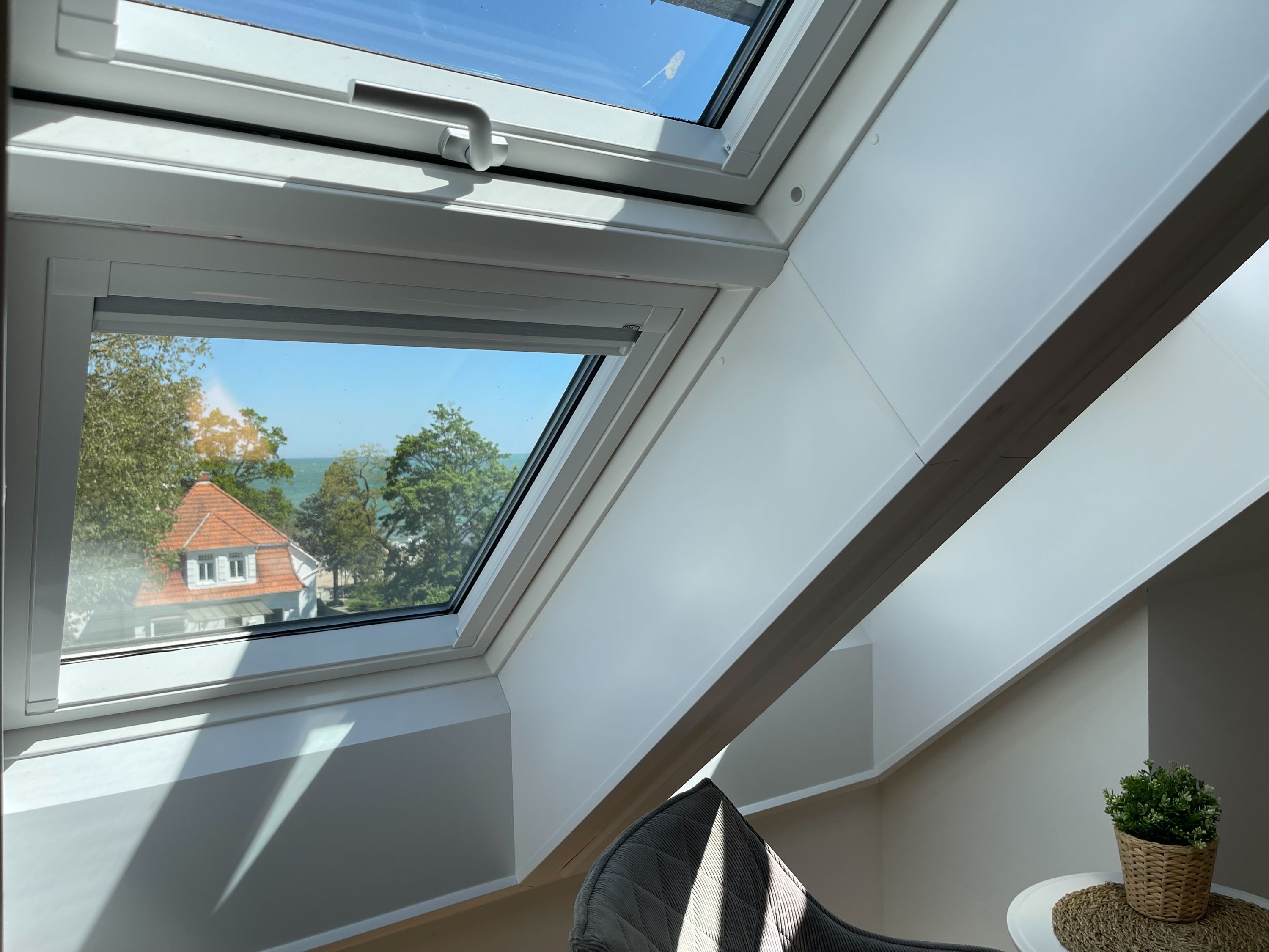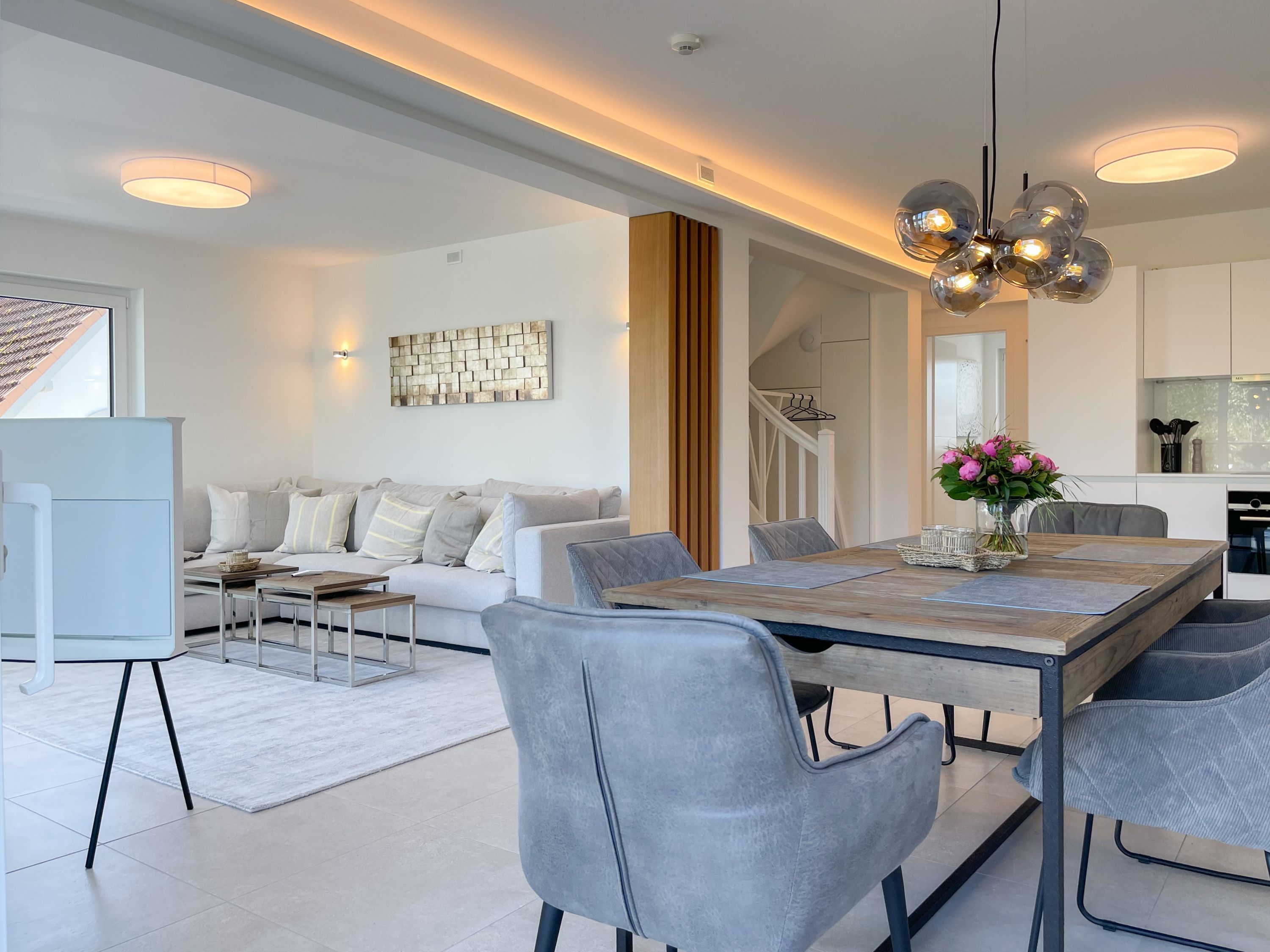 Das traumhafte Penthouse erstreckt sich über zwei großzügige Wohnebenen und bietet herrliche Ausblicke bis auf die Ostsee. Mit drei Schlafzimmern, zwei Bädern und einem separaten Gäste WC, ist es perfekt für sechs Personen geeignet, um einen entspannten Ostseeurlaub in absoluter Strandnähe zu verleben. Die geschmackvolle Einrichtung und hochwertige Ausstattung sorgt für höchsten Wohnstandard in bester Lage. Unten erwartet Sie ein lichtdurchfluteter Wohnbereich mit einem XL-Sofa; TV, Radio und WLAN sind selbstverständlich vorhanden. Die umlaufende Dachterrasse in Richtung Ost und Süd lockt mit traumhaftem Blick und frischer Seeluft ins Freie. Der großzügige Essbereich bietet ausreichend Raum für gemeinsame Mahlzeiten, Spieleabende oder gemütliches Beisammensein. Küche, Gäste WC und Bad 1 mit großer Walk In Dusche, Badewanne, Waschtisch Handtuchtrockner und Fenster befinden sich ebenfalls auf der unteren Wohnebene. Die Infrarotsauna, hervorragende Wirkung gegen Verspannungen und zur Entschlackung, befindet sich in einem hellen, abgeschlossen Raum, der über das Bad 1 zu erreichen ist. Auf der oberen Wohnebene gibt es drei Schlafzimmer, alle mit Boxspringbetten, Einbauschränken, Verdunkelungsplisses und TV eingerichtet sowie das 2. Bad, ebenfalls mit Walk In Dusche, Waschtisch und WC. In einem Schlafzimmer befindet sich zusätzlich ein Schreibtisch für das Homeoffice mit herrlichem Ostseeblick.