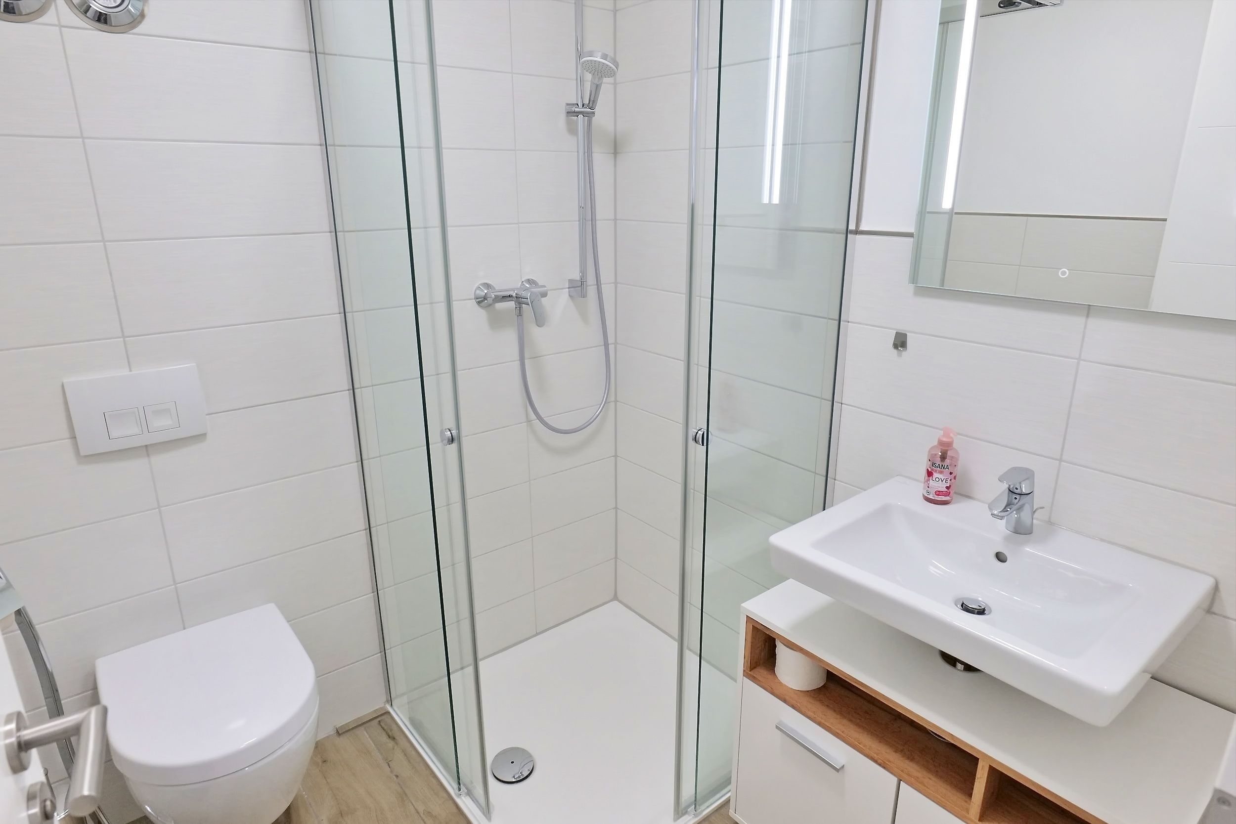 Ihr Ferientag beginnt in einem modernen Bad mit bodentiefer Dusche, Waschtisch, Handtuchheizung und WC. Gegen Gebühr können Waschmaschine und Wäschetrockner gemeinschaftlich im Haus benutzt werden.