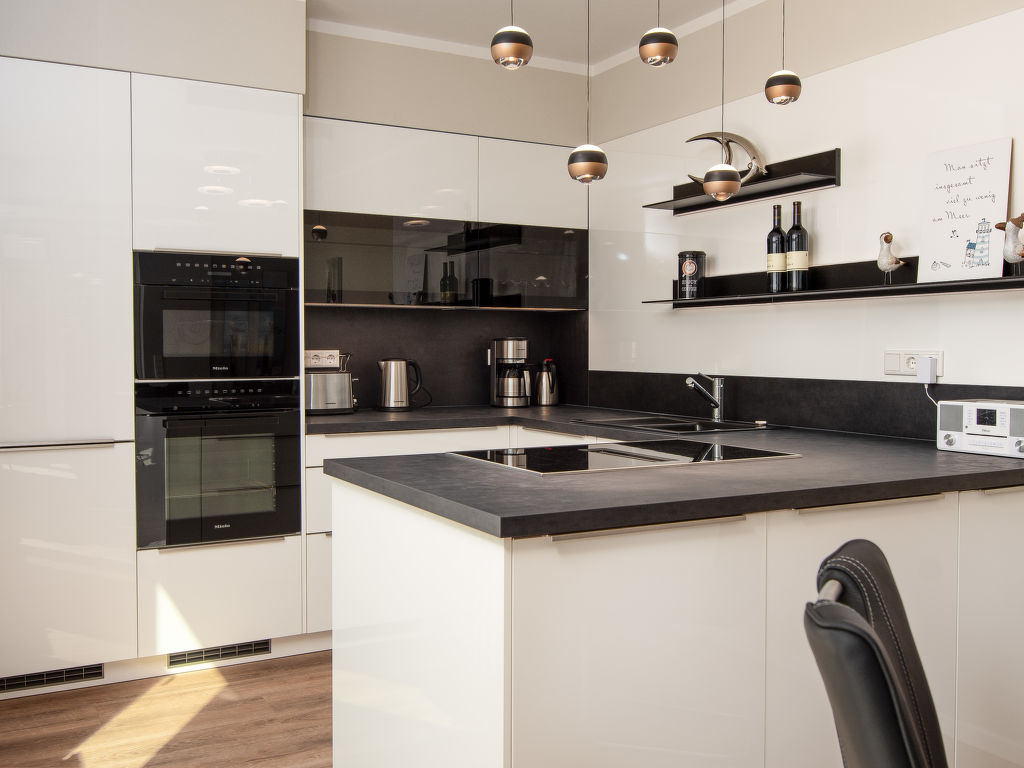 4-Zimmer-Wohnung 96 m2 im 1. Stock. Sehr komfortabel und luxuriös eingerichtet: Wohn-/Esszimmer mit Kabel-TV (Flachbildschirm), Stereoanlage. Ausgang zum Balkon. 2 Doppelzimmer, jedes Zimmer mit Kabel-TV (Flachbildschirm), elektrischem Rollladen. 1 Zimmer mit 1 Bett, Kabel-TV und elektrischem Rollladen. Offene Küche (Backofen, Geschirrspüler, 4 Induktionskochplatten, Toaster, Wasserkocher, Mikrowelle, Tiefkühler, elektrische Kaffeemaschine). 2 Duschen/WC. Fussbodenheizung. Balkon. Balkonmöbel, Abstellkammer. Herrliche Sicht auf den Kanal. Zur Verfügung: Waschmaschine, Wäschetrockner, Bügeleisen, Kinderhochstuhl, Haartrockner, Wickelkommode. Internet (Wireless LAN). Bitte beachten: Nichtraucher-Unterkunft. Rauchmelder. Der Balkon mit Aussicht auf das Norder Tief verfügt über eine Markise.