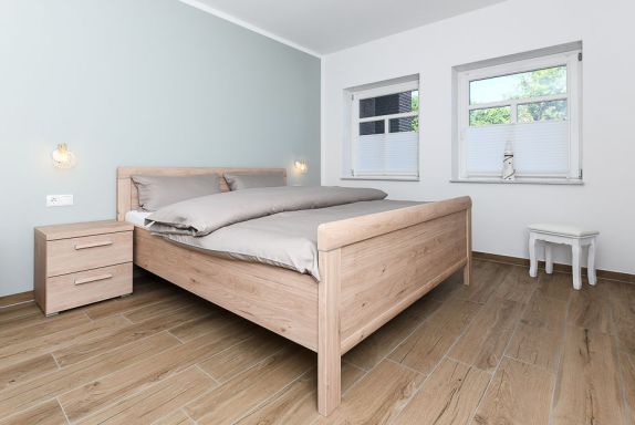 Neue, hochwertig eingerichtete Ferienwohnung im Erdgeschoss für 2 - 3 Personen mit einem Schlafraum (1 Doppelbett, 1 Einzelbett), einem Wohnraum mit integrierter Küchenzeile und einem großen Bad sowie einem Abstellraum mit begehbarem Kleiderschrank. Vor der Wohnung befindet sich eine schöne Terrasse.