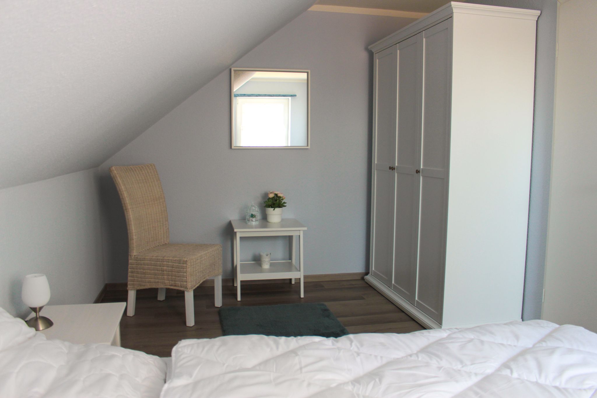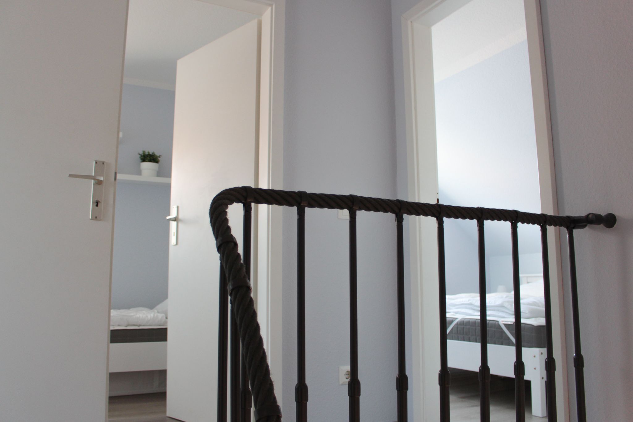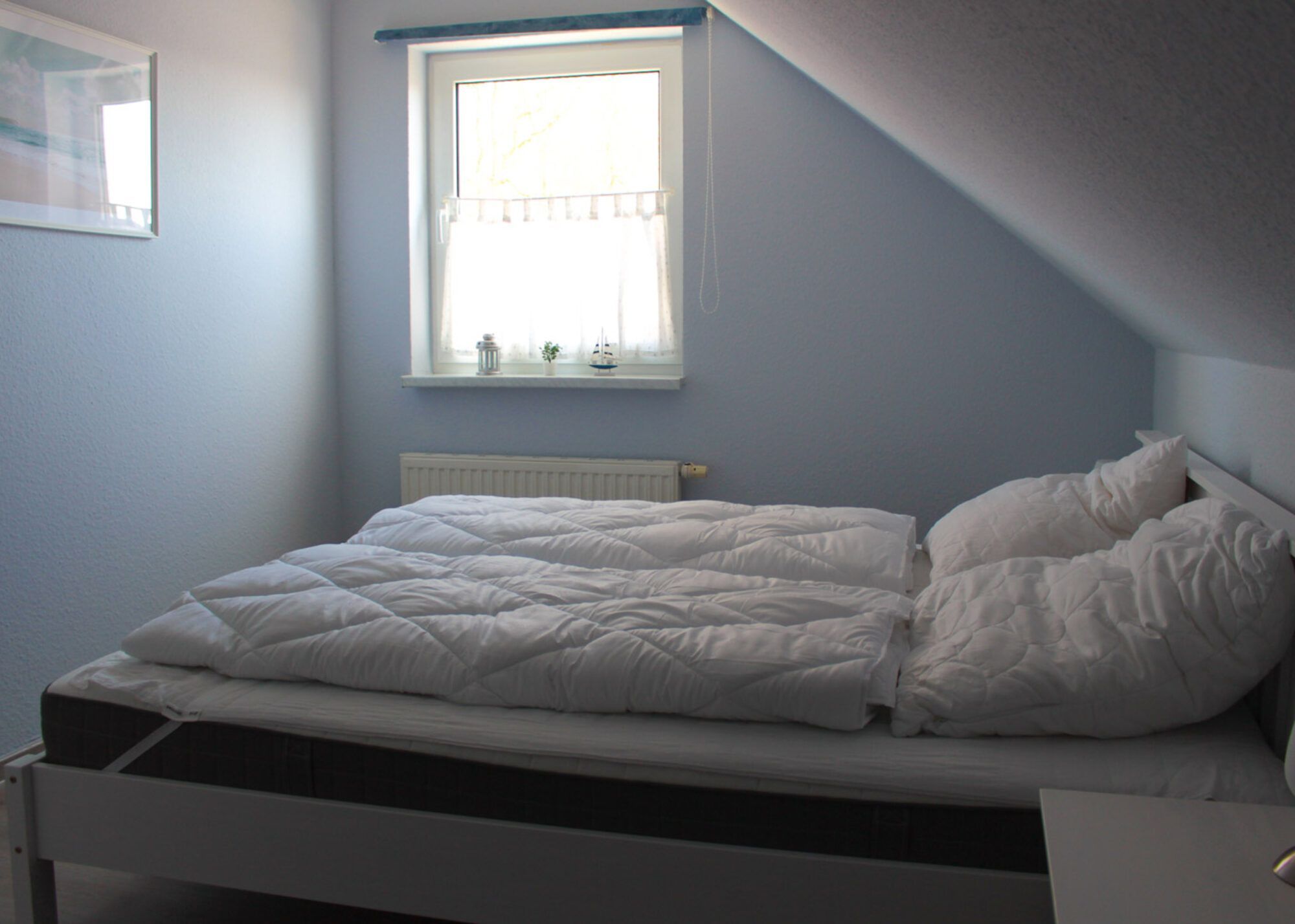 In dem Ferienhaus Ferienglück, gibt es zwei Schlafzimmer mit einem Doppelbett ( 180x200 cm) und zwei Einzelbetten (90x200 cm), im OG befindet sich ein Badezimmer mit Dusche und WC.
