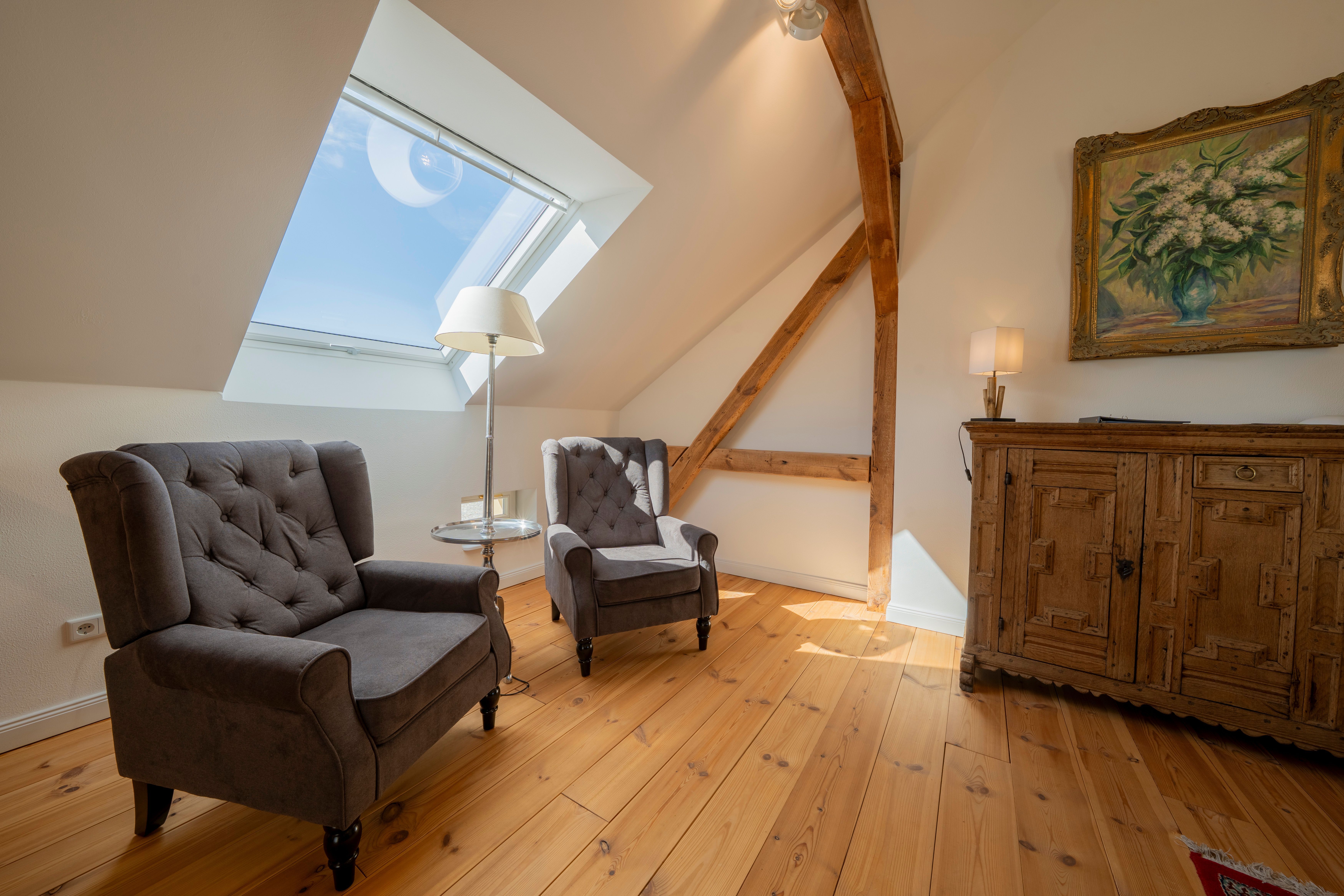 • Charmante Gestaltung: Hohe Decken, lichtdurchflutete Räume und sichtbare Balken schaffen ein einzigartiges Ambiente.